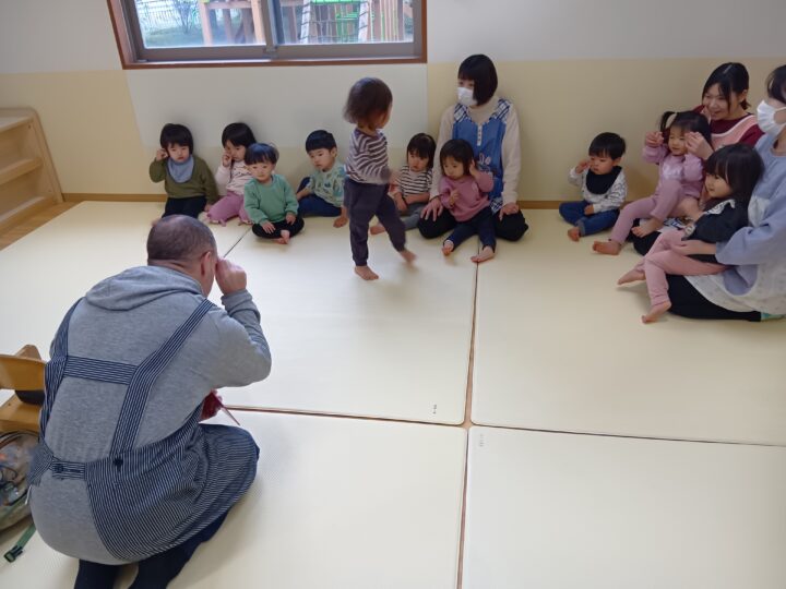 フワフワのマットで保育者と友だちと一緒に飛び跳ねたり