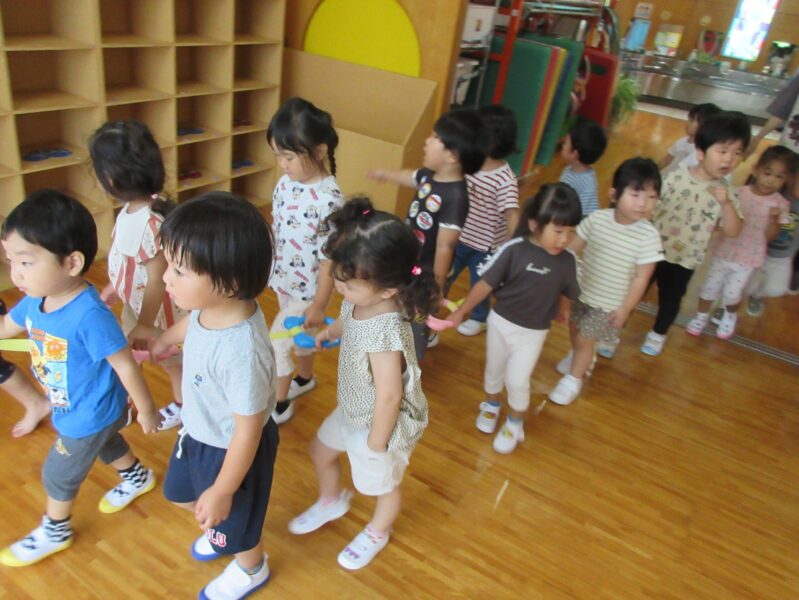 「どしん、どしん」ぞうさんのようにゆっくり歩いてみたり、「ちゅーちゅーちゅー」とネズミさんのように素早く走って見たり、色んなリズムで身体を動かす遊びでした。