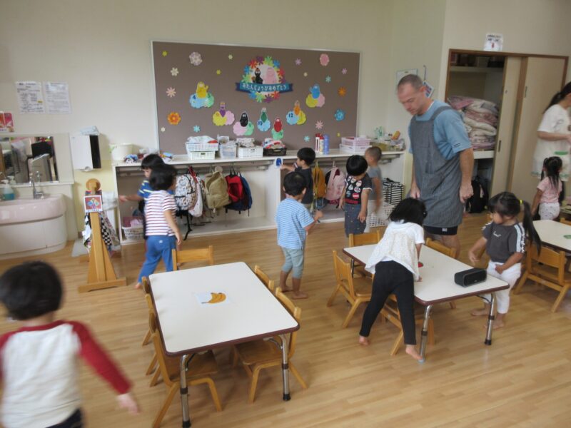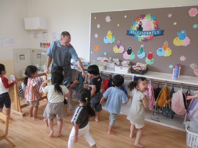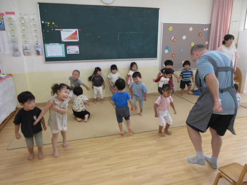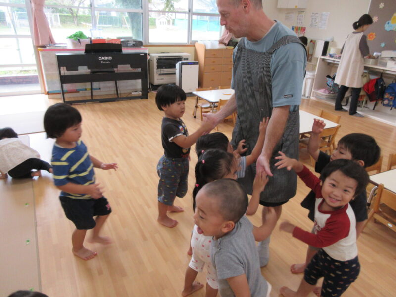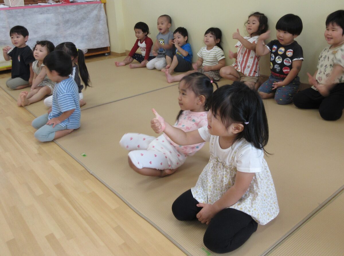 英語の歌に合わせて身体を動かしたり手を動かしたり、「イェーイ!」とノリノリで楽しんでいることり組さんです。