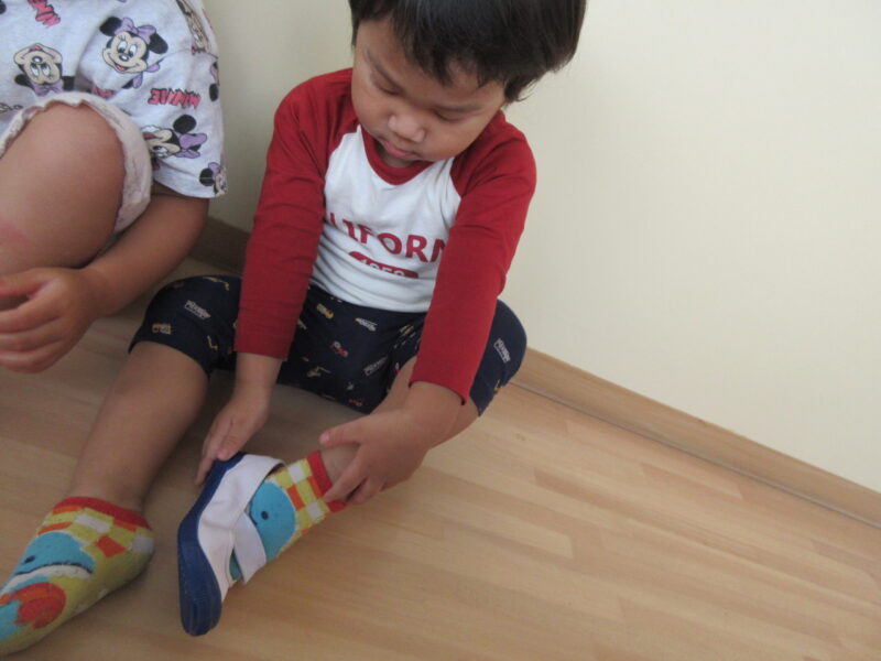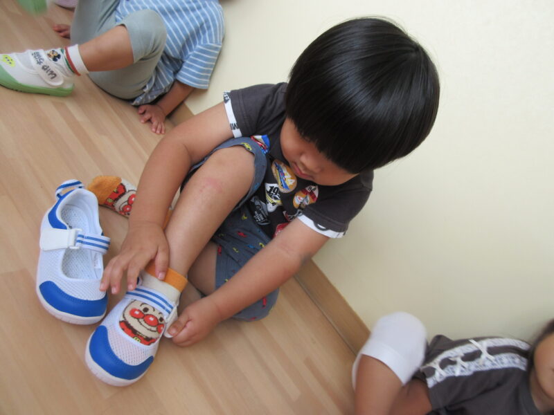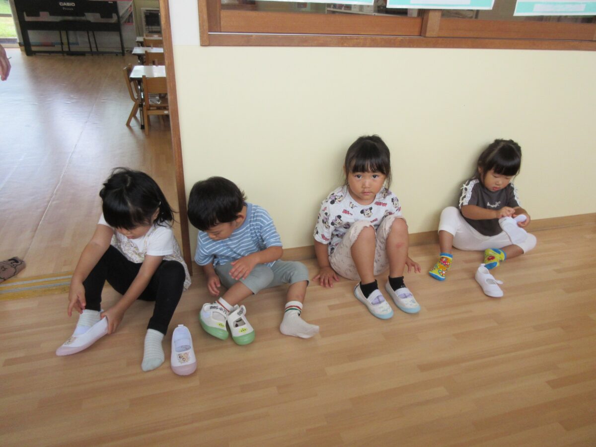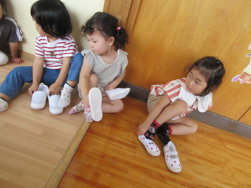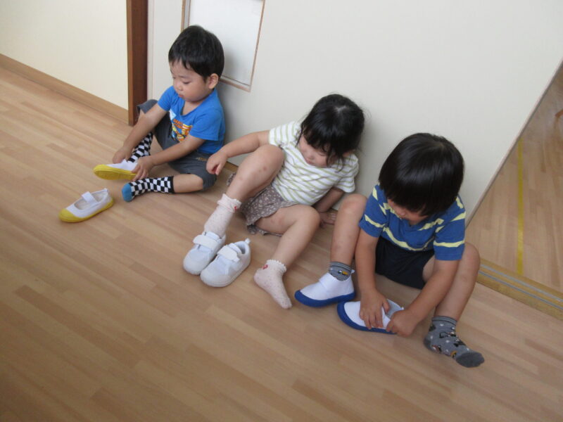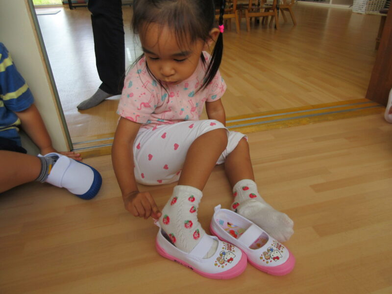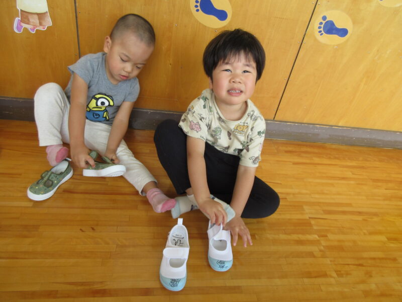まだスムーズに履けなかったり靴が左右違っていたりする姿もありますが、先生たちに手伝ってもらいながらも自分でやってみようと頑張っていますよ。