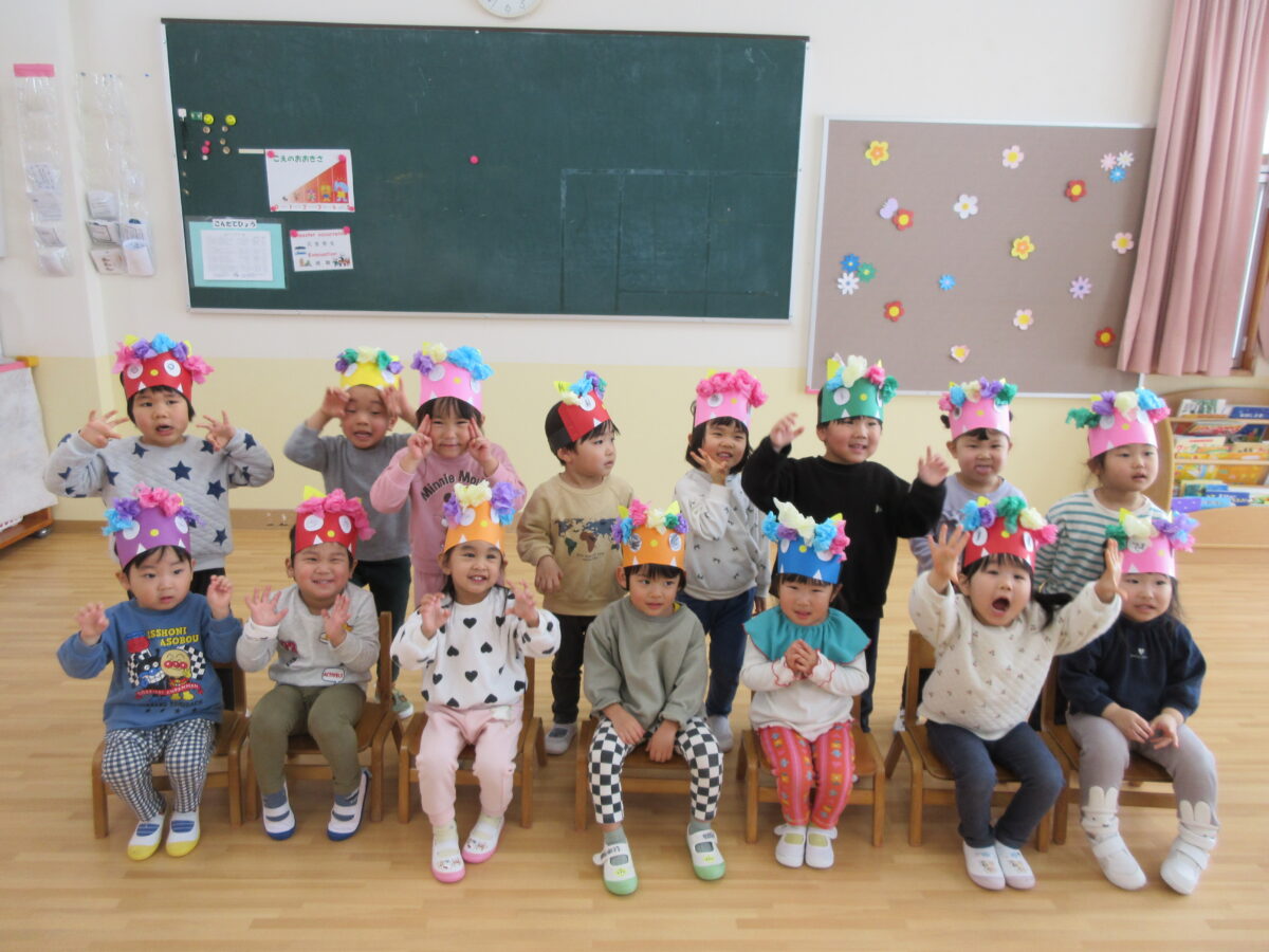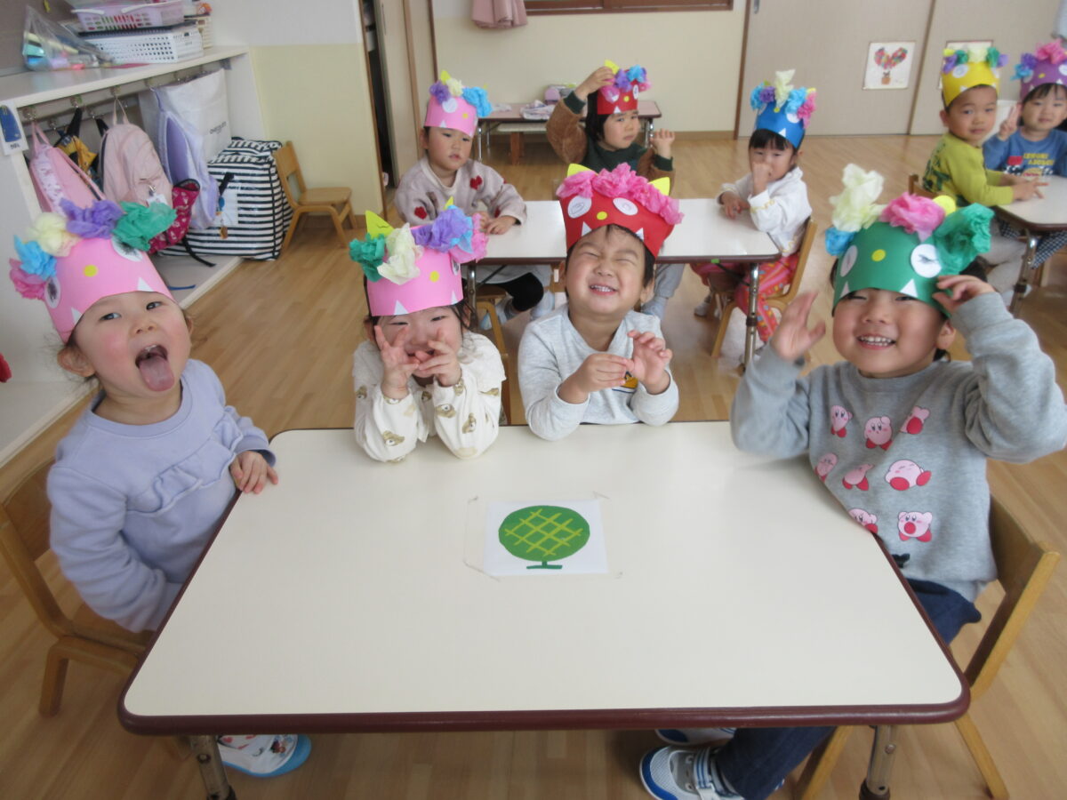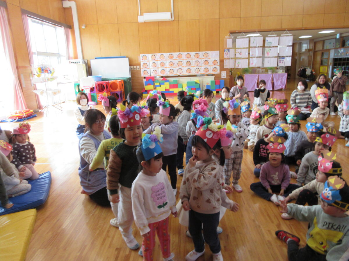 豆まき会に行ってきました。みんなにお面を見てもらって、「豆まき」の歌を歌いました。