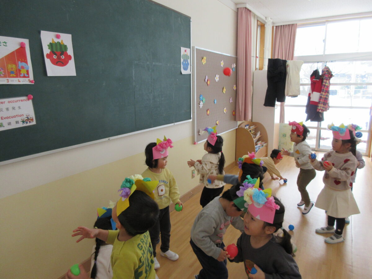 鬼の絵に豆を投げたり、鬼のお面をかぶった保育教諭に豆を投げたりと楽しみました!