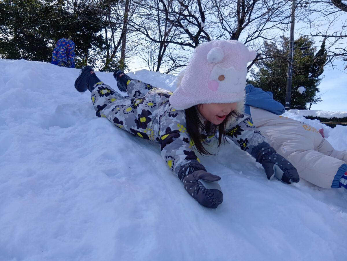 みんなで山の上に登っておしりで滑ってみたり、スーパーマンのように前向きで滑ってみたり☆