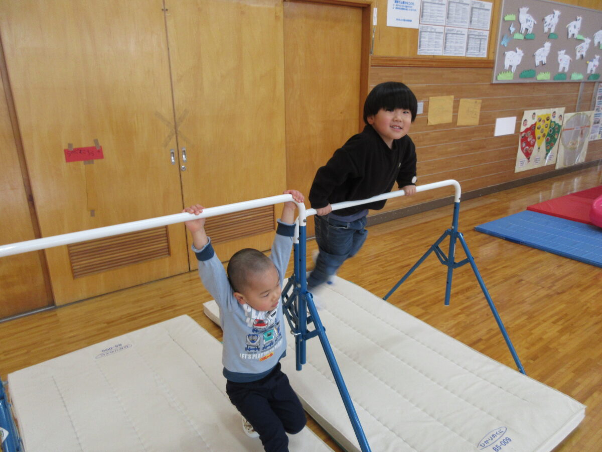 鉄棒も楽しみました!(鉄棒は飛び乗ったり、足抜き回りをしたり、前転をしたりできるようになっています!)