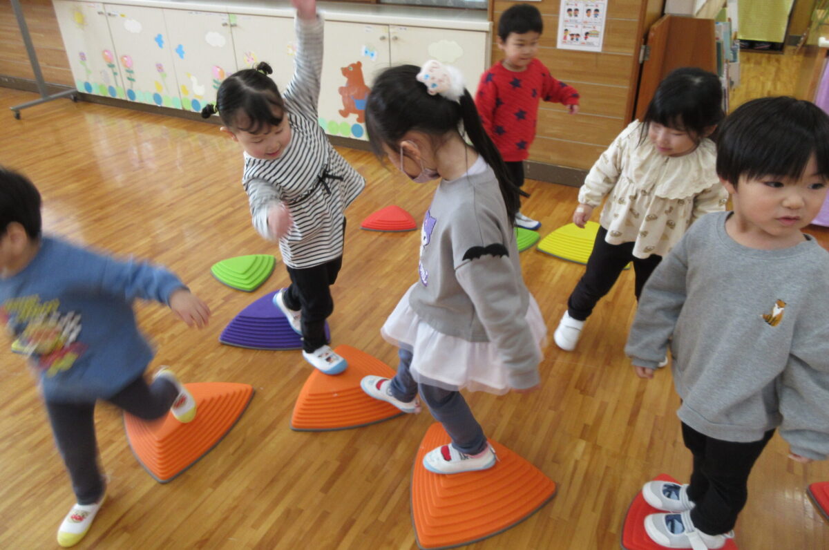 今日はお遊戯室で遊びました。お遊戯室に行く前に「行こう!」と声をかけると、ことりぐみさんは自然に集まってきて、お友だちと手を繋いで移動する準備ができるようになりました!