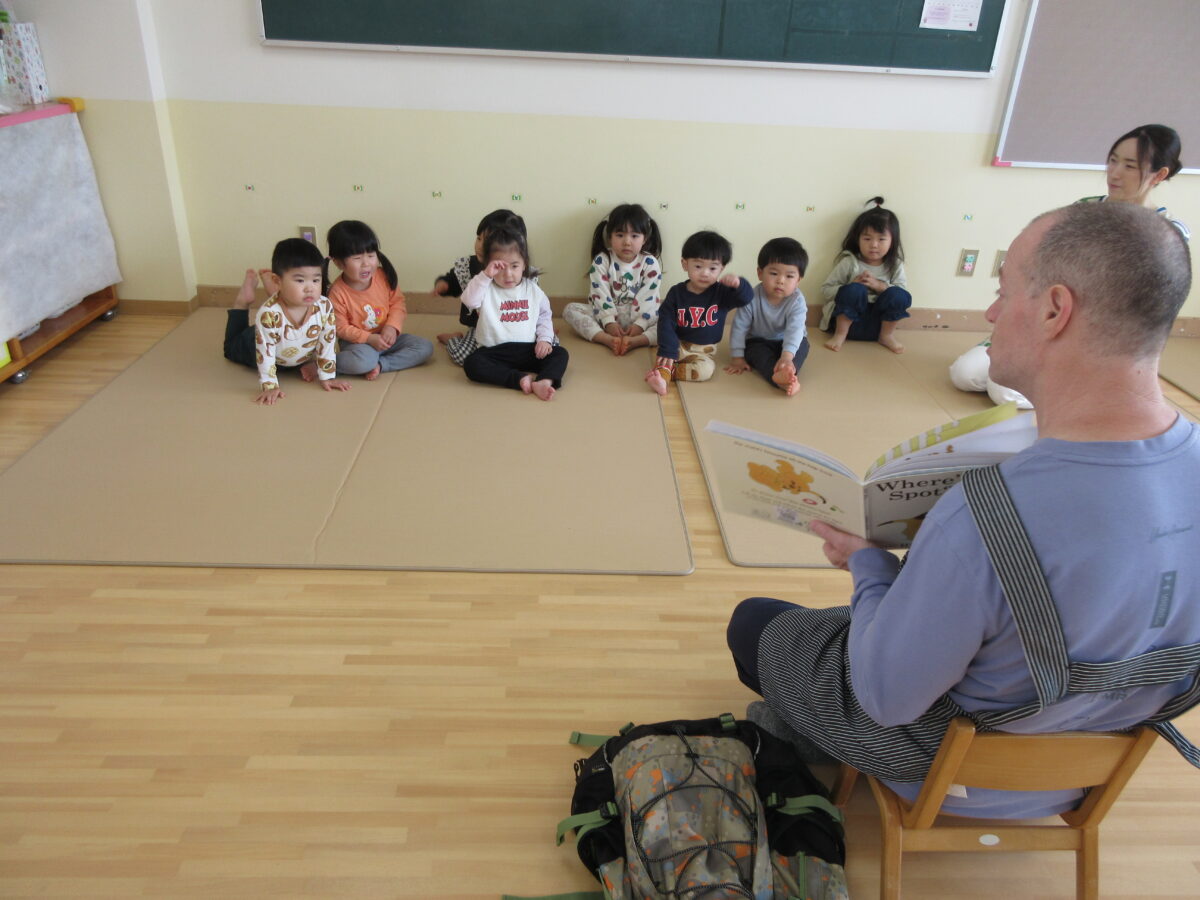 誰かが先生に絵本を読んでもらっているといつの間にかまわりに集まってきます。