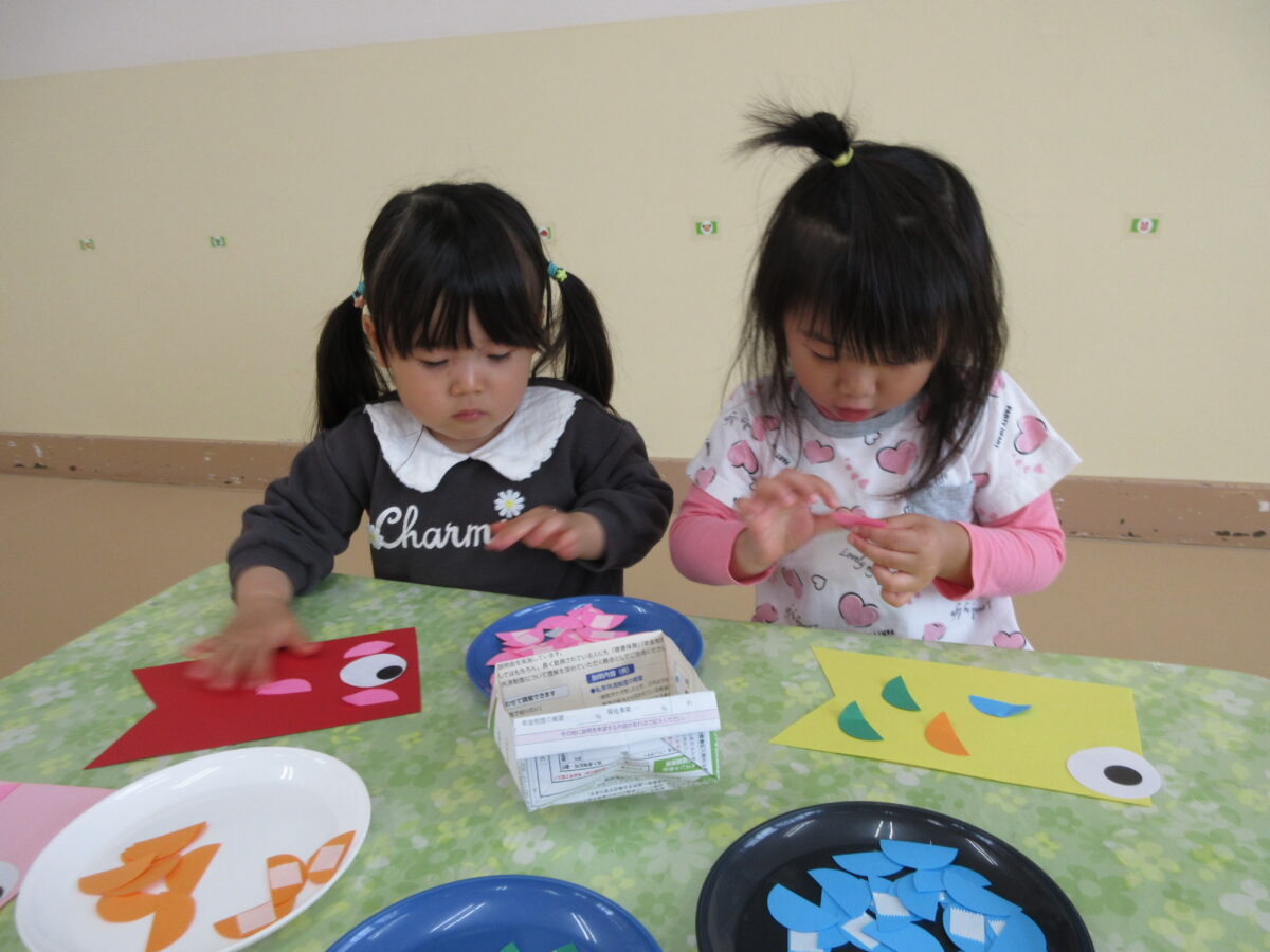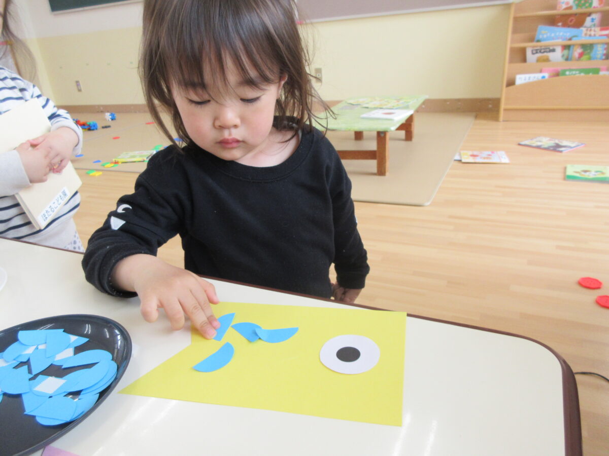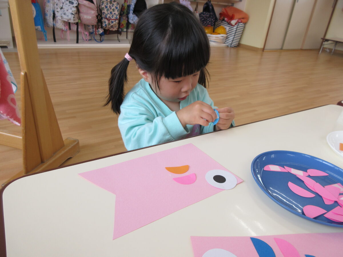こいのぼりの製作をしました。両面テープをはがして、好きなだけうろこを付けていきました。