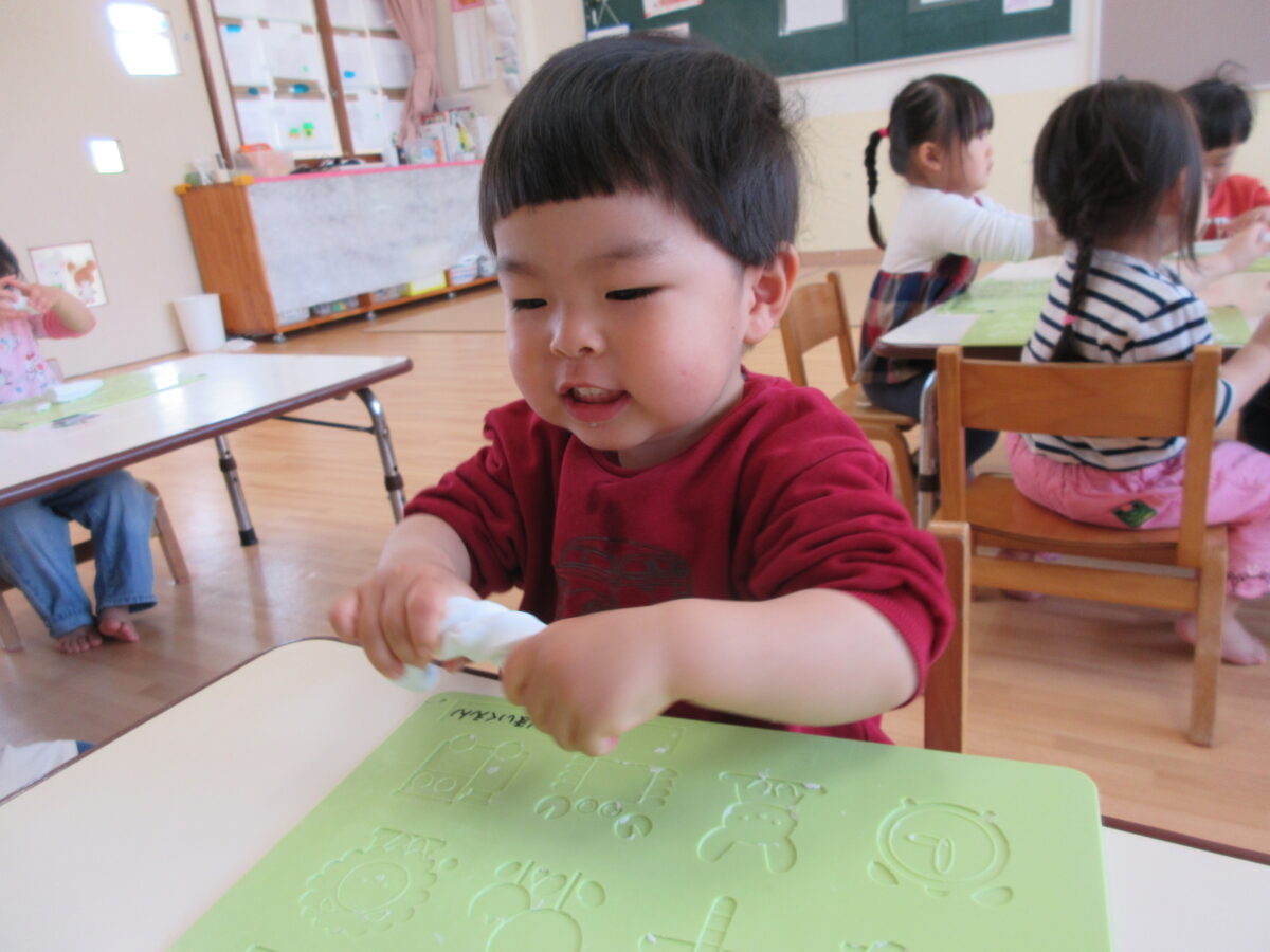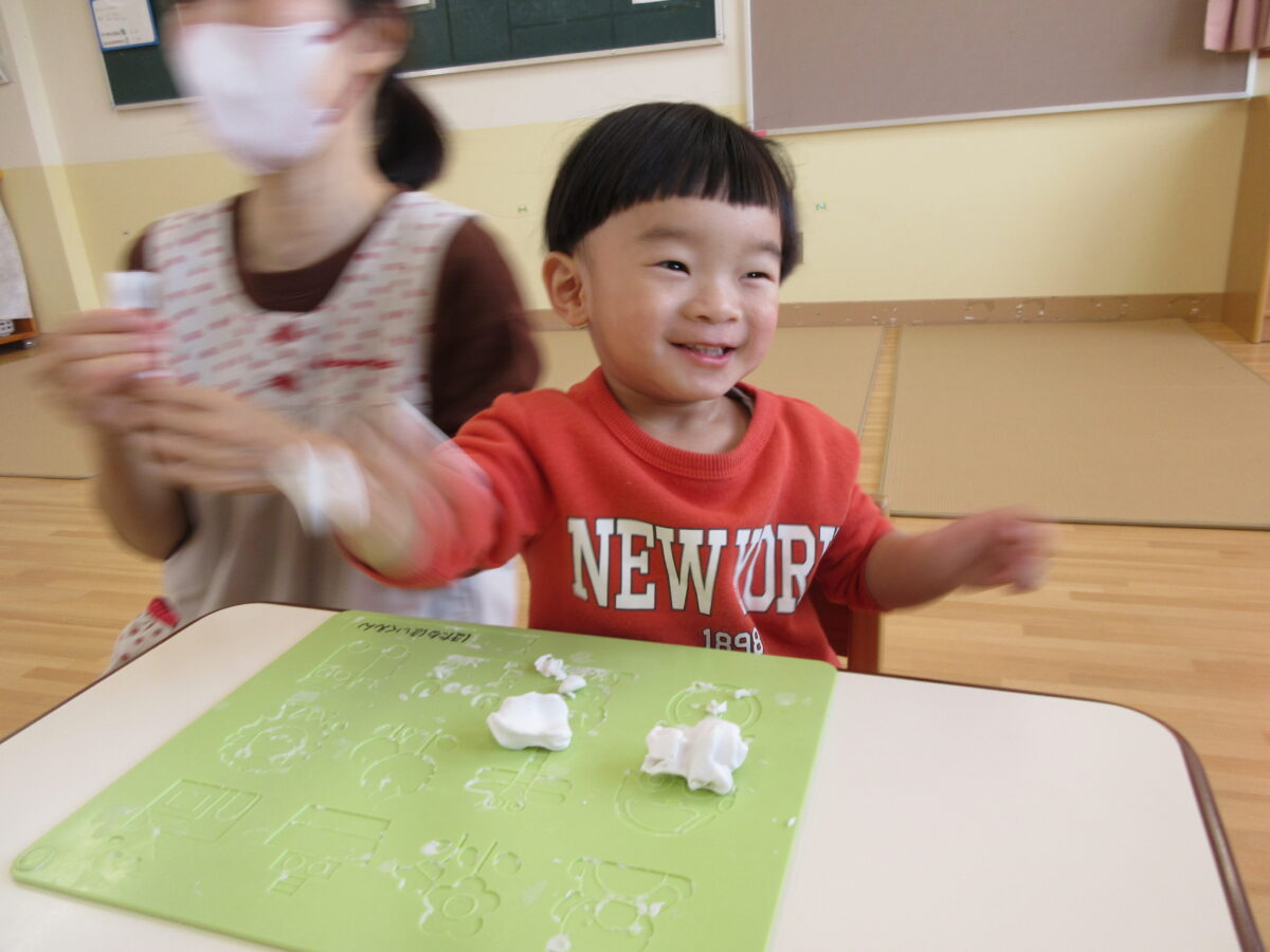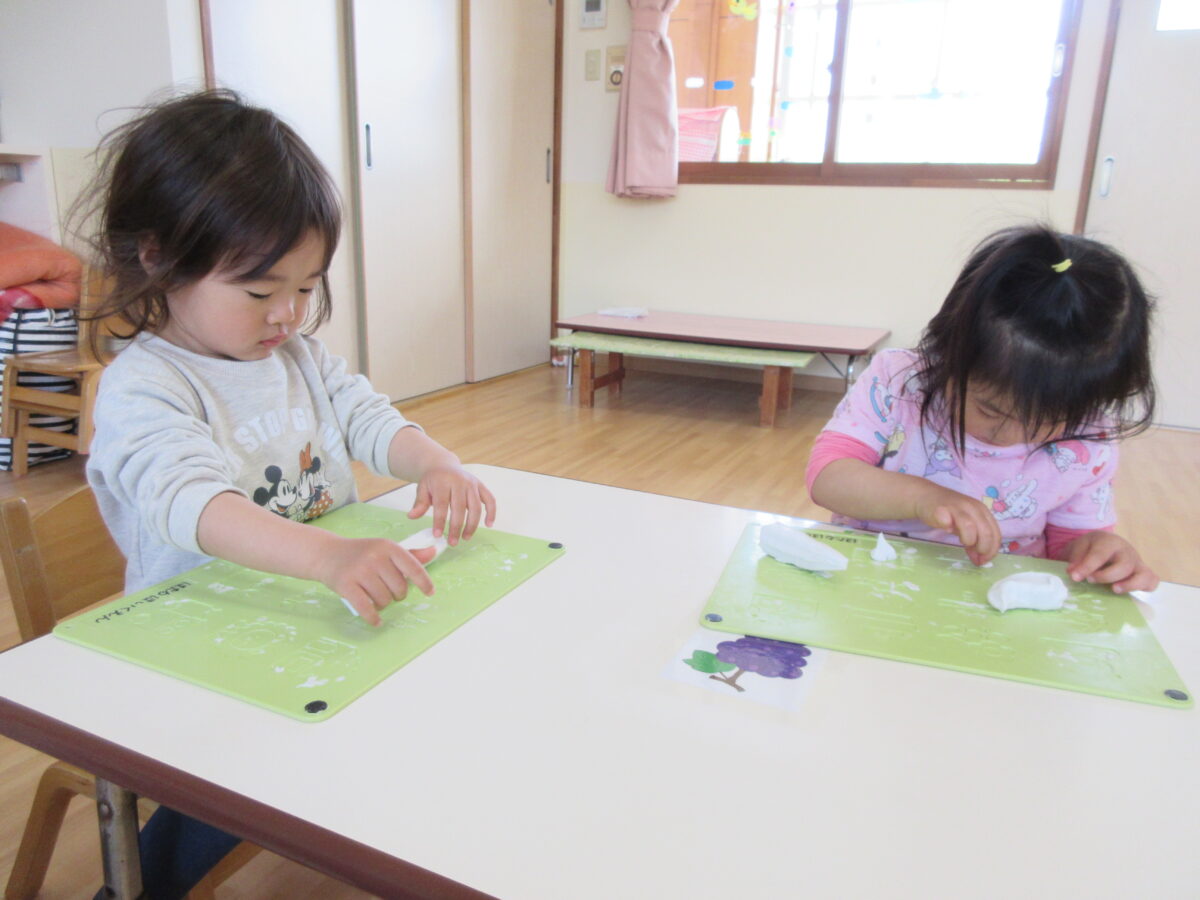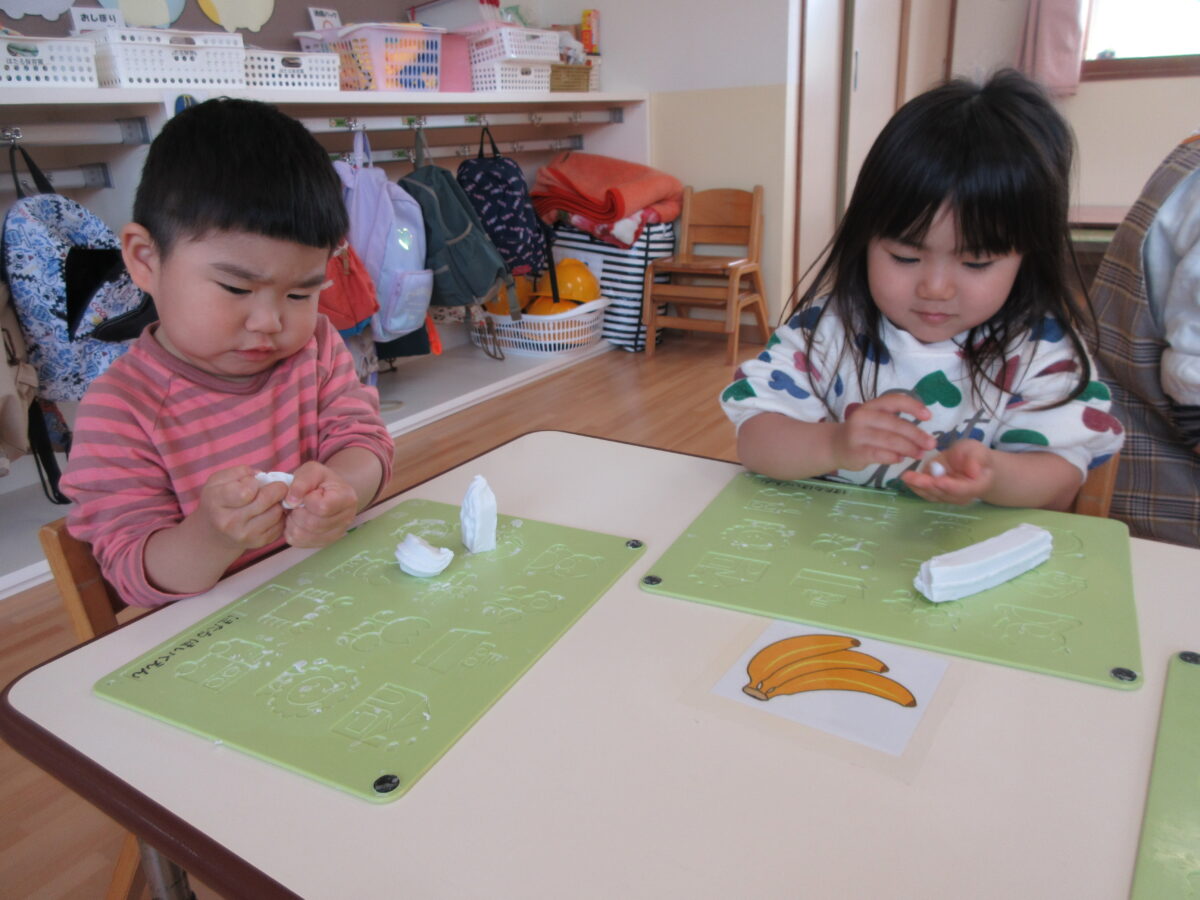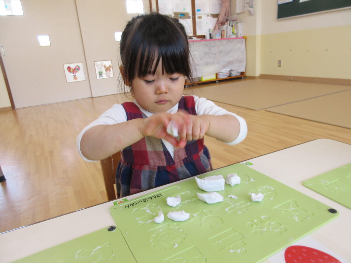 粘土遊びをしました。新しい粘土はまだ固く、手にすると子ども達は「これはなんだ…?」と少し不思議そうにしていました。小さくしてコネコネしていくと柔らかくなり、粘土の感触を楽しんでいました。