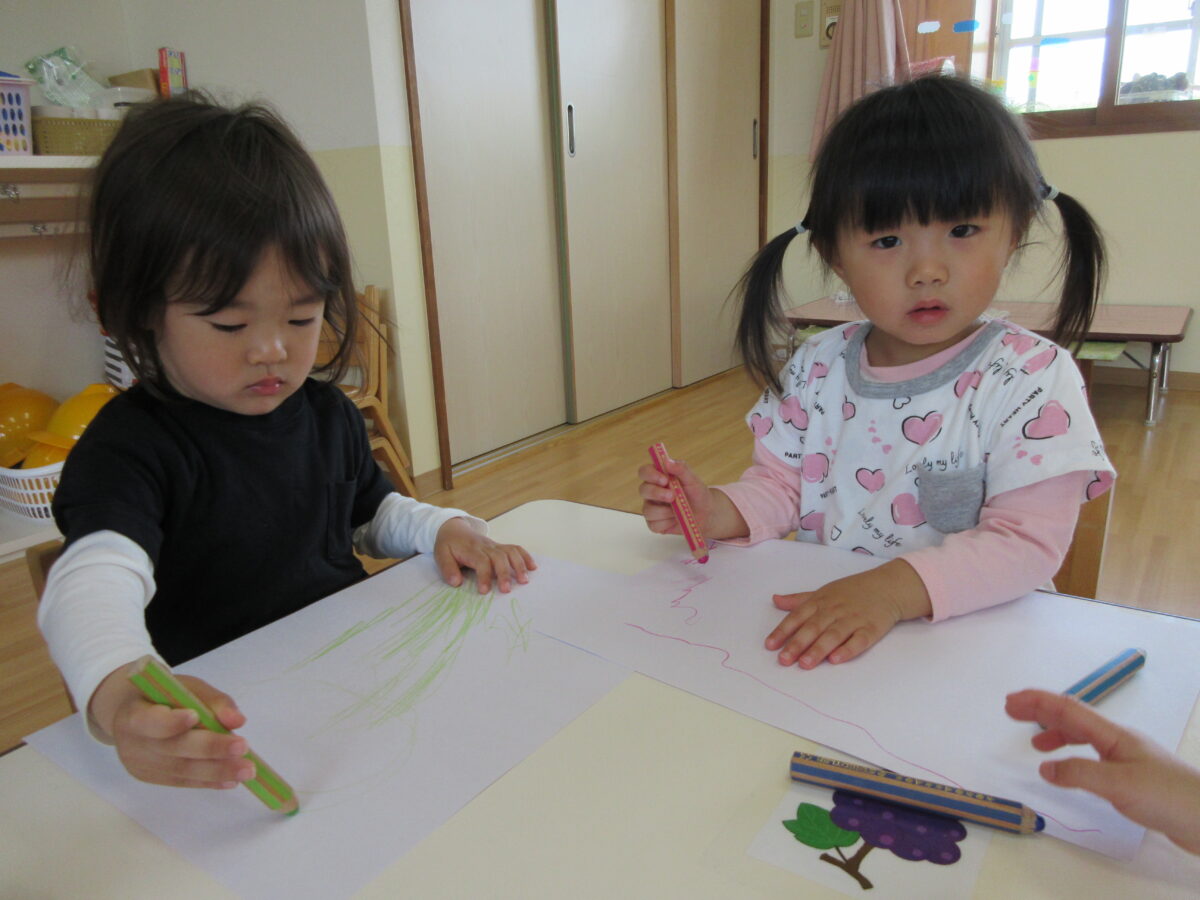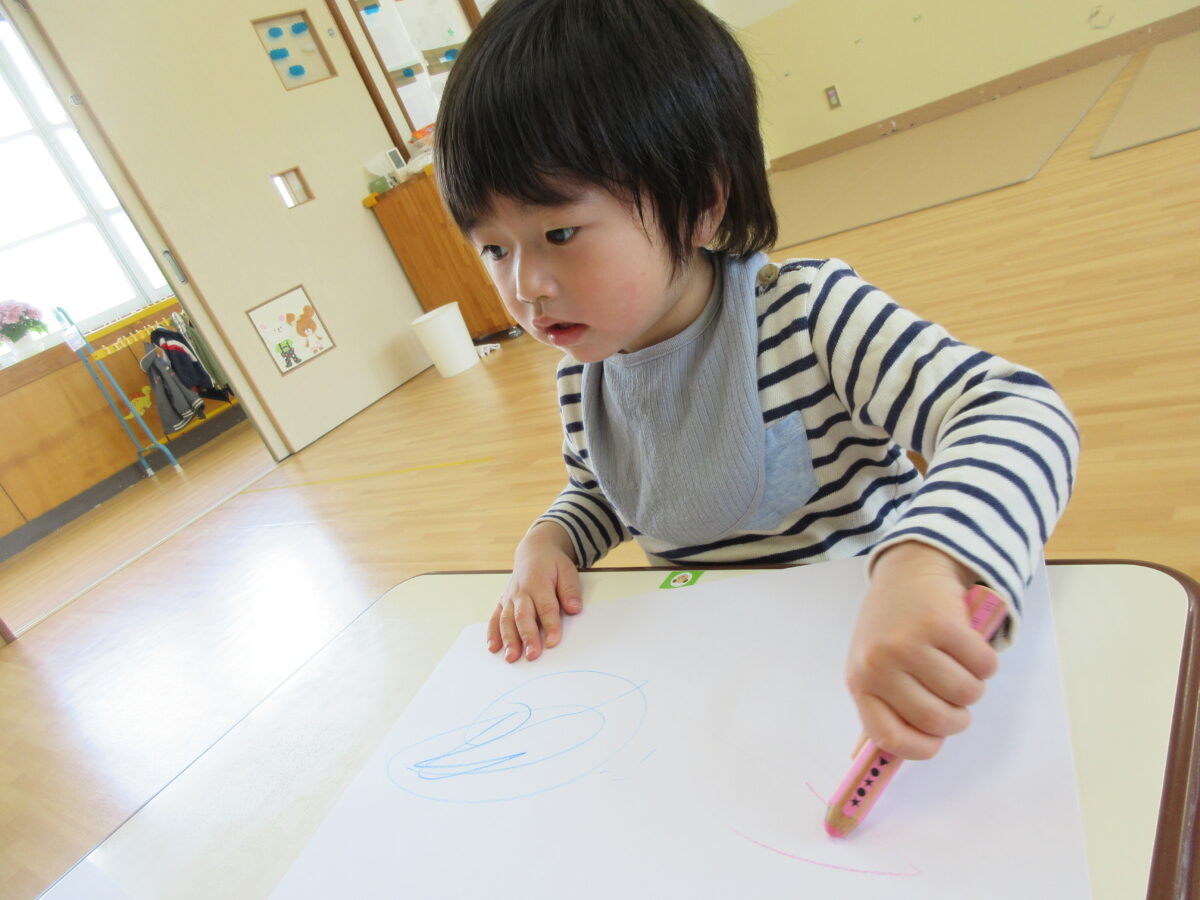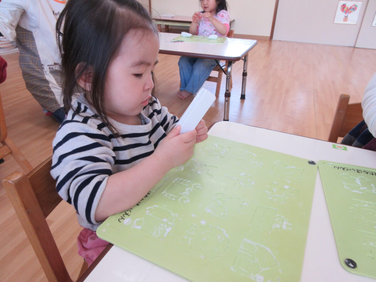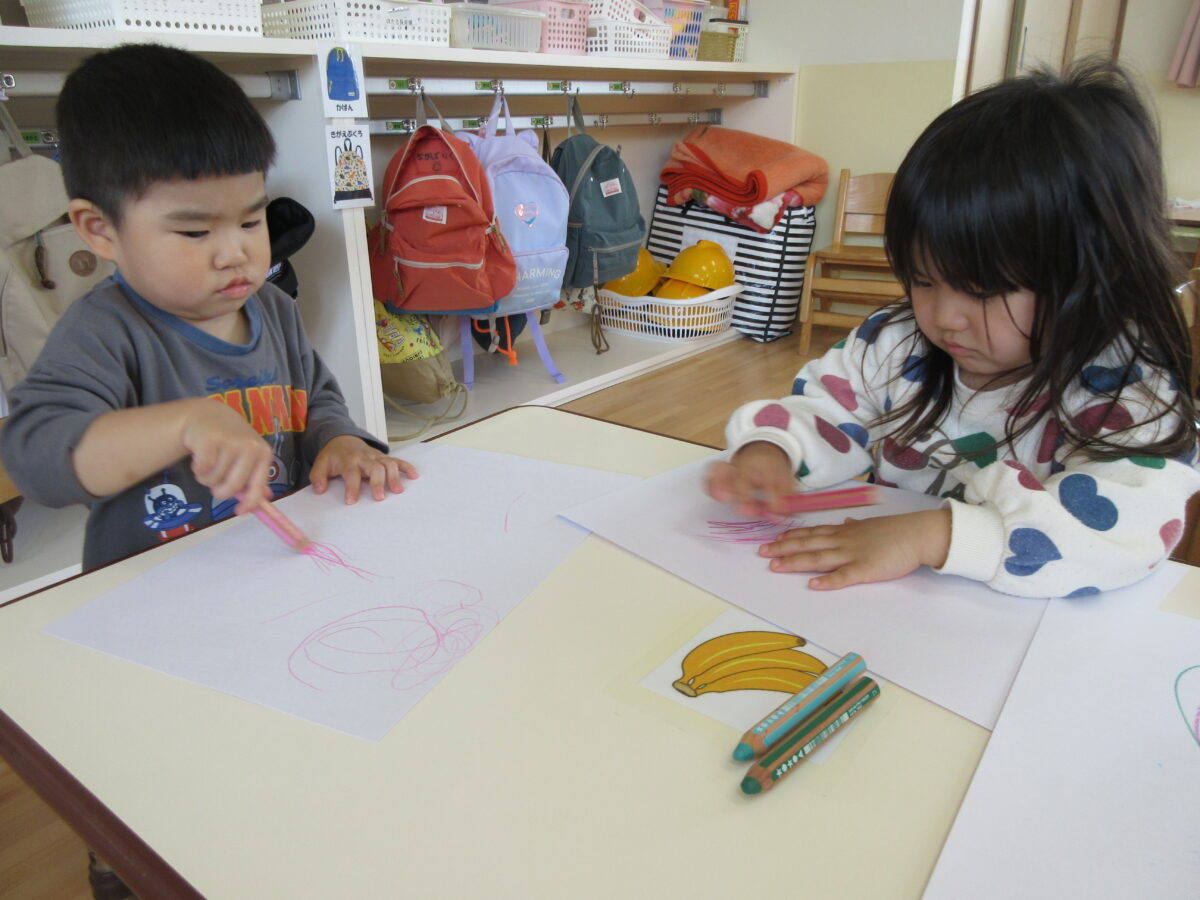 好きな色のクレヨンを持ってグルグル~としたり、トントン!と叩いてみたりしながら発色を楽しみました。とても集中していて、思い思いに表現していましたよ。
