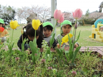 最近一気に暖かくなってきましたね。晴れの日も続いているのでたくさんお外遊びができて子どもたちはとても嬉しそうです♪子どもたちの大好きな虫たちもだんだんと園庭に出てくるようになり今日もたくさんのダンゴムシやアリを発見!「ここに虫いるよ~!」「つかまえようよ!」と互いに見せ合ったり、チューリップやお花に触れてみたり、大きな鯉のぼりを見て喜んだりいろいろな春の発見を楽しんでいますよ。
