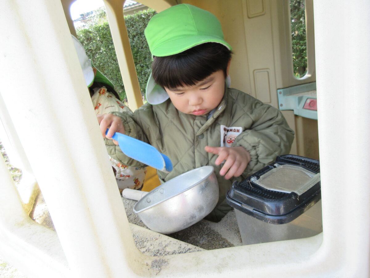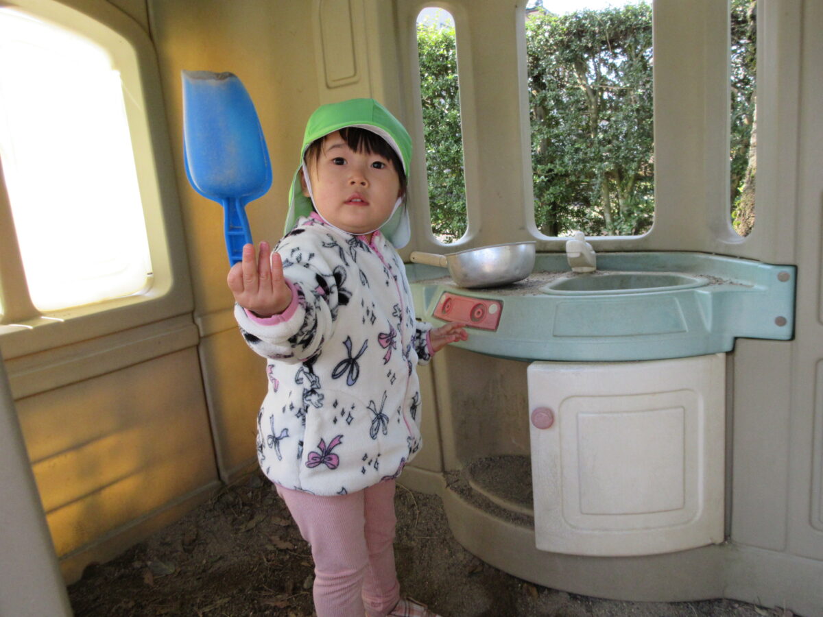 特に人気なのは砂場遊びです。バケツやお皿を持ってきて、スコップで土を入れたり料理を作ったりしています。おままごとハウスの中にも必ず誰かが入っています!