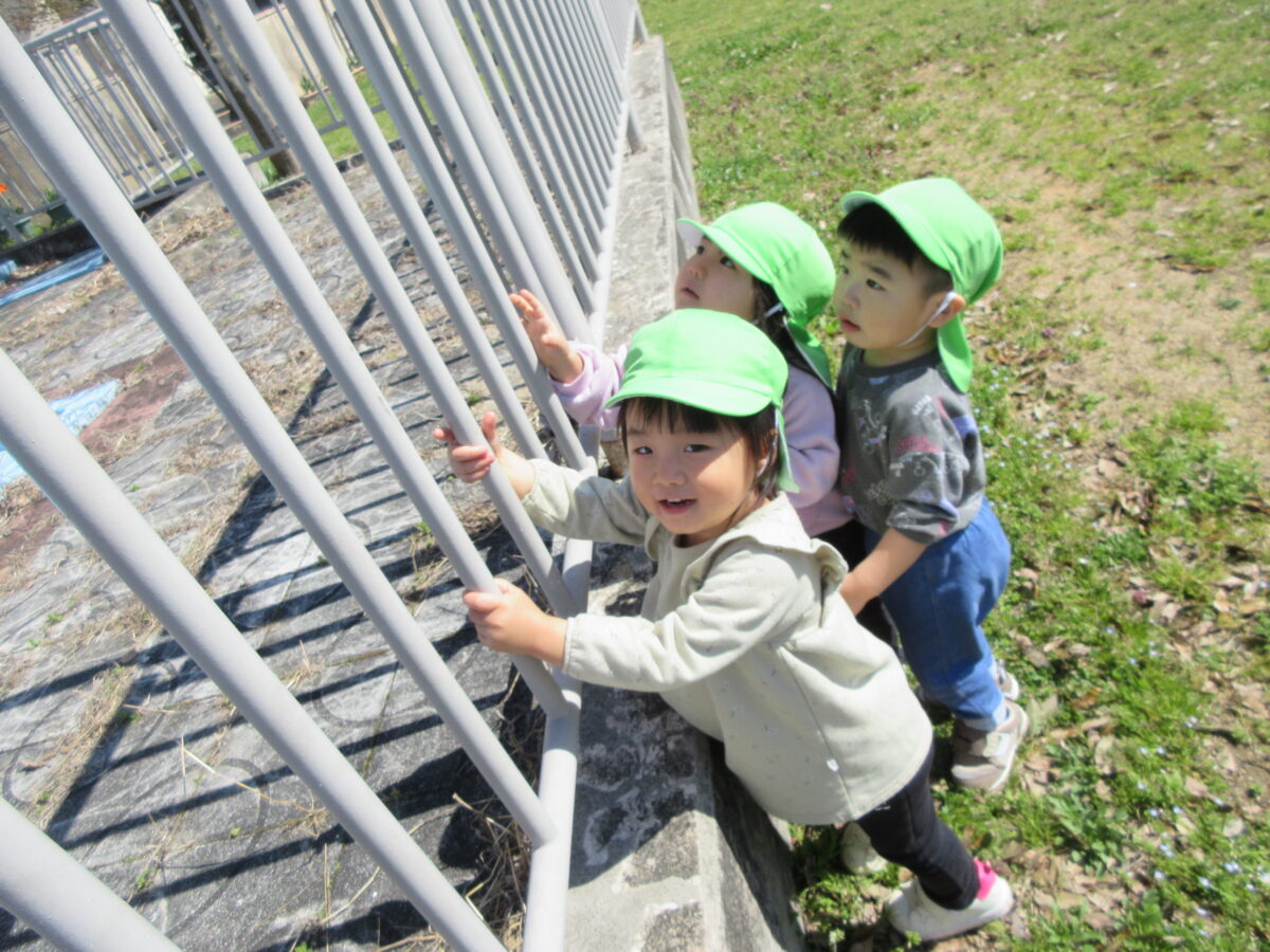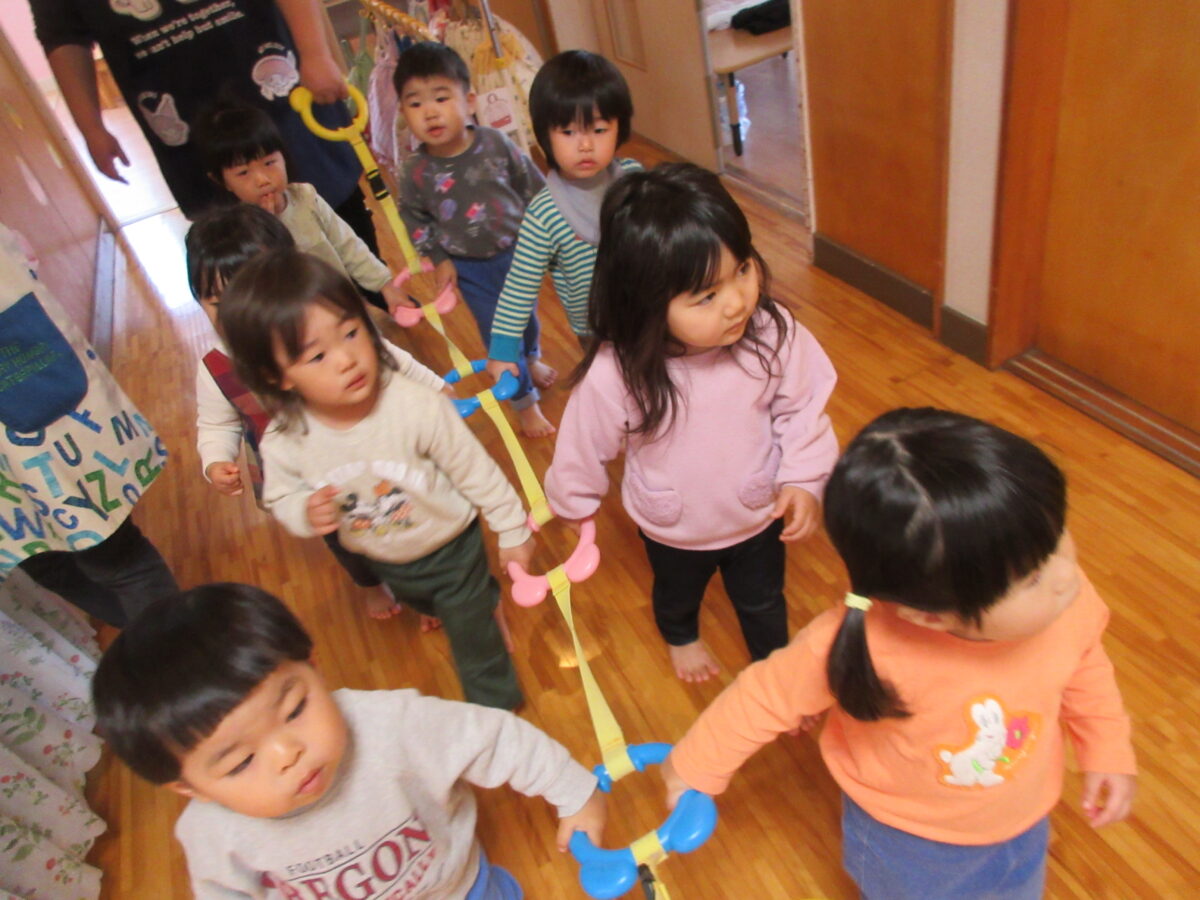 園内散歩をしました。各保育室を紹介しながら順番に巡っていきました。