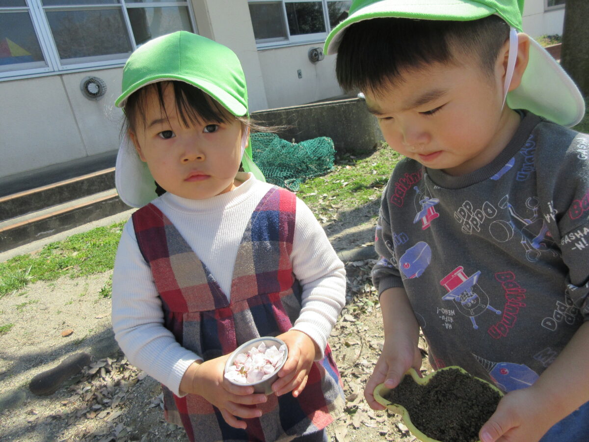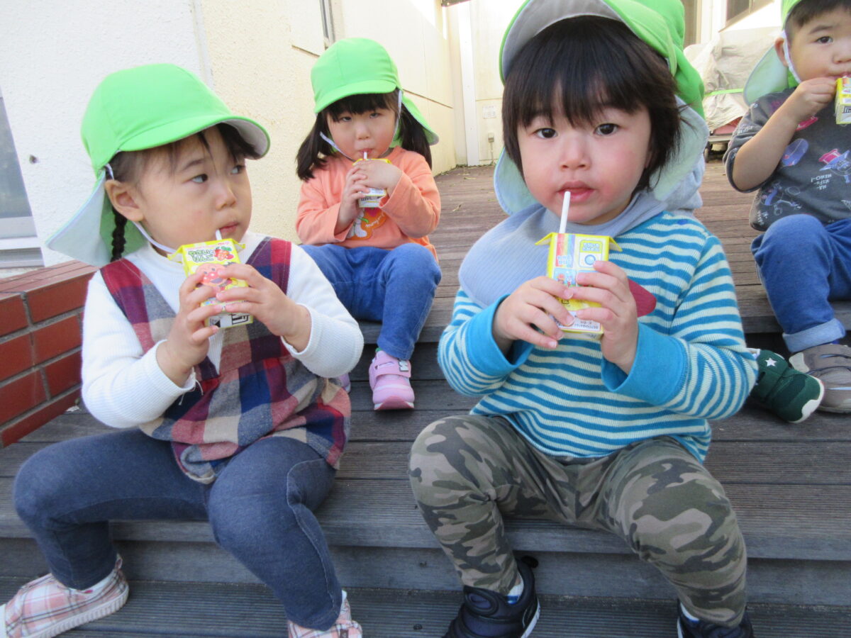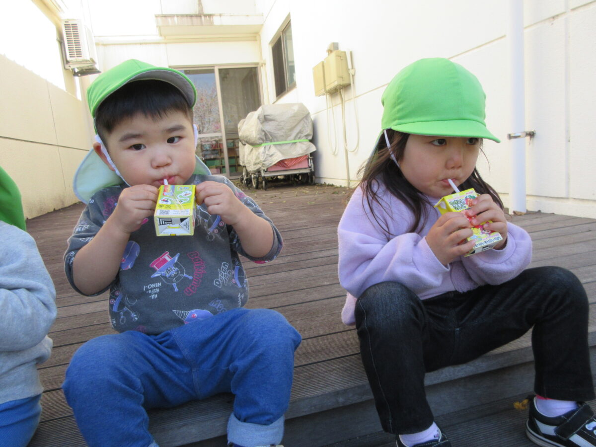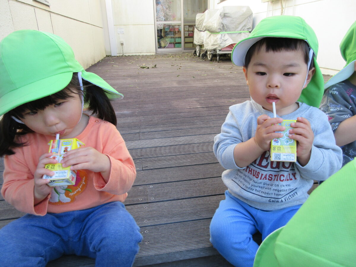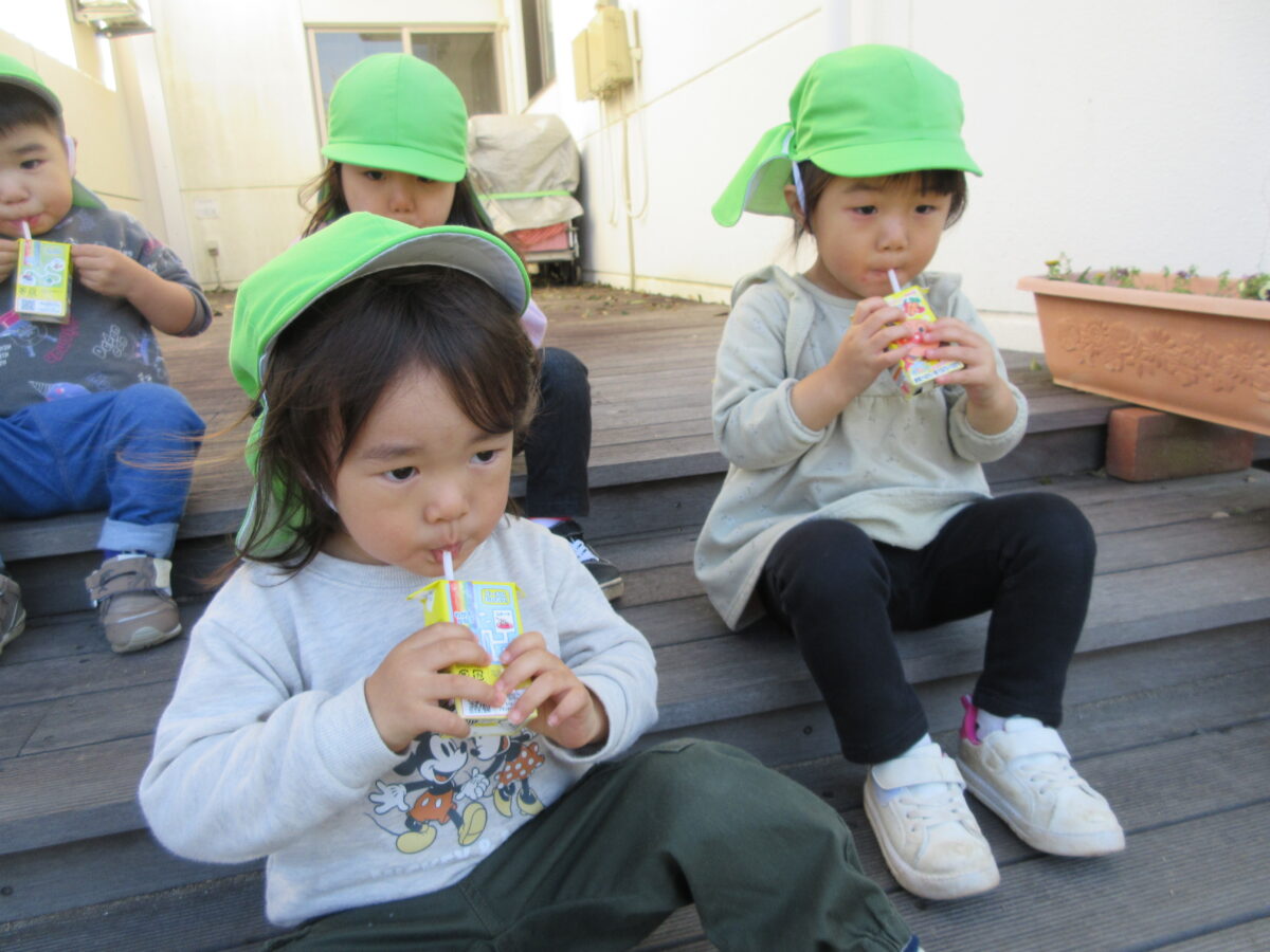 昨日は天気が良かったので、午前おやつのジュースをお外で飲みました。
