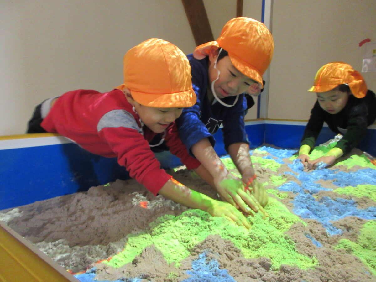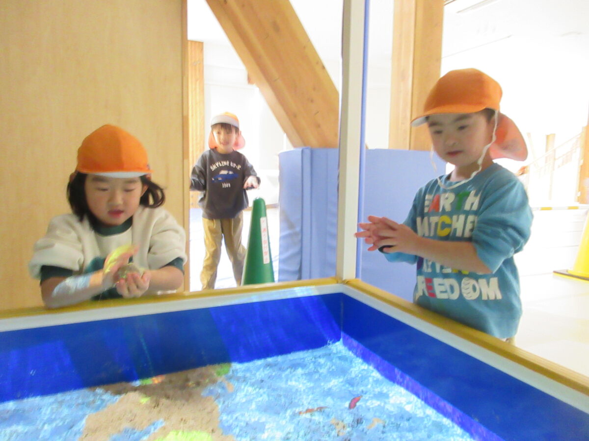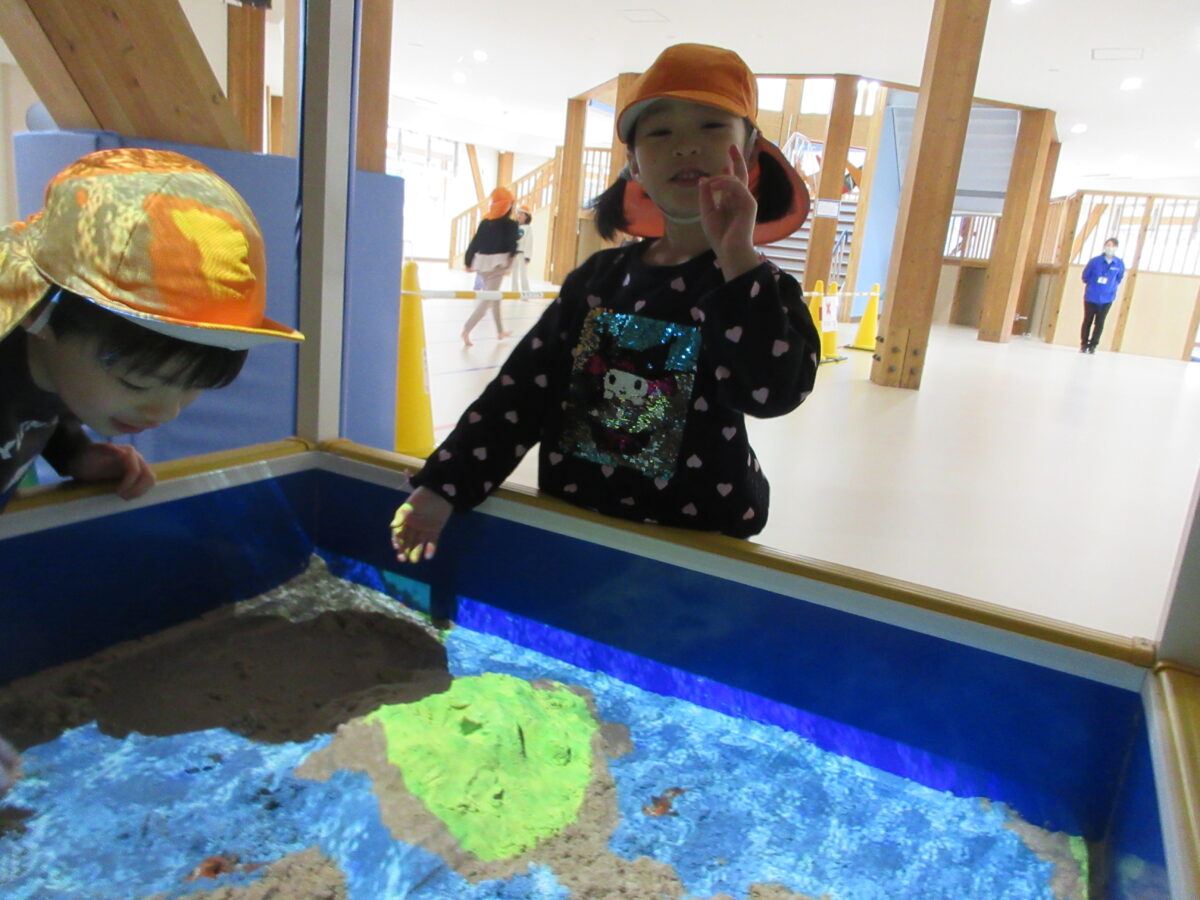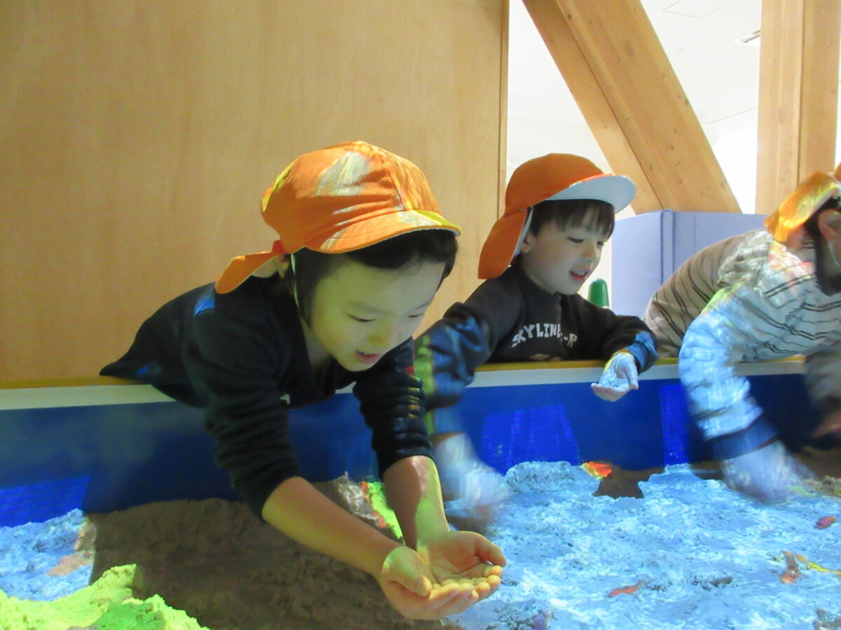 デジタル砂場では、飛んでくる虫や泳いでる魚を捕まえたり、大きなお山を作って楽しんでいました。