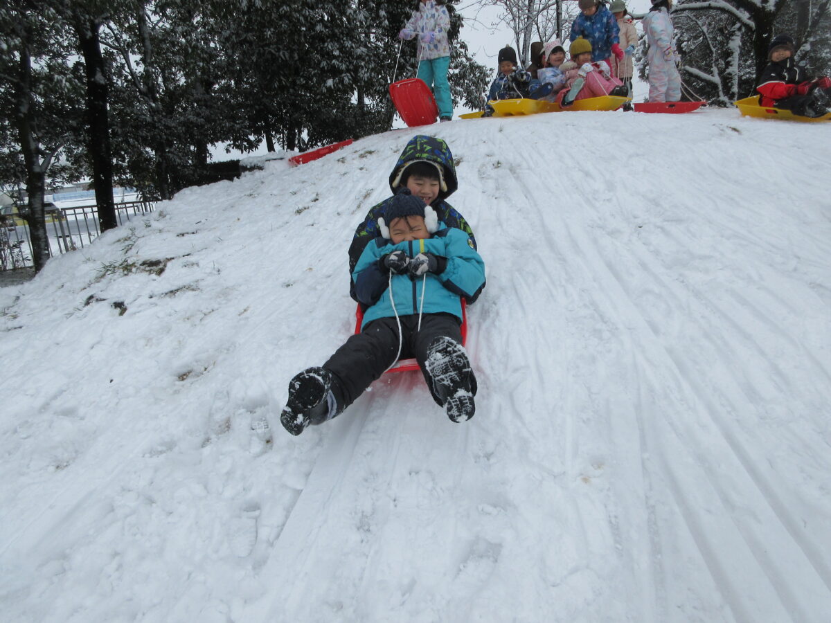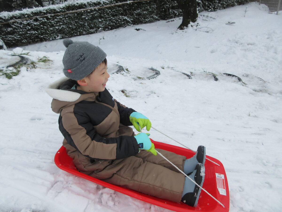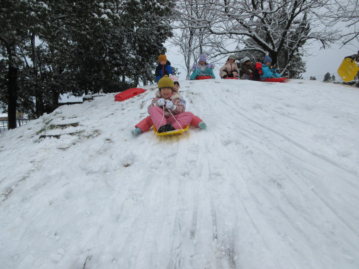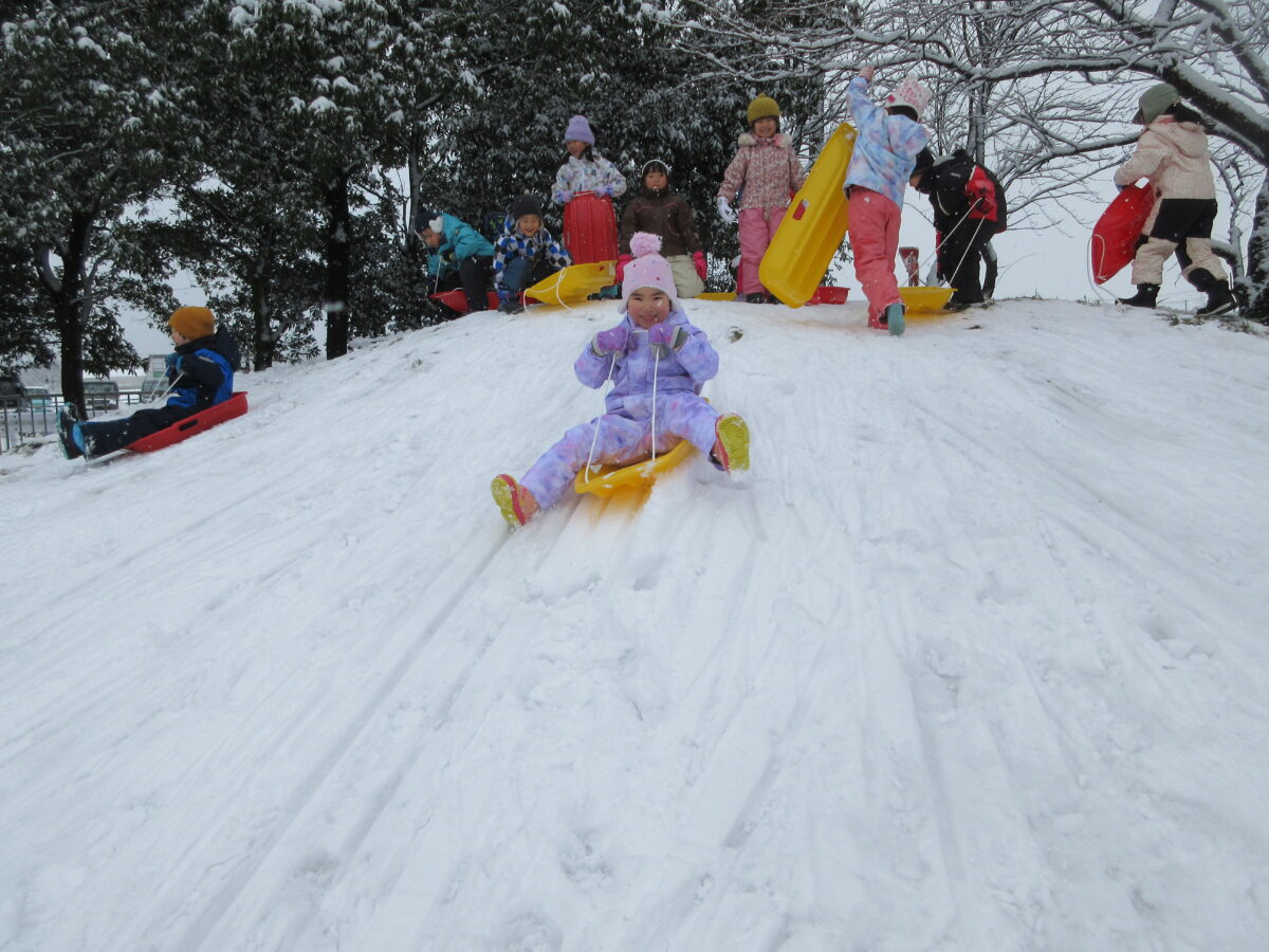 雪遊びも楽しんでいます!今週はソリ遊びもしました。約束事や順番も守りながら、お友達と一緒に滑って楽しんでいましたよ!