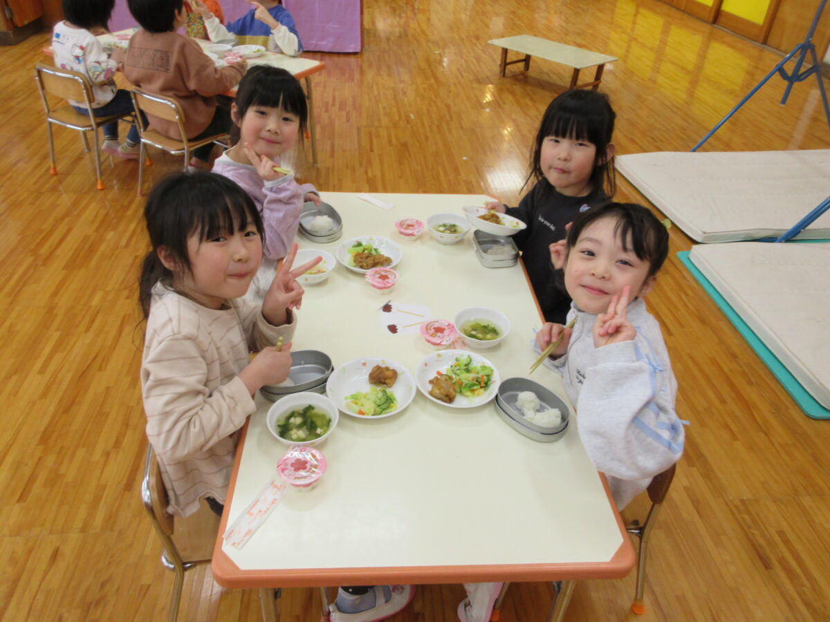 火曜日はひなまつり会があり、日中はひなまつりの由来を聞いたりクイズを楽しみ、給食は以上児さんで会食をしました。
