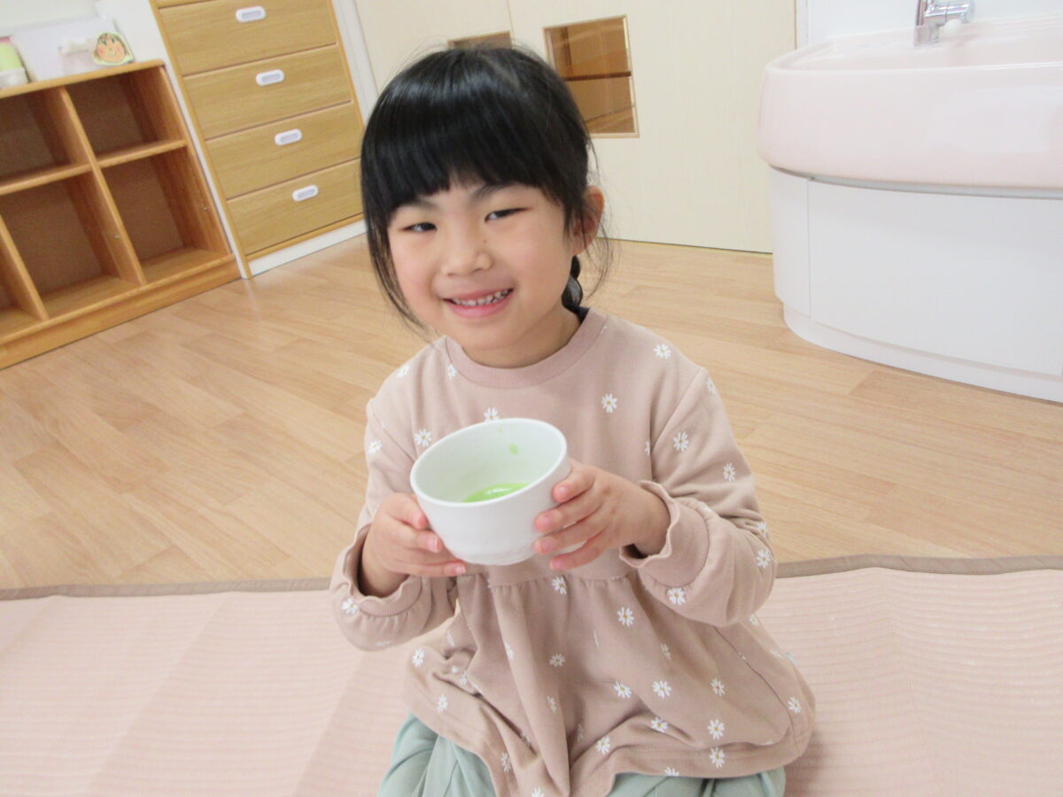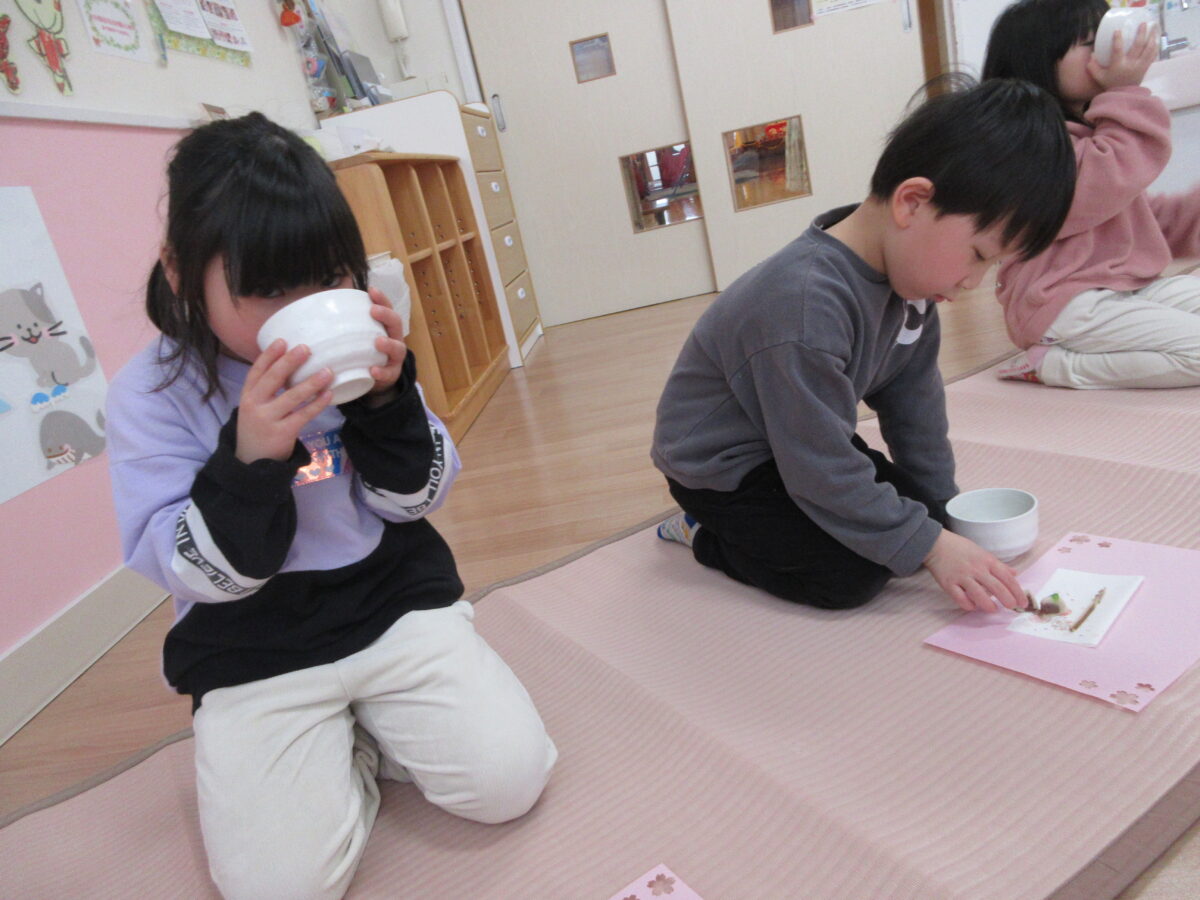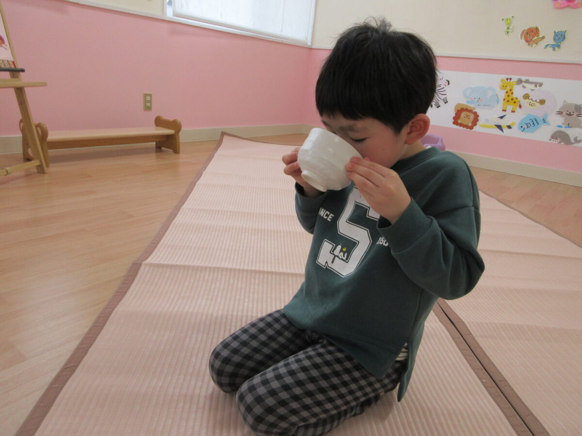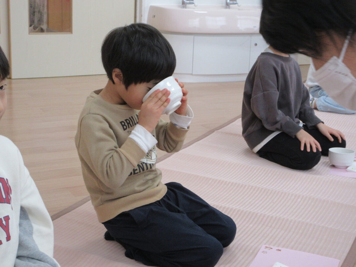 午後からお茶会に参加し、事務の先生から抹茶を点ててもらい、上手に和菓子と一緒に食べていました。雰囲気がいつもと違ったので、緊張気味のつき組さんでしたが、和菓子や抹茶を飲んで、「おいしー!」と雰囲気にあった声の大きさで言っていましたよ!