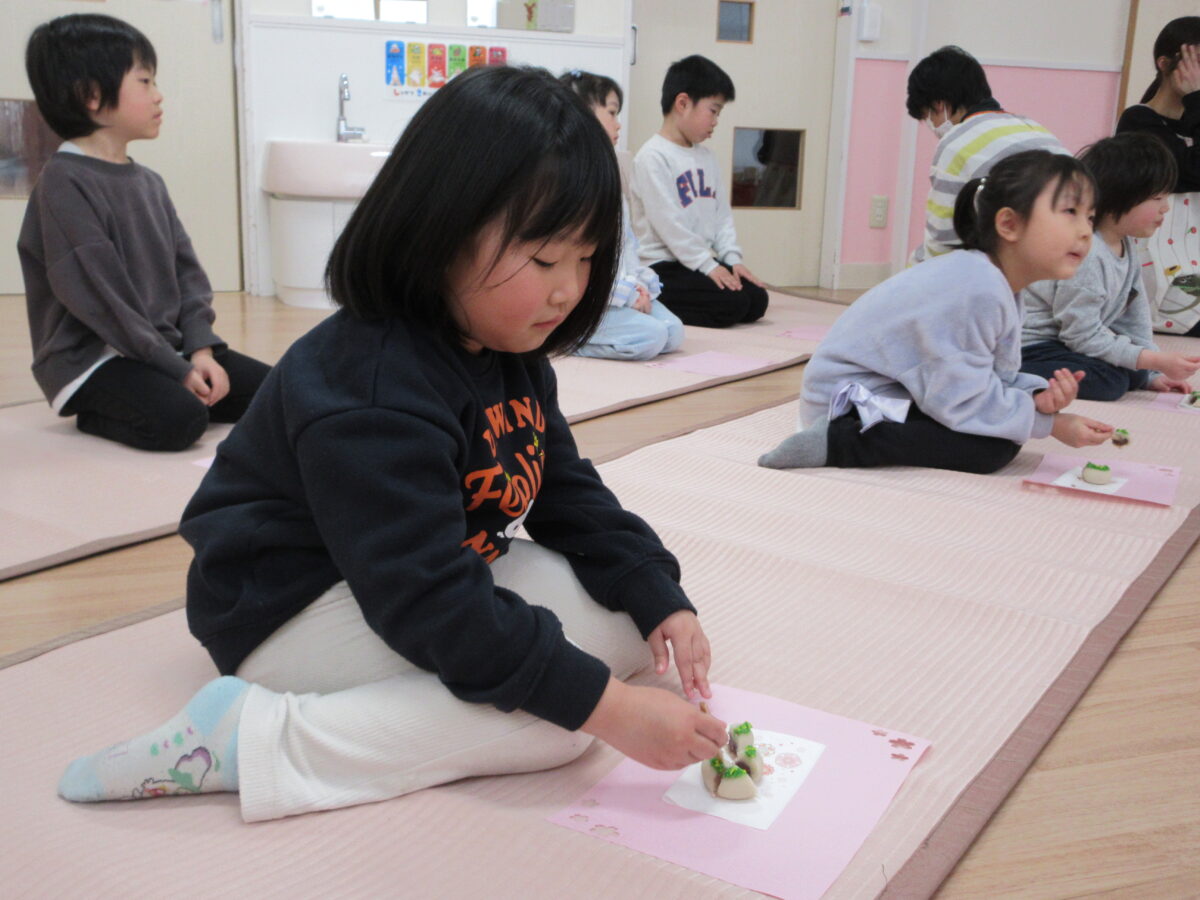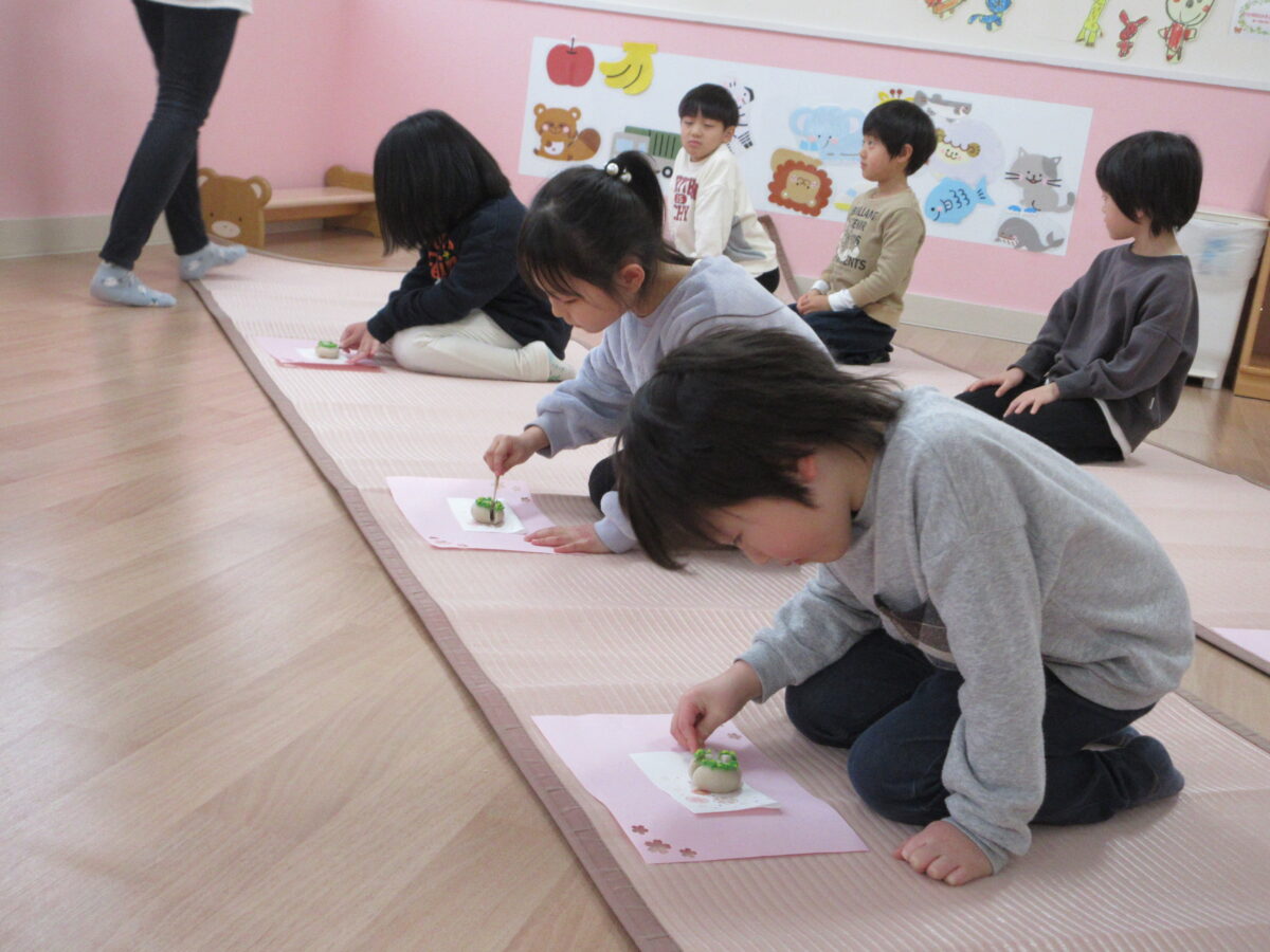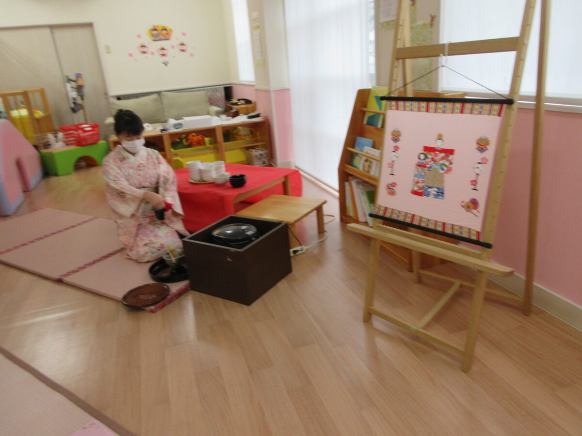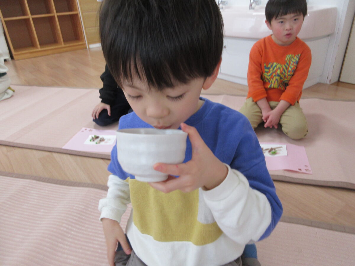 午後からお茶会に参加し、事務の先生から抹茶を点ててもらい、上手に和菓子と一緒に食べていました。雰囲気がいつもと違ったので、緊張気味のつき組さんでしたが、和菓子や抹茶を飲んで、「おいしー!」と雰囲気にあった声の大きさで言っていましたよ!