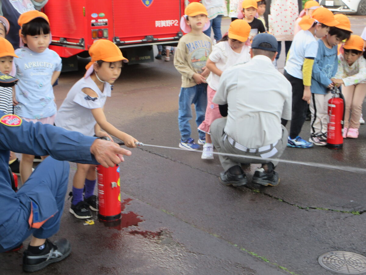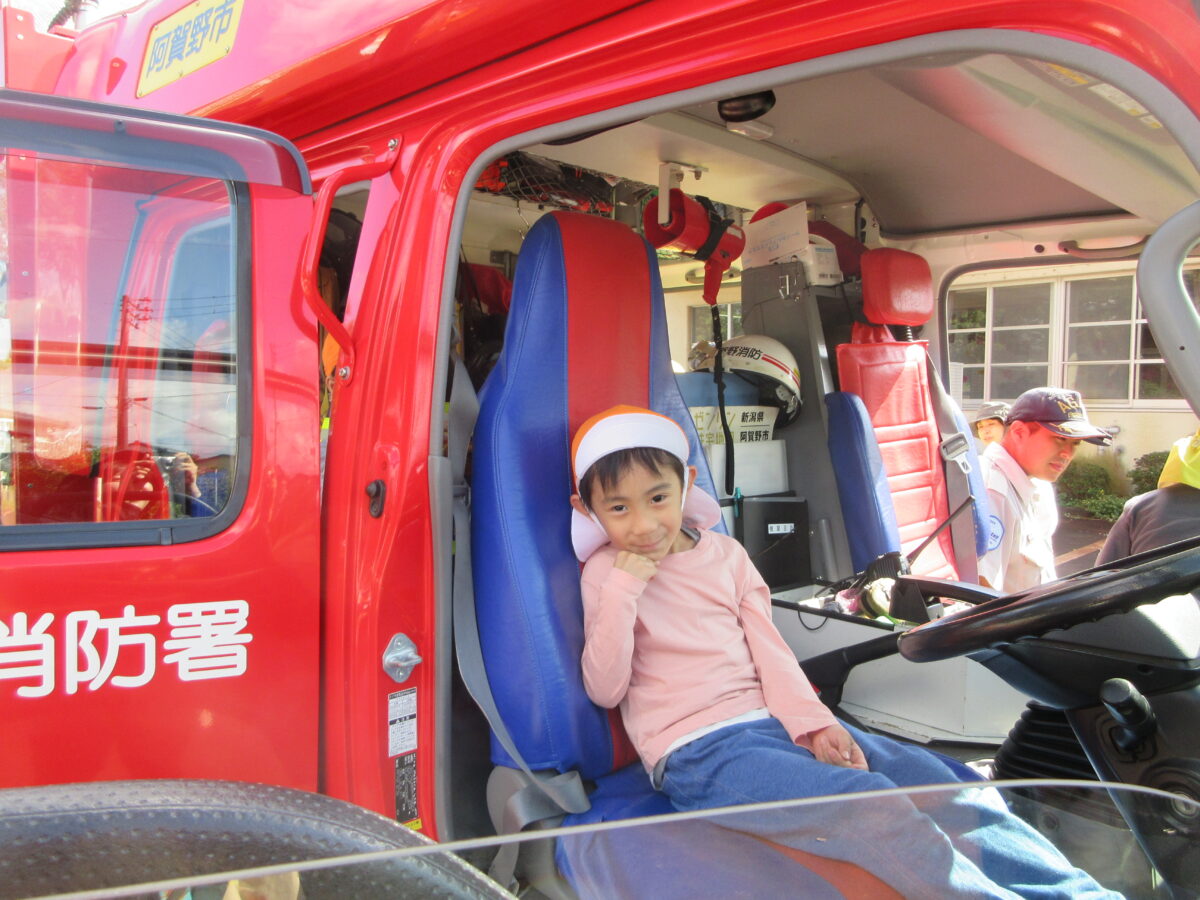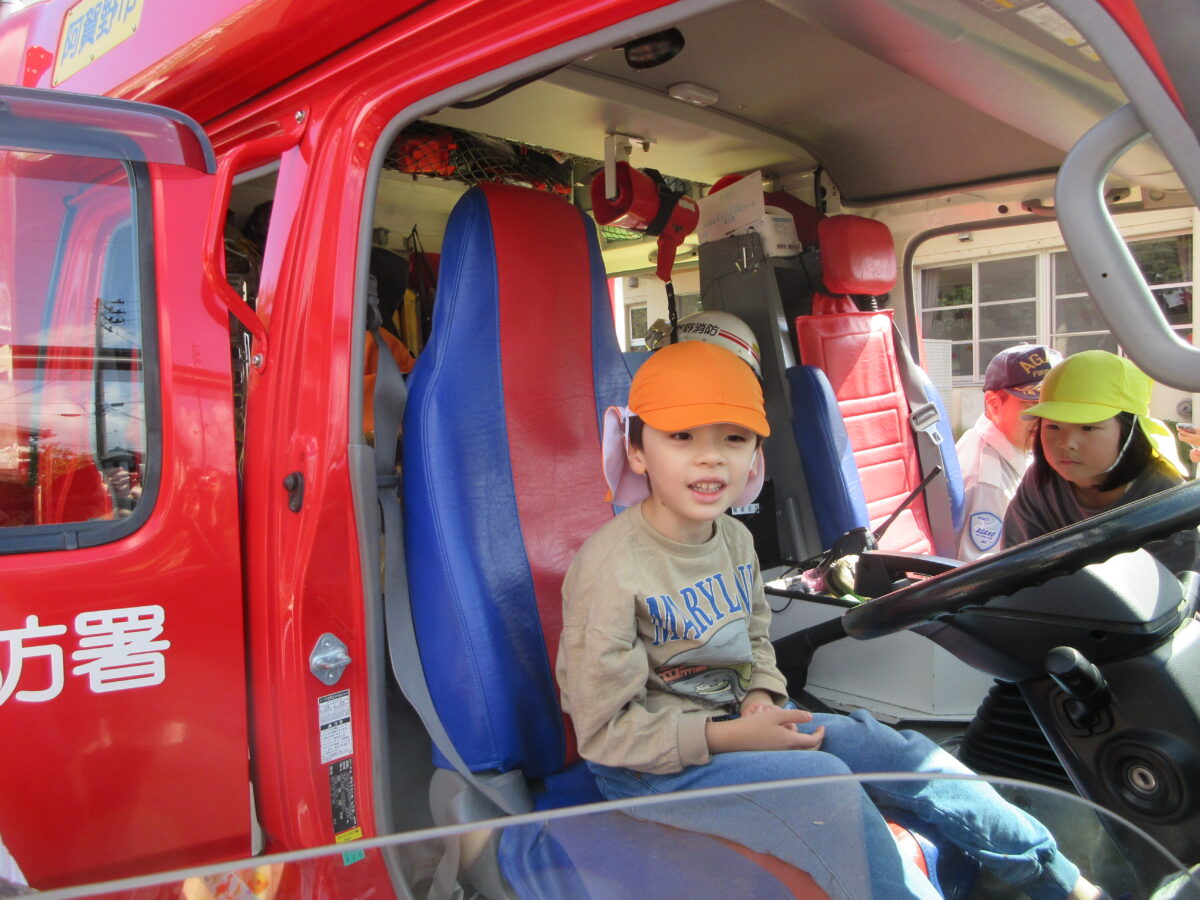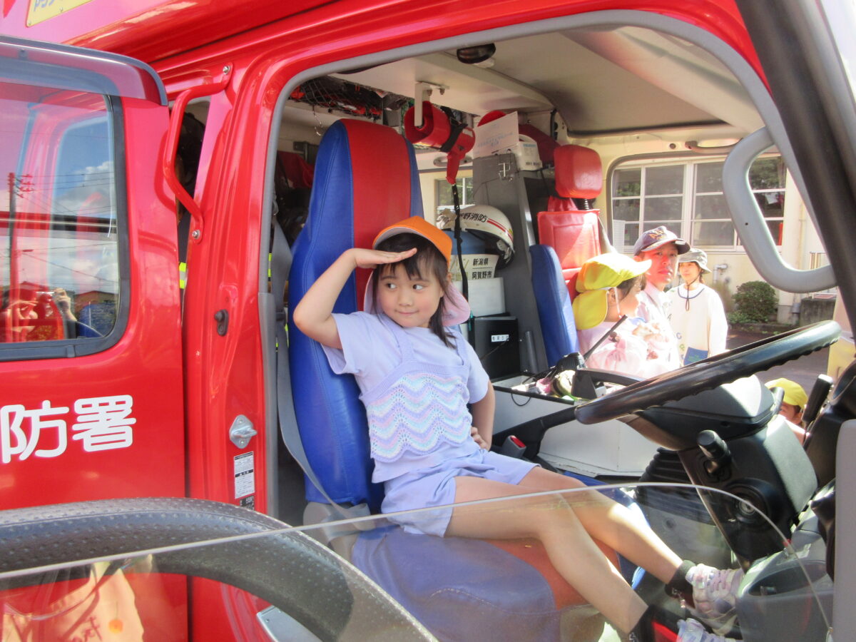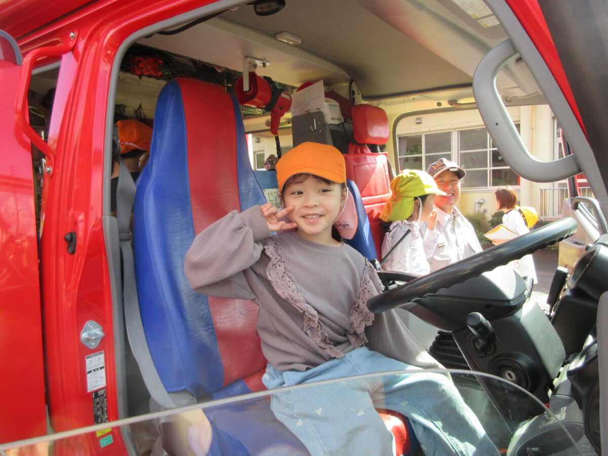 今日は避難訓練の後に消防の方から、避難訓練についての大事なお話や放水訓練を教えてもらいました。みんなの大好きな消防車の中を見せてもらったり、運転席に座ったり、特別にヘルメットも被らせてもらいました。消防車を見るとみんな目を輝かせ、興味津々でした!!