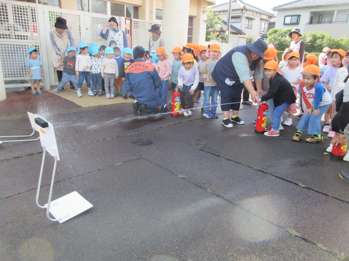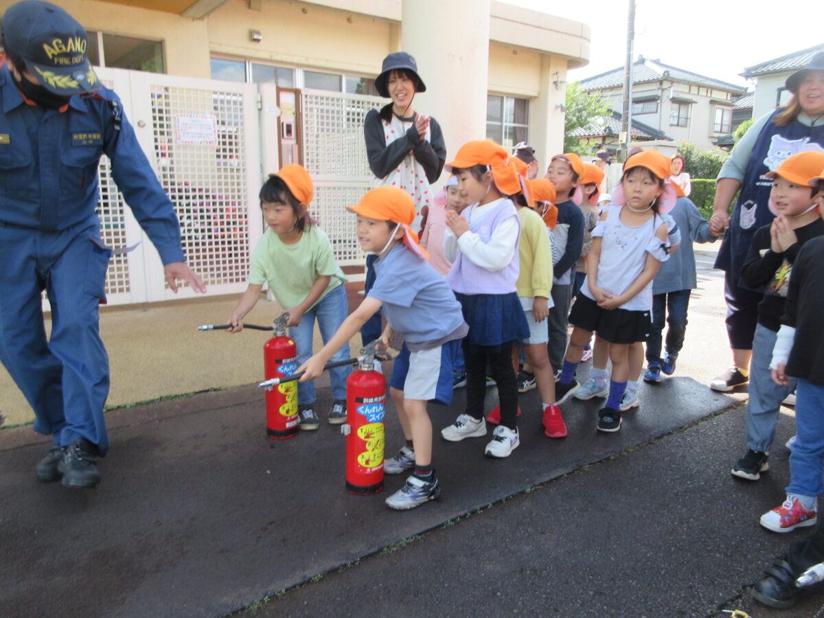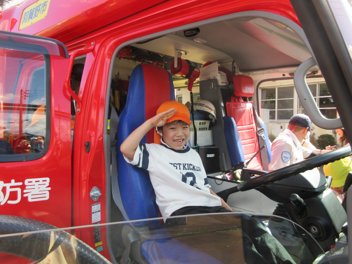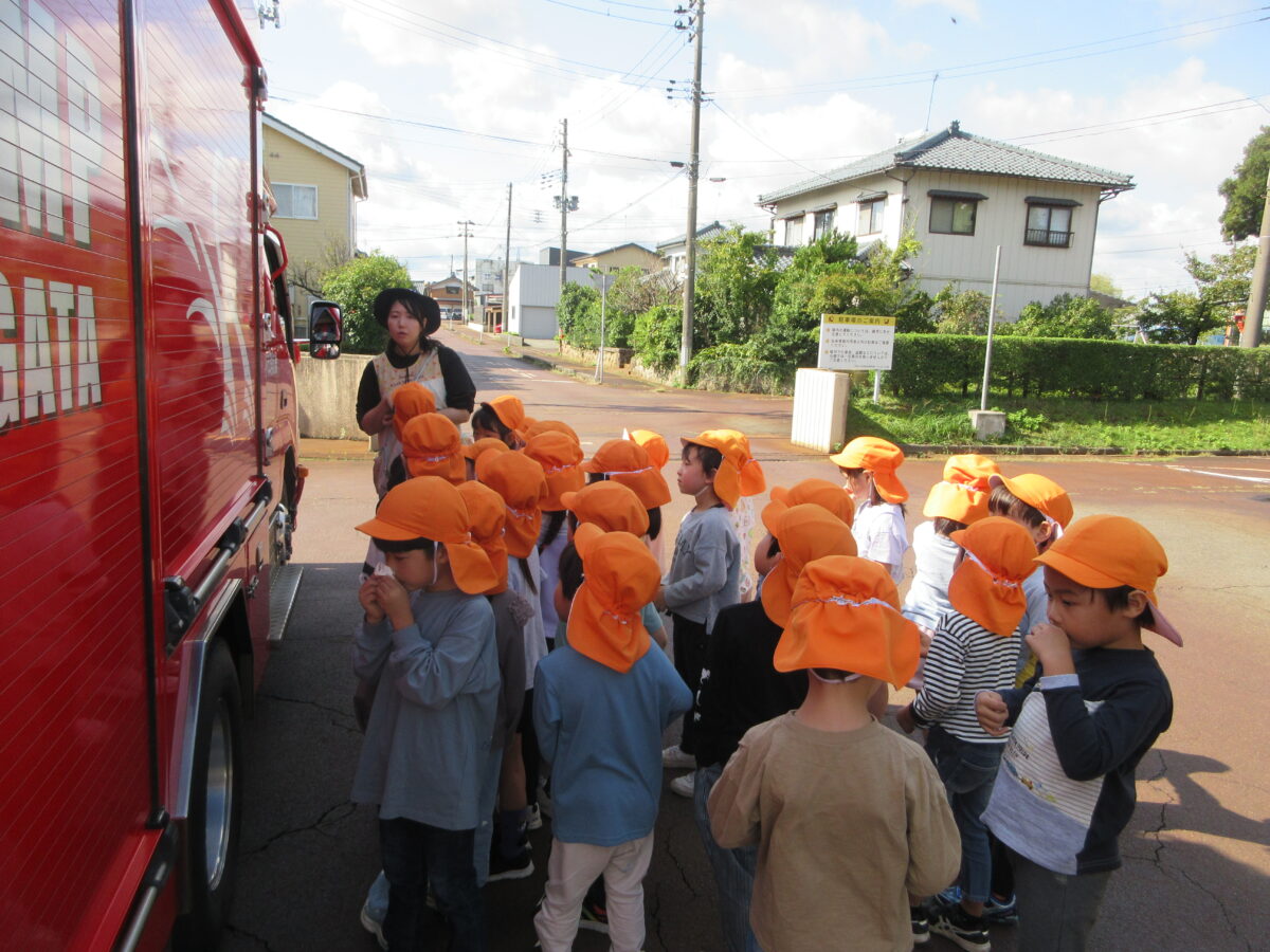 今日は避難訓練の後に消防の方から、避難訓練についての大事なお話や放水訓練を教えてもらいました。みんなの大好きな消防車の中を見せてもらったり、運転席に座ったり、特別にヘルメットも被らせてもらいました。消防車を見るとみんな目を輝かせ、興味津々でした!!