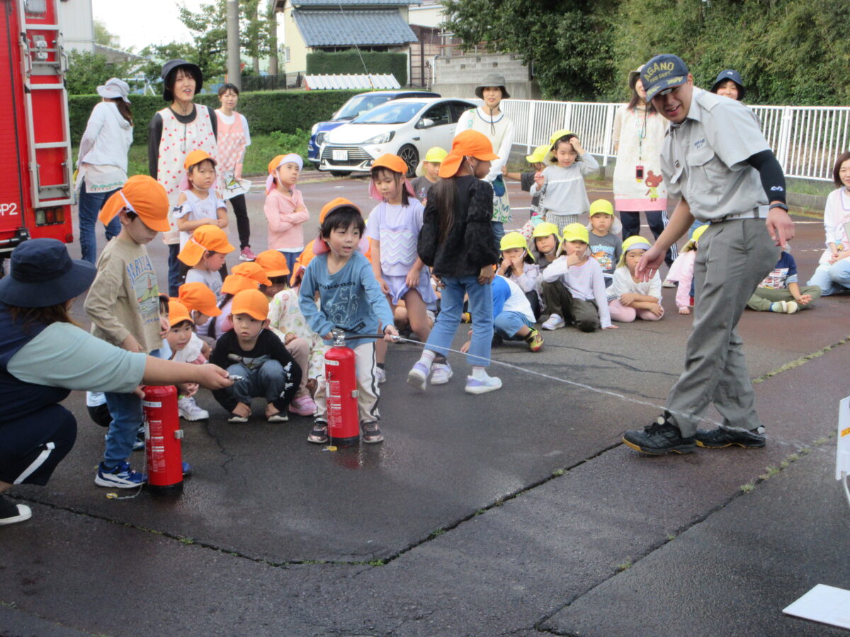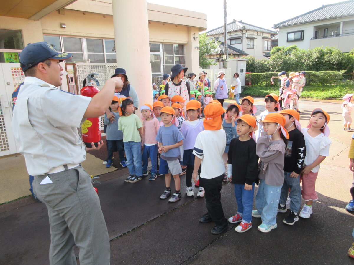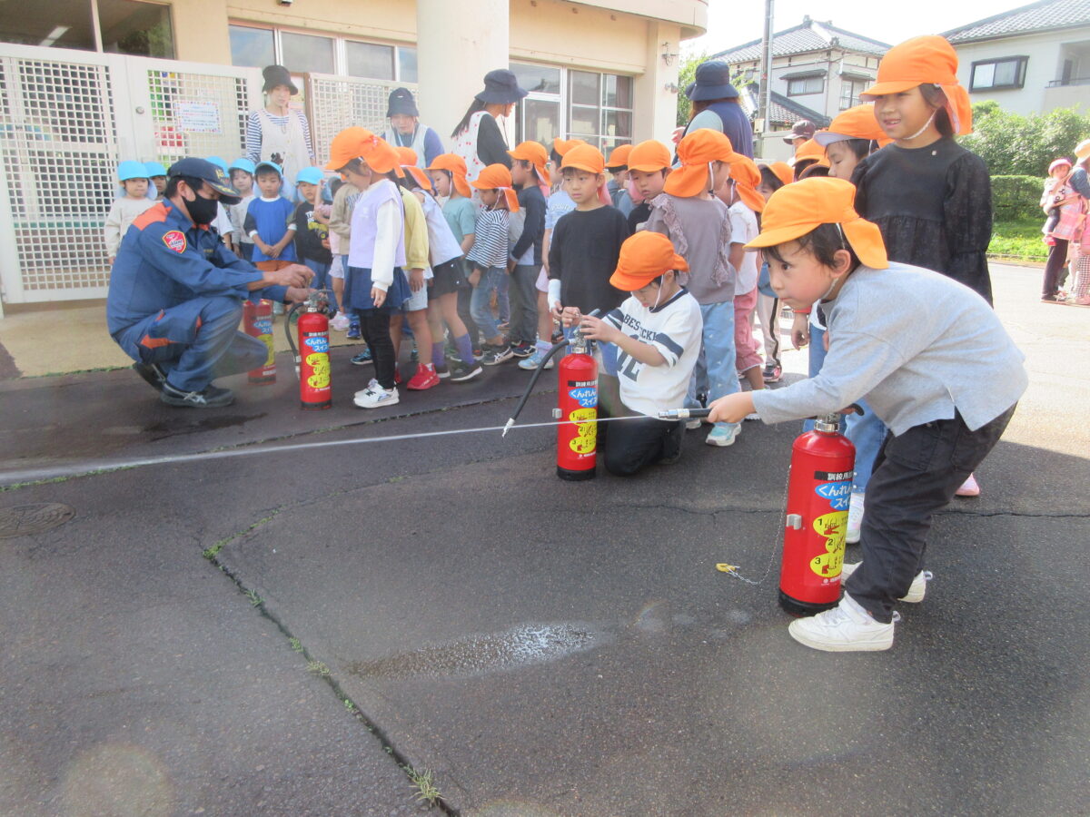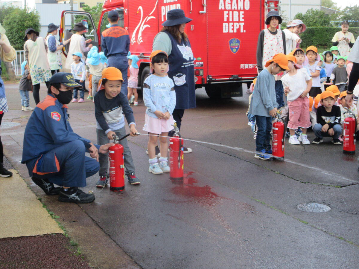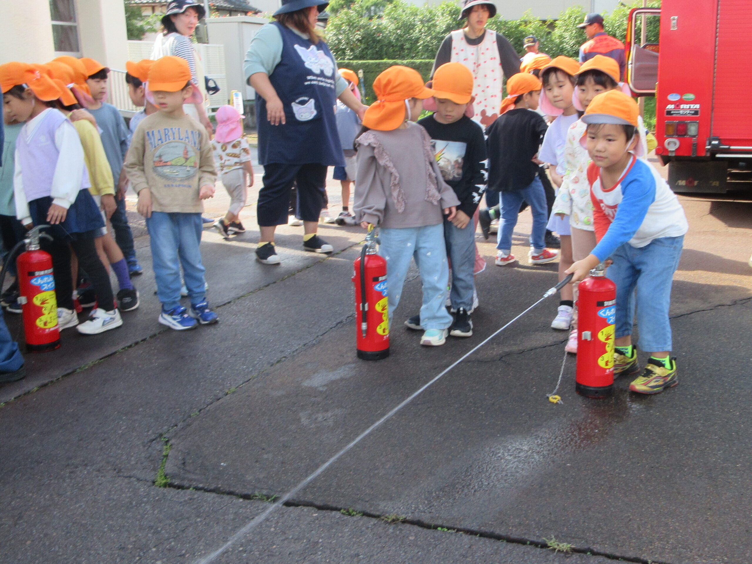 今日は避難訓練の後に消防の方から、避難訓練についての大事なお話や放水訓練を教えてもらいました。みんなの大好きな消防車の中を見せてもらったり、運転席に座ったり、特別にヘルメットも被らせてもらいました。消防車を見るとみんな目を輝かせ、興味津々でした!!