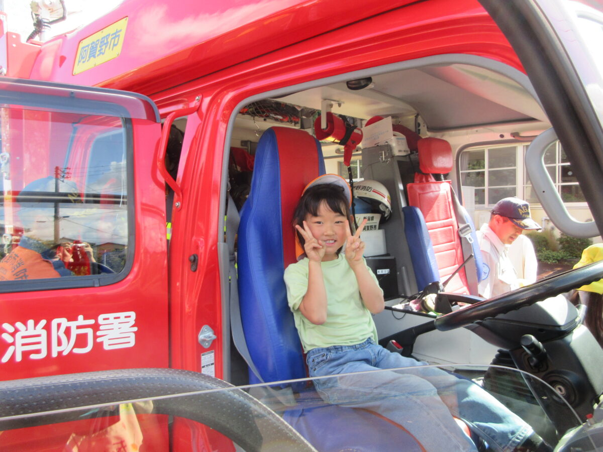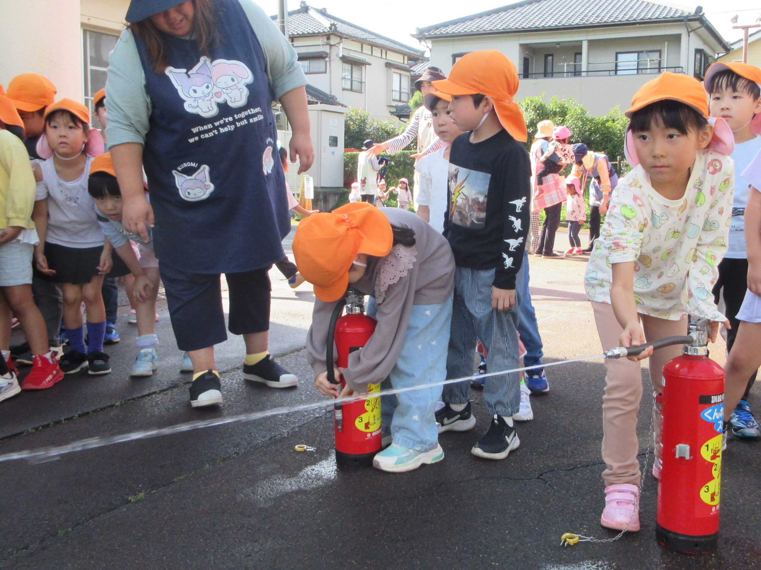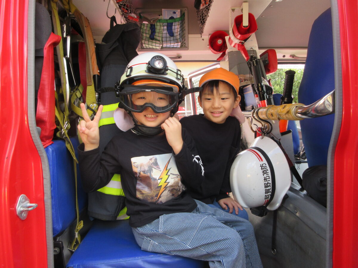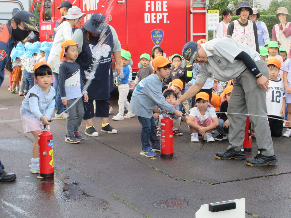 今日は避難訓練の後に消防の方から、避難訓練についての大事なお話や放水訓練を教えてもらいました。みんなの大好きな消防車の中を見せてもらったり、運転席に座ったり、特別にヘルメットも被らせてもらいました。消防車を見るとみんな目を輝かせ、興味津々でした!!