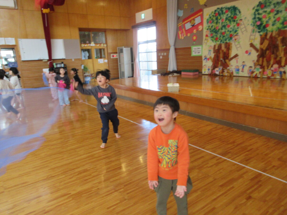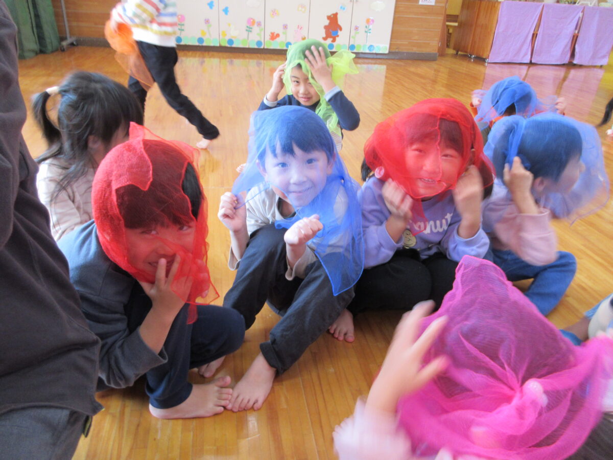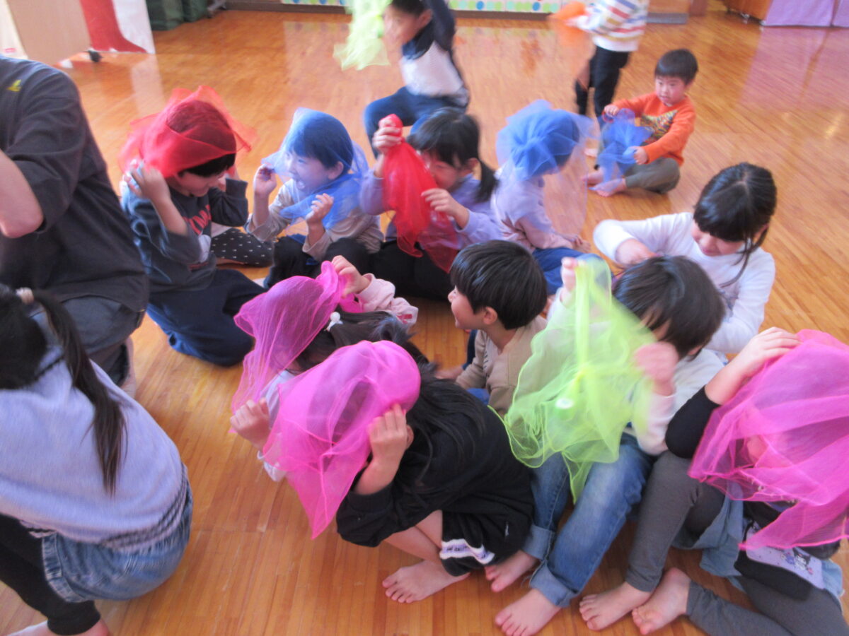 次はスカーフマスカラを使ってお化けに見つからないように歩きます。小見先生が「おばけだ!」と言うと、可愛く隠れていましたよ!