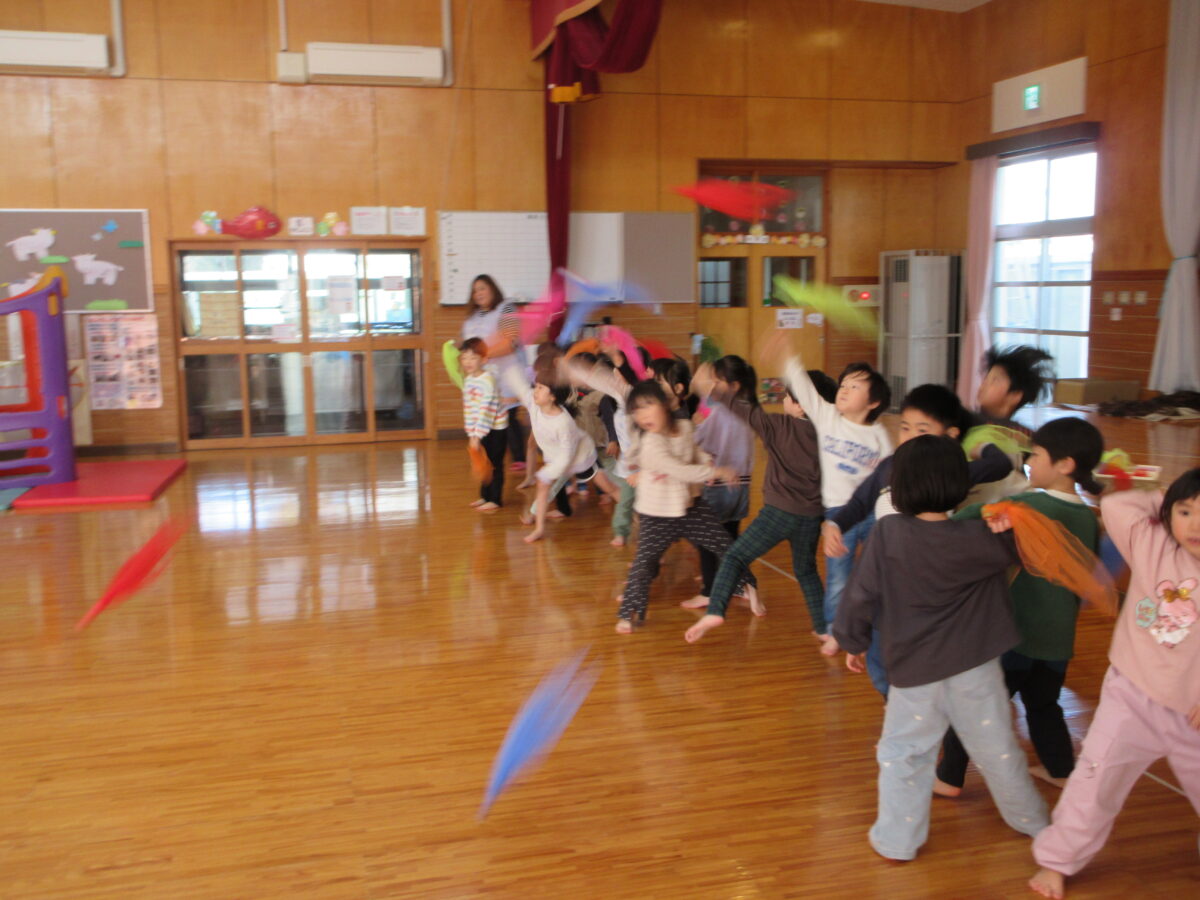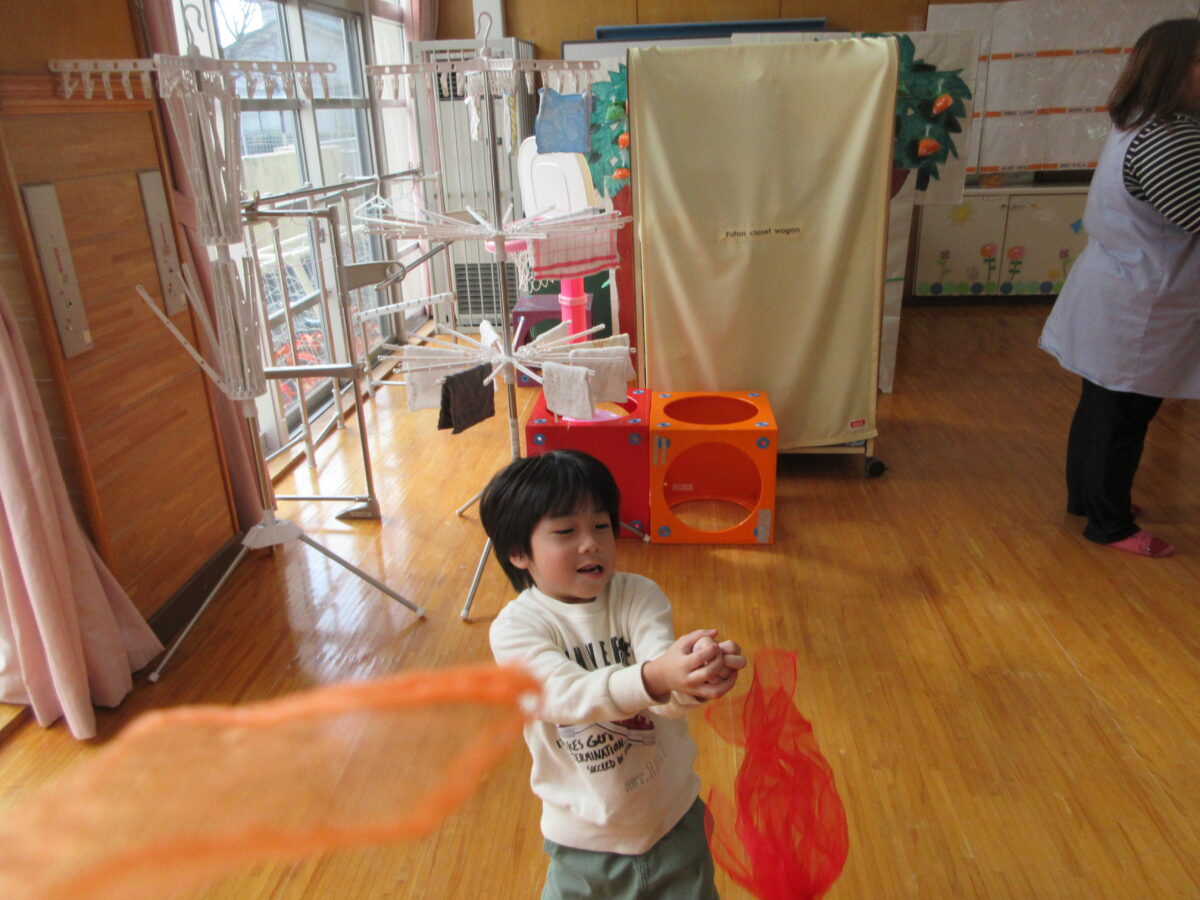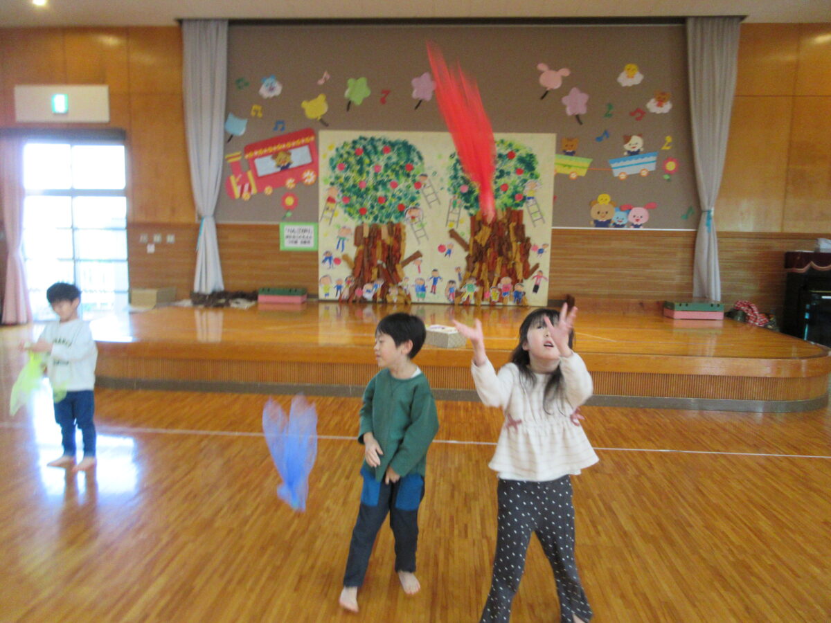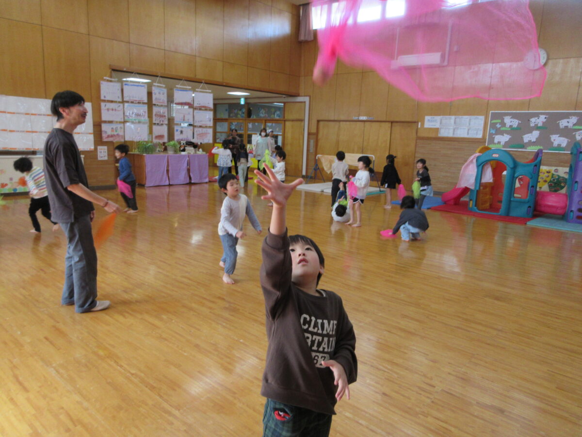 スカーフマラカスを使うことで、日常生活に必要な目と手の協応が育まれます。子どもたちはスカーフマスカラを投げて片手でキャッチして見たり、高く上げてキャッチを目指したりと思い思い楽しんでいました。