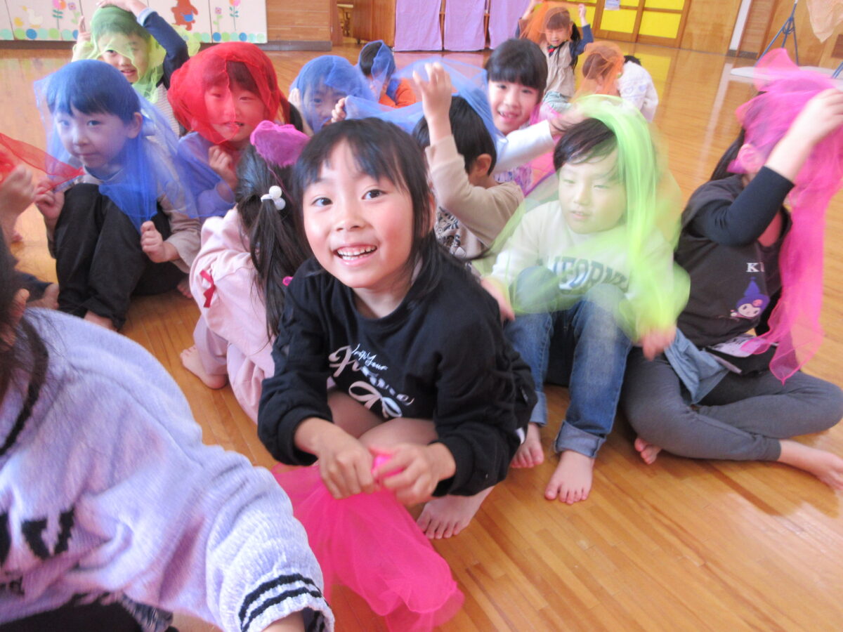 今日はリトミックの日!スカーフの中にペットボトルキャップで作ったマラカスを入れたものを使い、それを飛ばしてみたり、自分で投げてキャッチをしてみたり、色々な活動をしました。