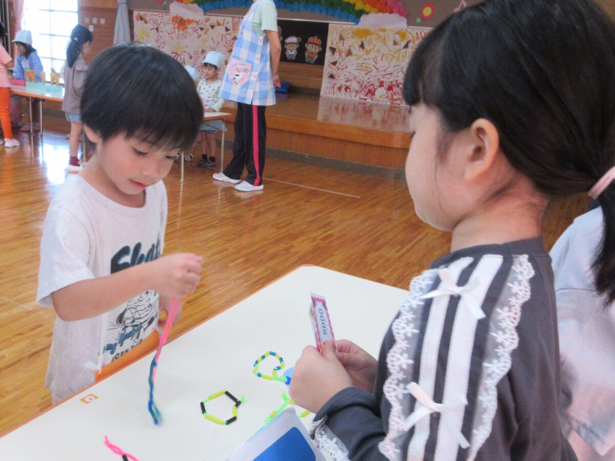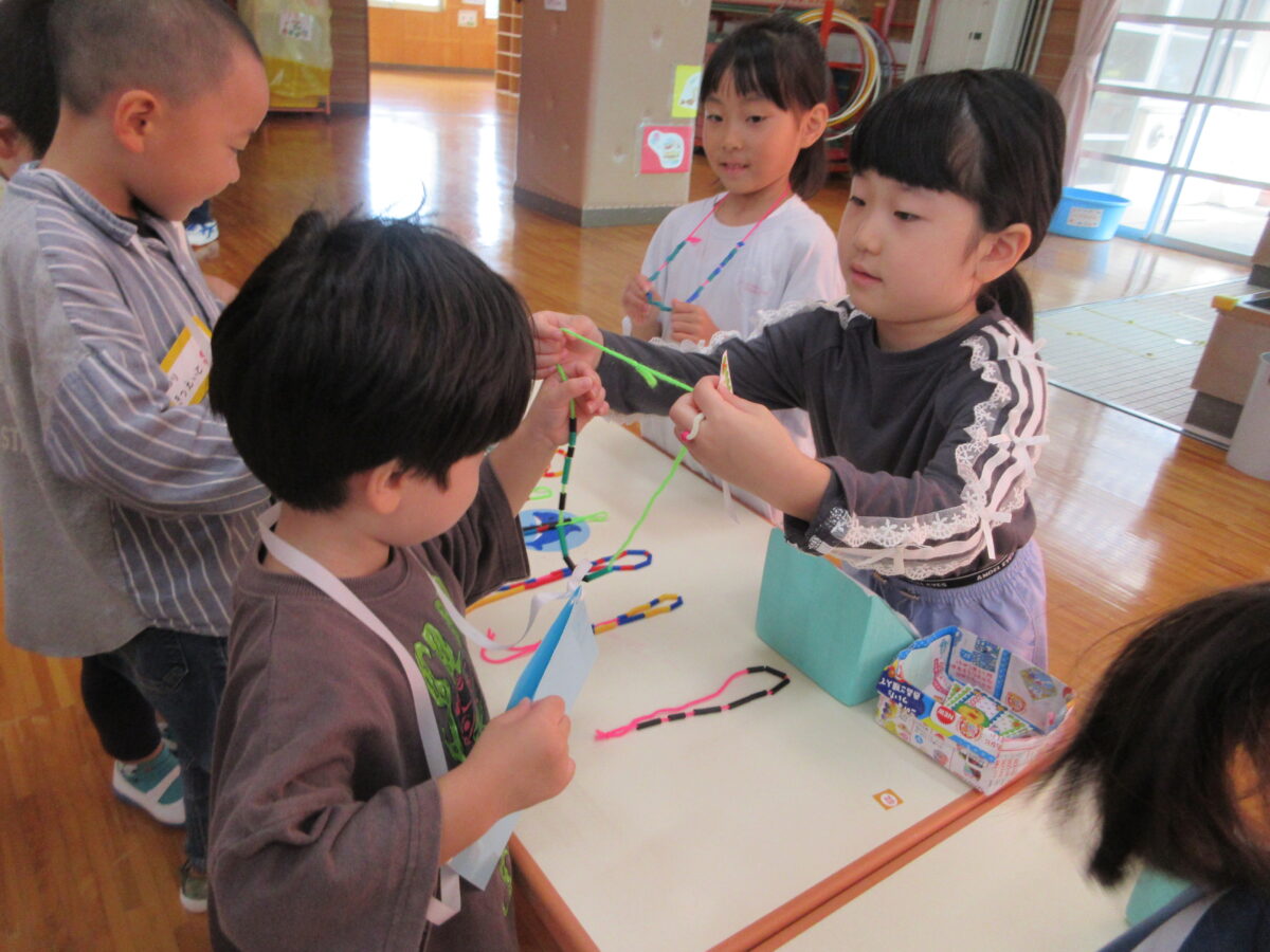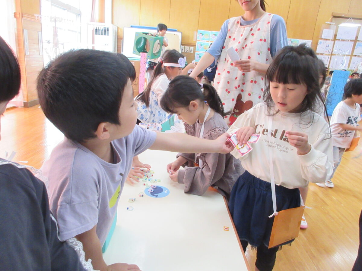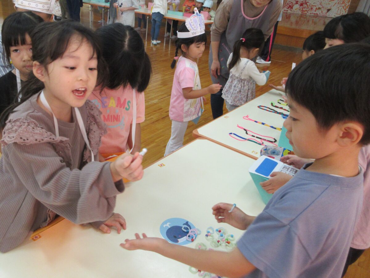 お客さんになると、はな組のアイス屋さんとほし組の水族館、つき組の魚釣りとアクセサリーを何度も行き来して、繰り返し楽しんでいました。