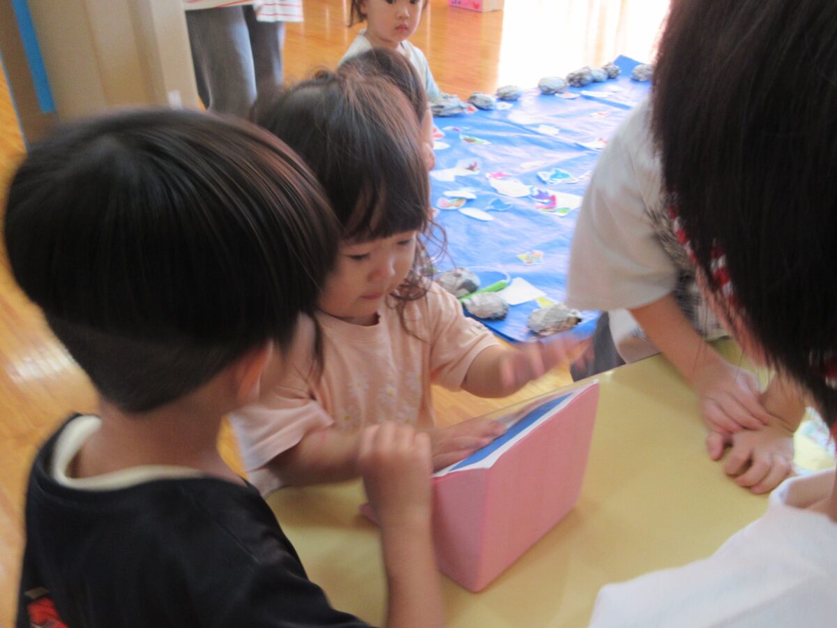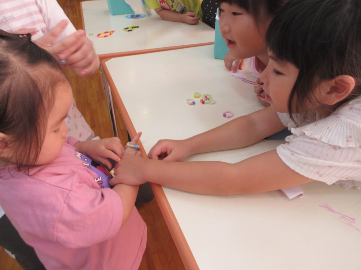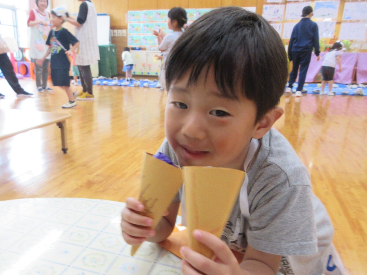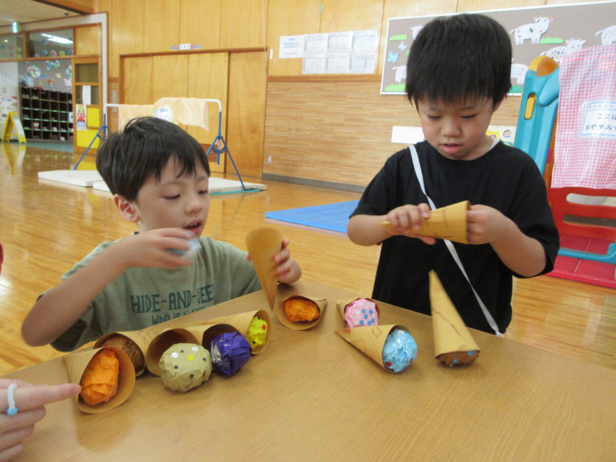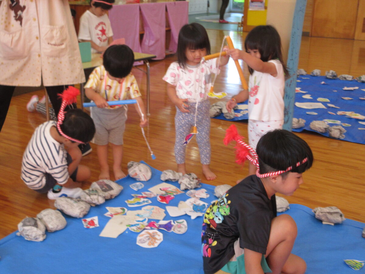 お客さんになると、はな組のアイス屋さんとほし組の水族館、つき組の魚釣りとアクセサリーを何度も行き来して、繰り返し楽しんでいました。