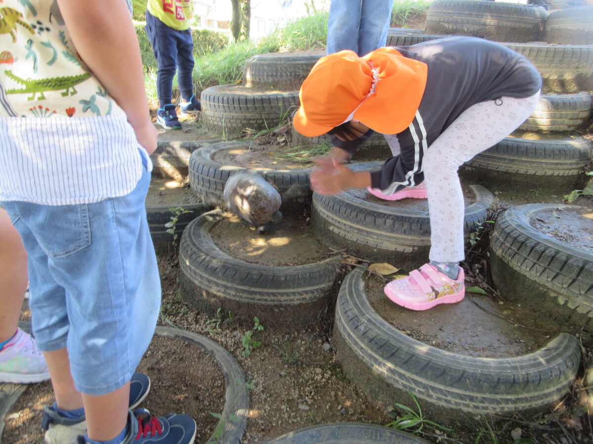 この日は築山の上まで来ました。築山の裏はタイヤの階段になっていますが、ペロちゃんがどうするか見守ることに…