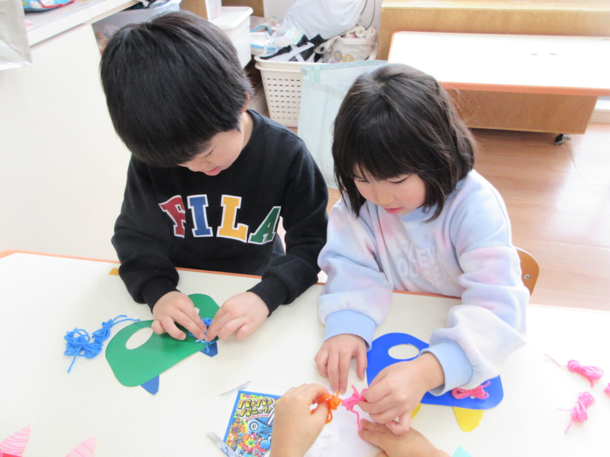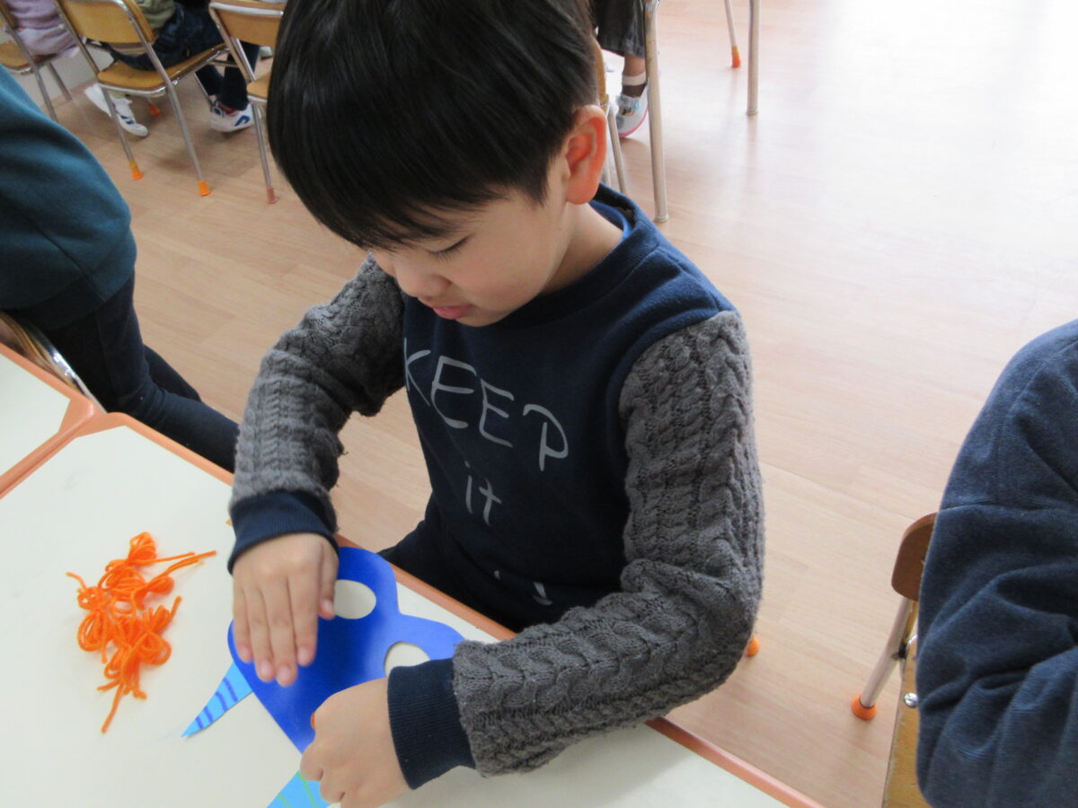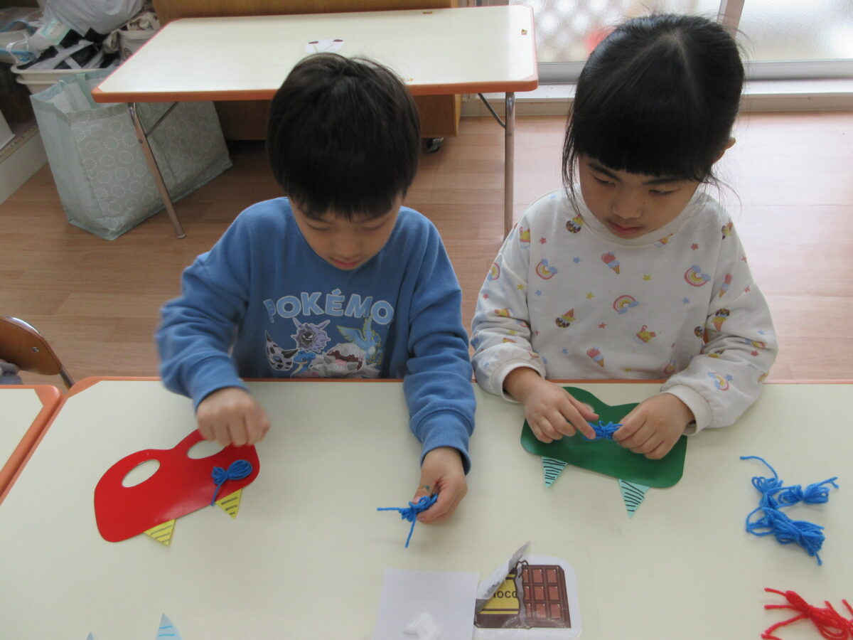 毛糸結びに挑戦して作りました。結び方が少し難しそうにしている子もいましたが、やり方をお友達や保育者に聞いたりして丁寧に結んでいましたよ。