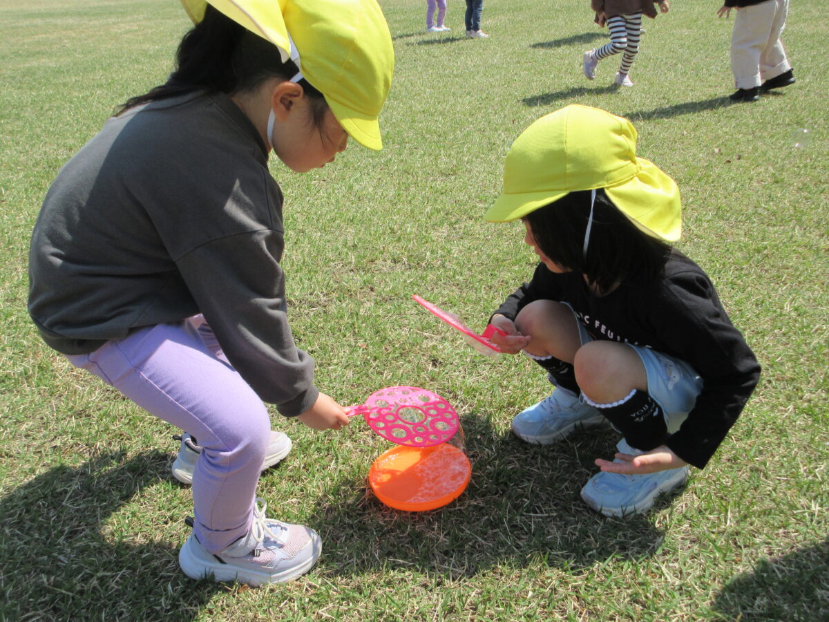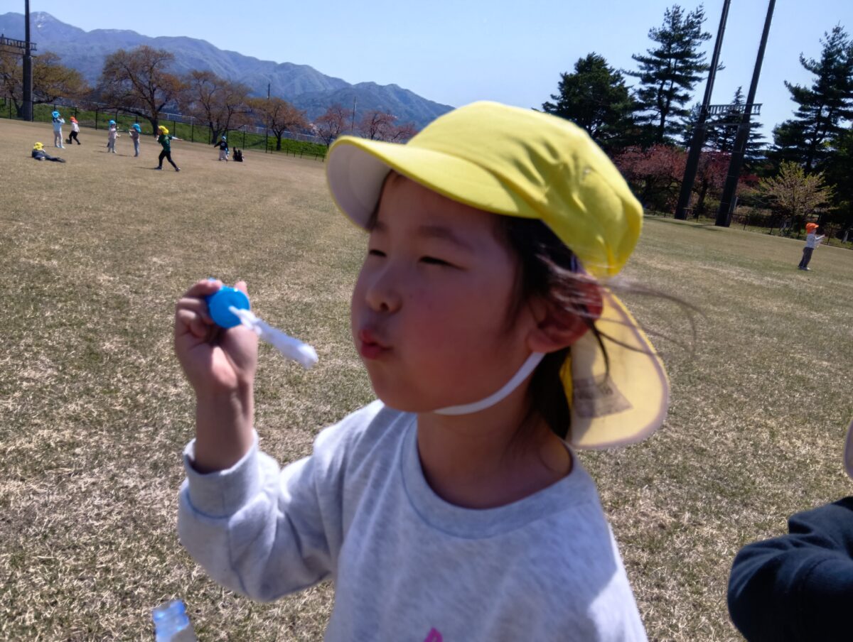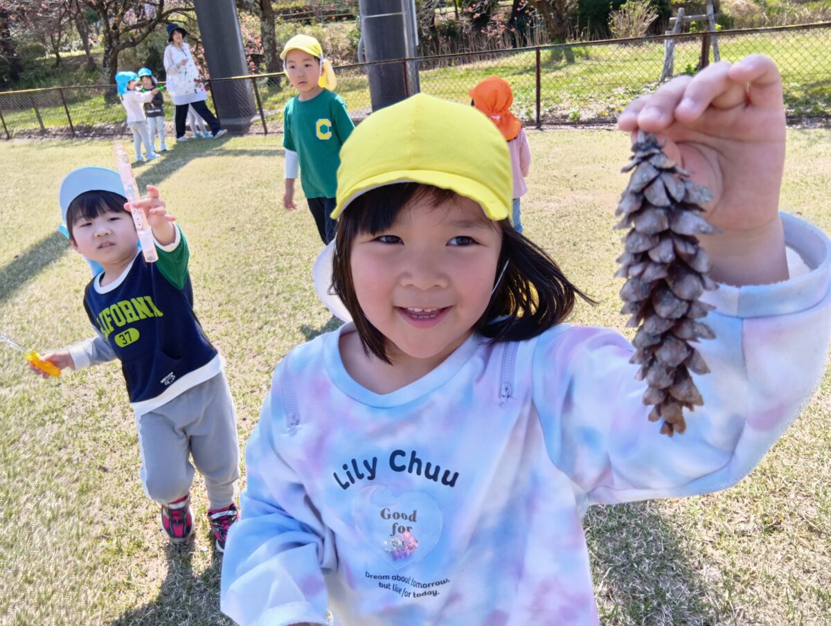 シャボン玉をしたり、大きい松ぼっくりを見つけたり、地蔵鬼ごっこをしたりと