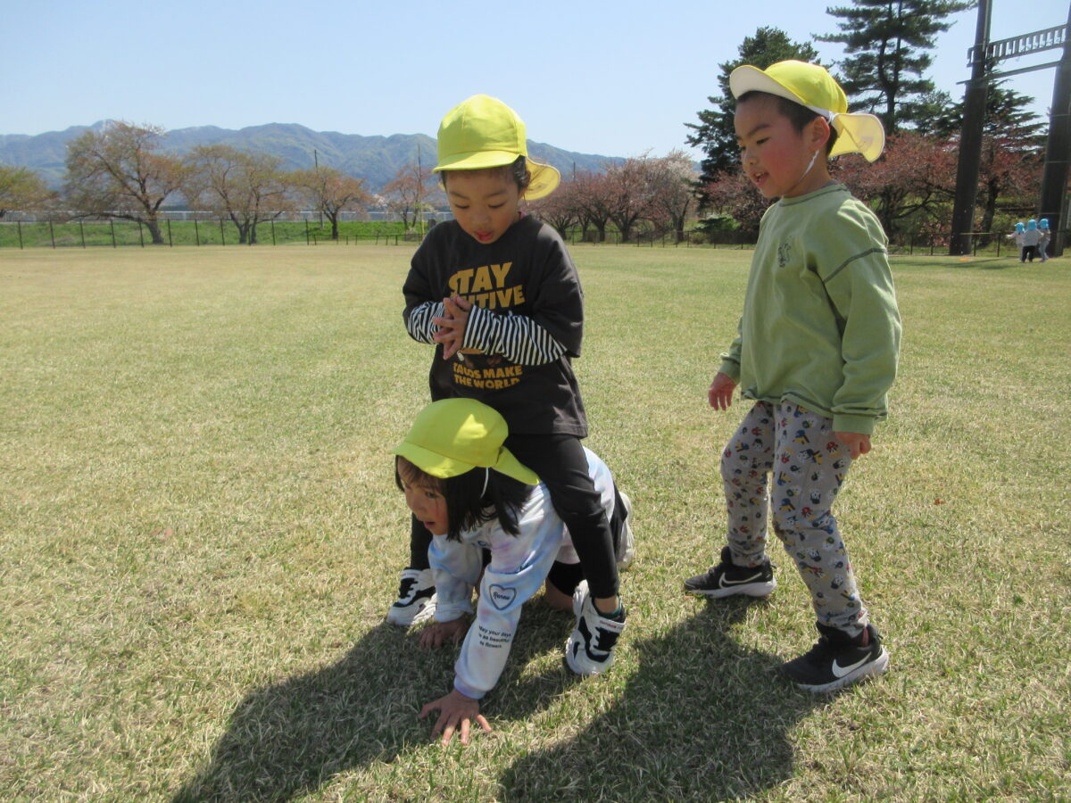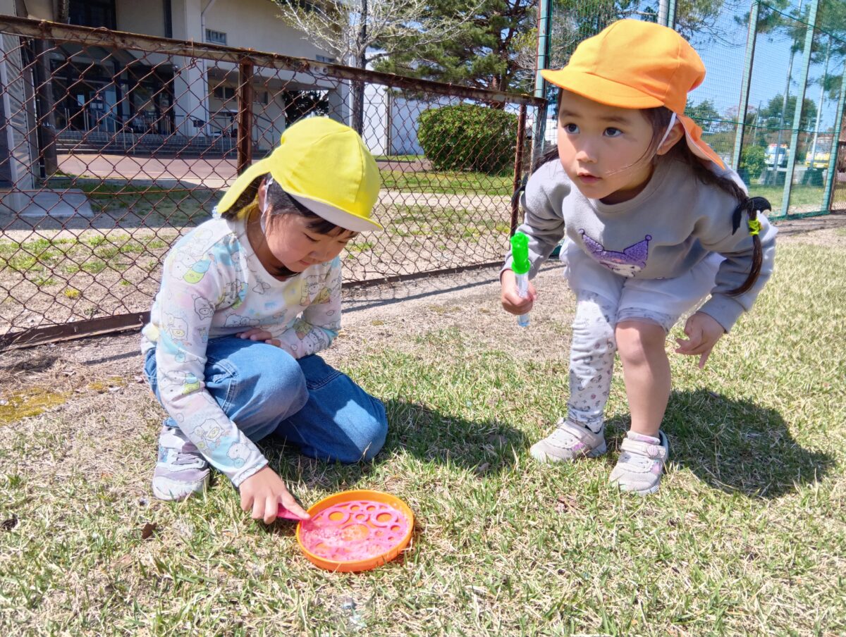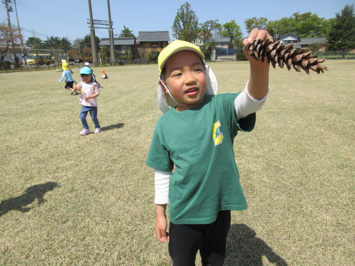 シャボン玉をしたり、大きい松ぼっくりを見つけたり、地蔵鬼ごっこをしたりと