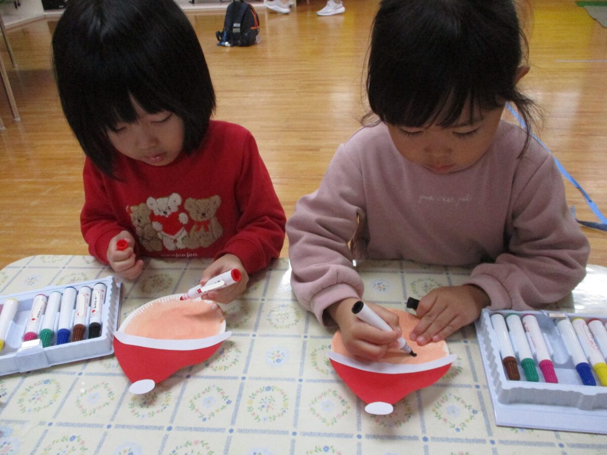 前回絵の具で塗った紙皿に、サンタクロースの帽子を付けました。