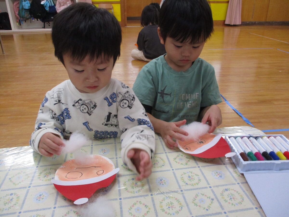 顔を描き、おひげに綿を付けました。綿の感触を楽しんでいましたよ。