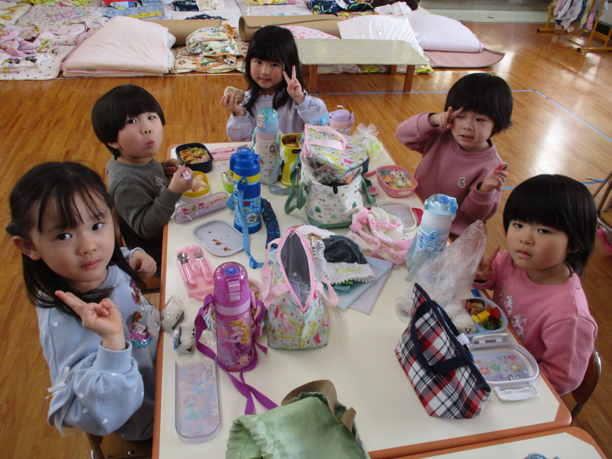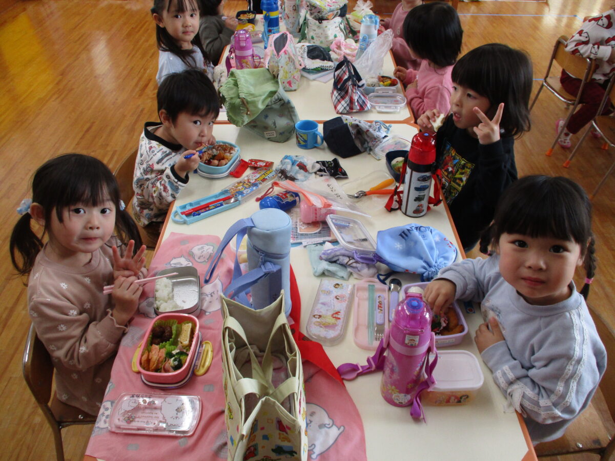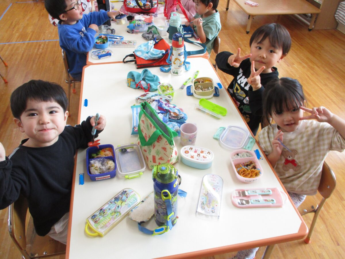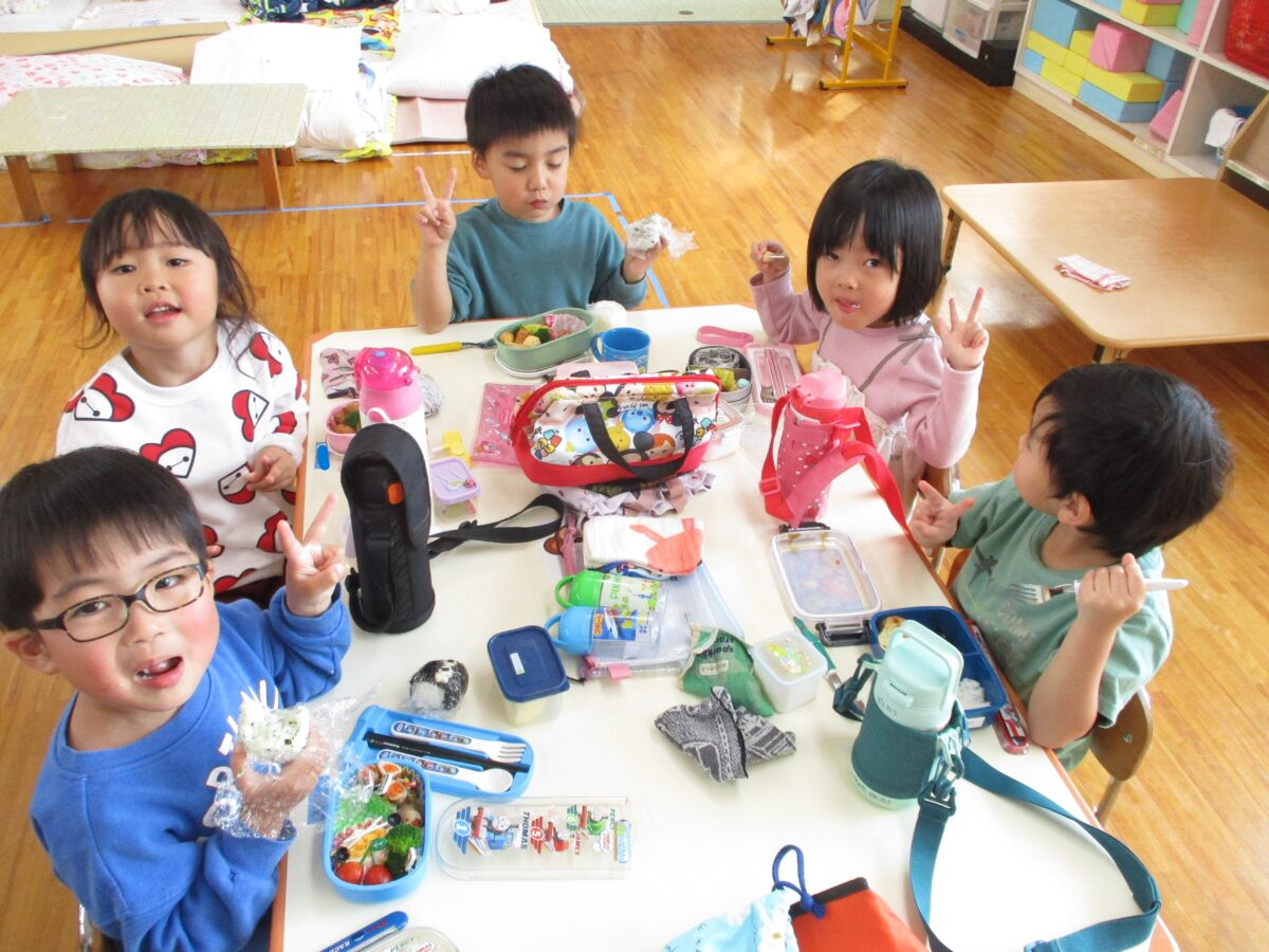 「見て!」と自慢気にお弁当を見せてくれた子ども達です。おいしくいただきました!!