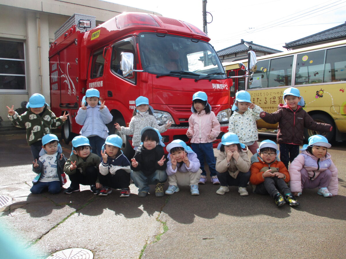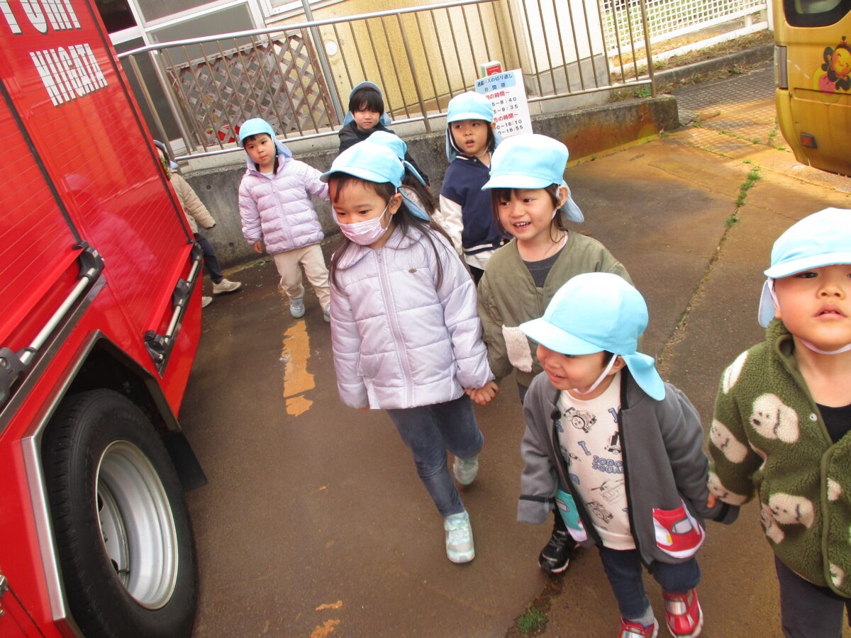 先日の避難訓練では消防署の方が来園し、紙芝居や防災映画を見せてもらいました。終了後には消防車を近くで見学もさせてもらいました!