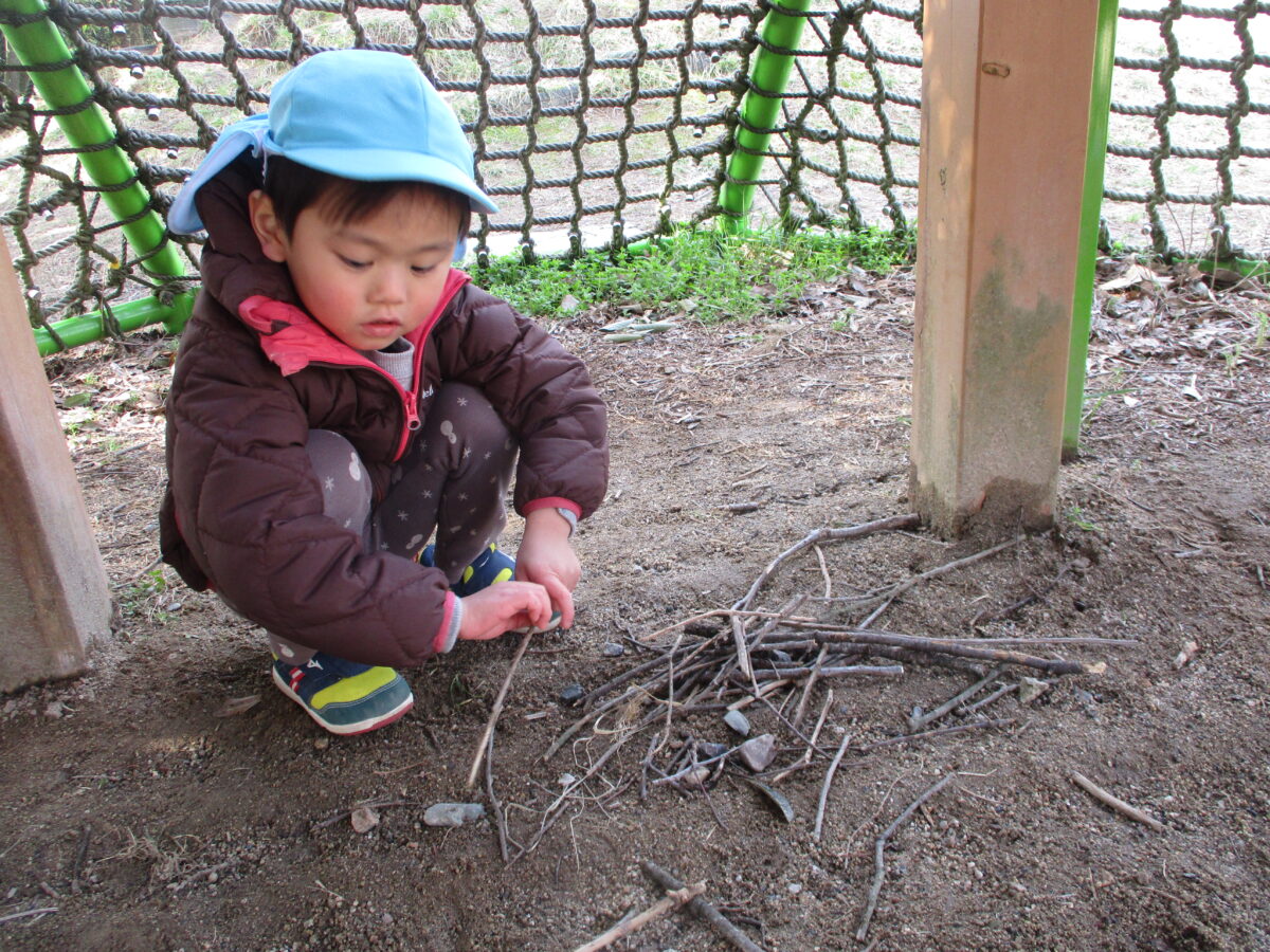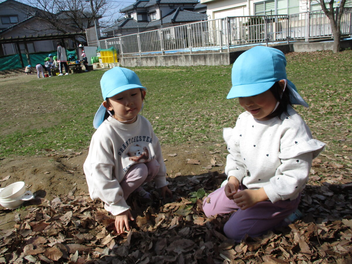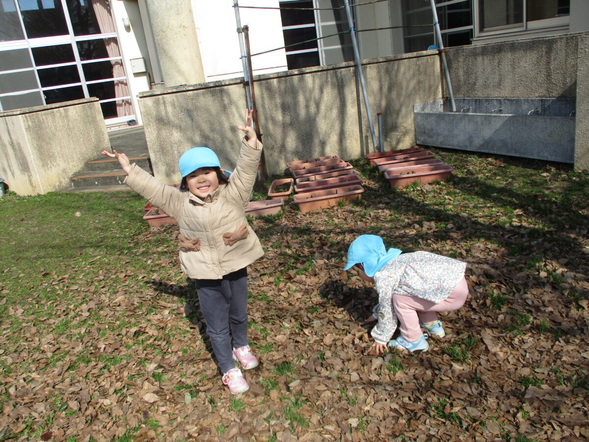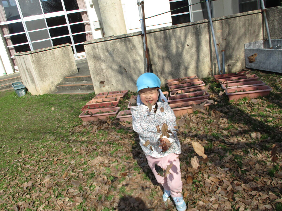 落ち葉を投げたり、集めてベッドを作ったり、好きな遊びを見つけて楽しんでいます。