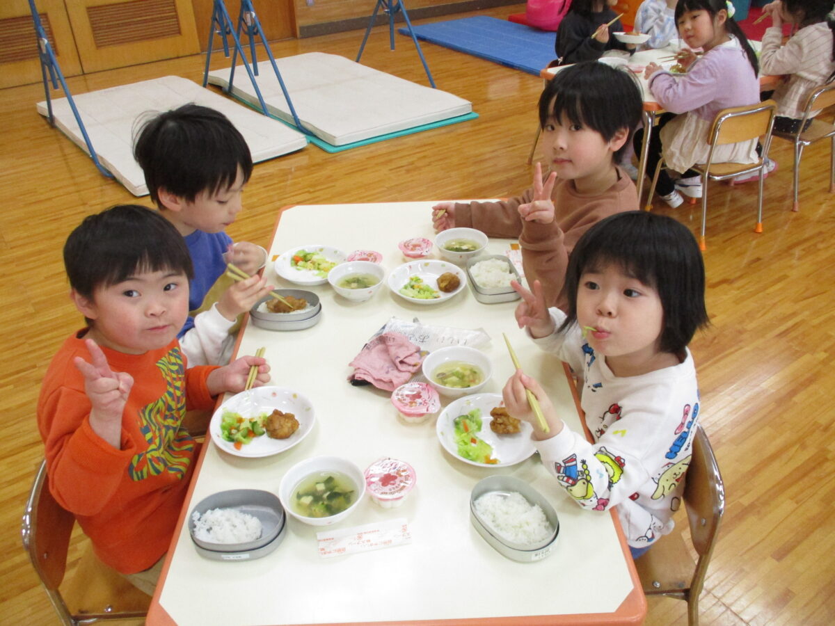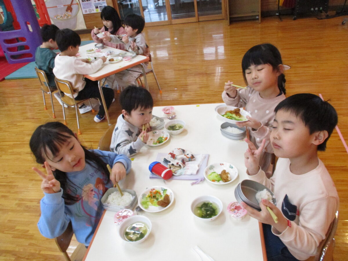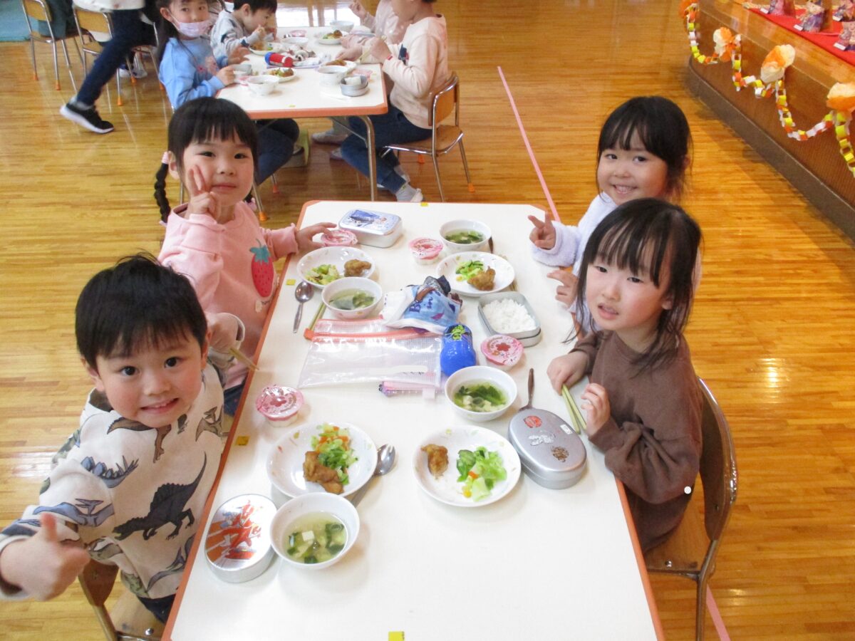給食ははな・ほし・つき組で会食をしました。いつもと違う雰囲気を楽しみながら、おいしくいただきました!