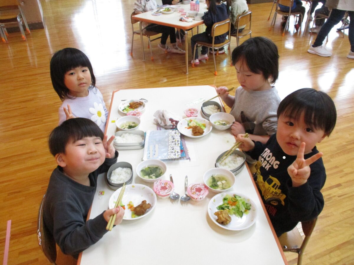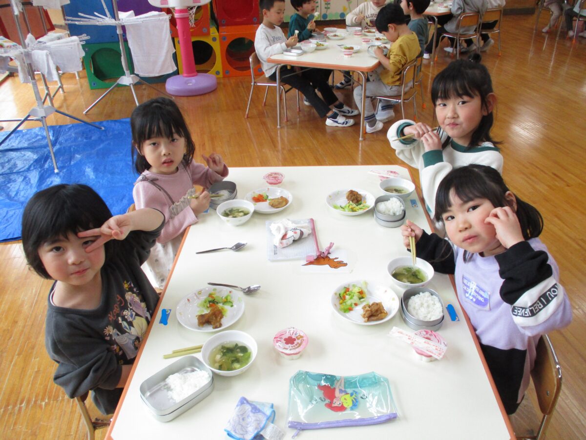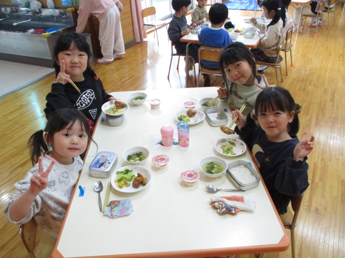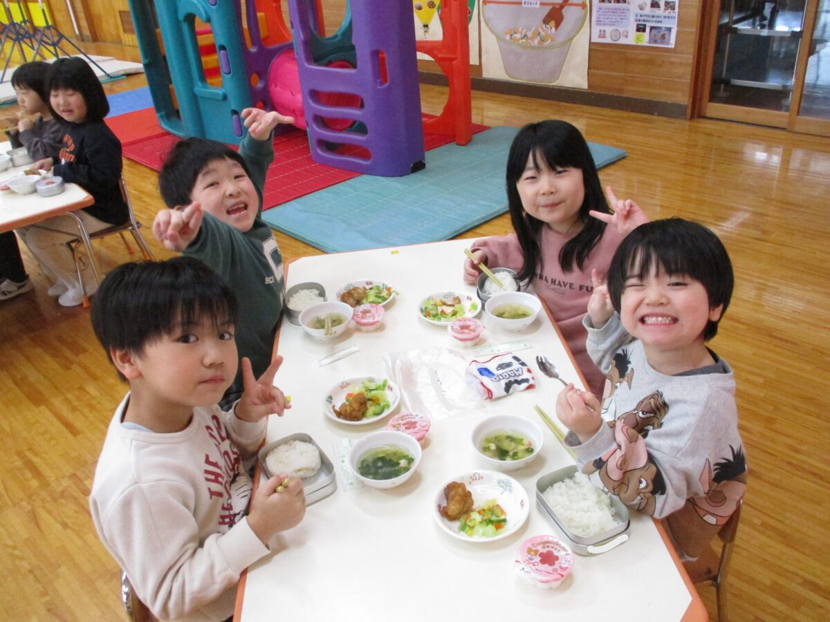 給食ははな・ほし・つき組で会食をしました。いつもと違う雰囲気を楽しみながら、おいしくいただきました!
