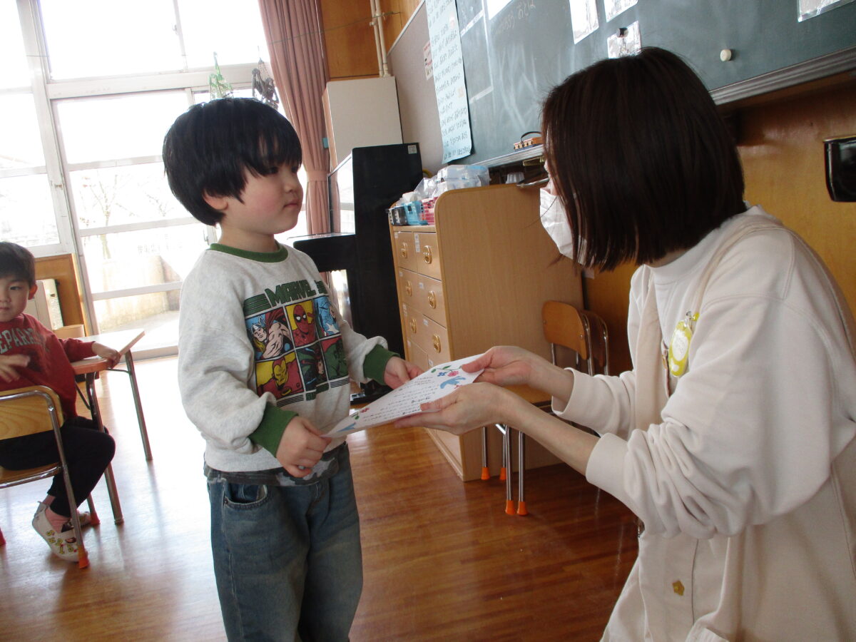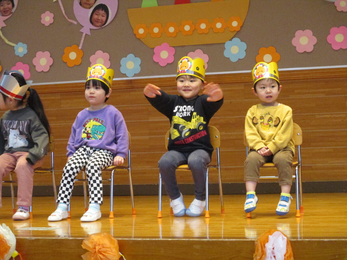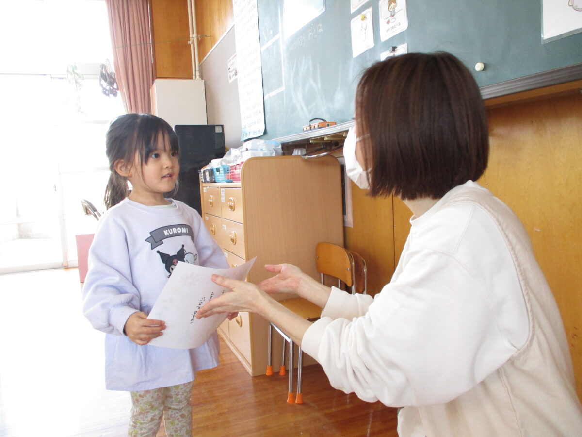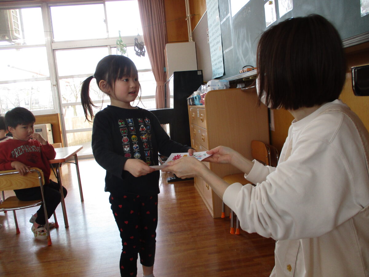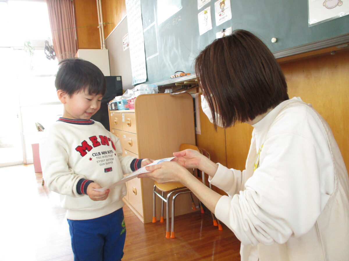 園長先生から一人ひとり賞状をもらいました。昨日のつき組さんの卒園式練習を見たばかりなので、返事や賞状のもらい方を意識している子もいました。