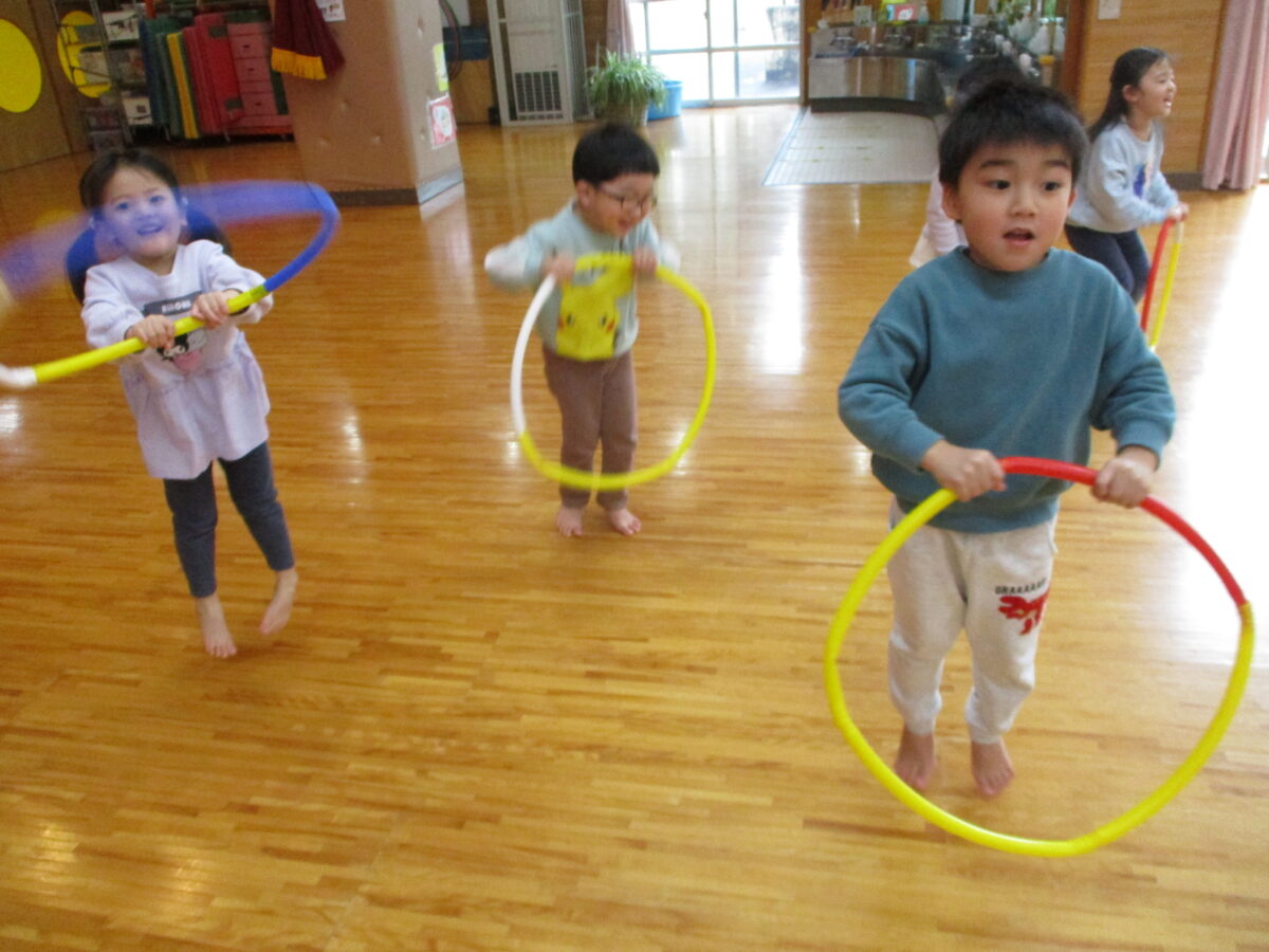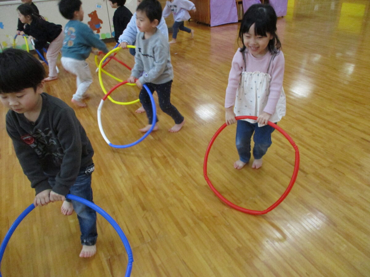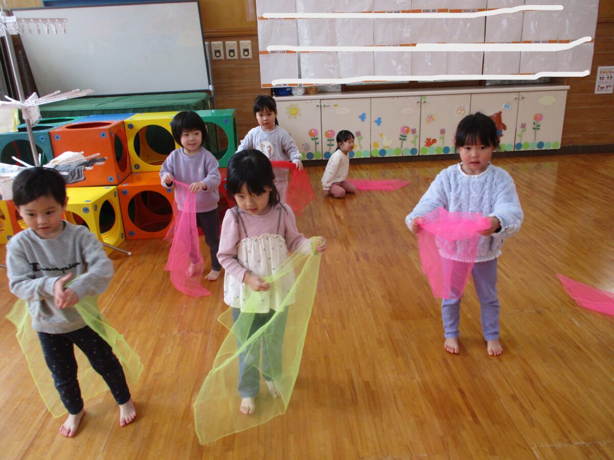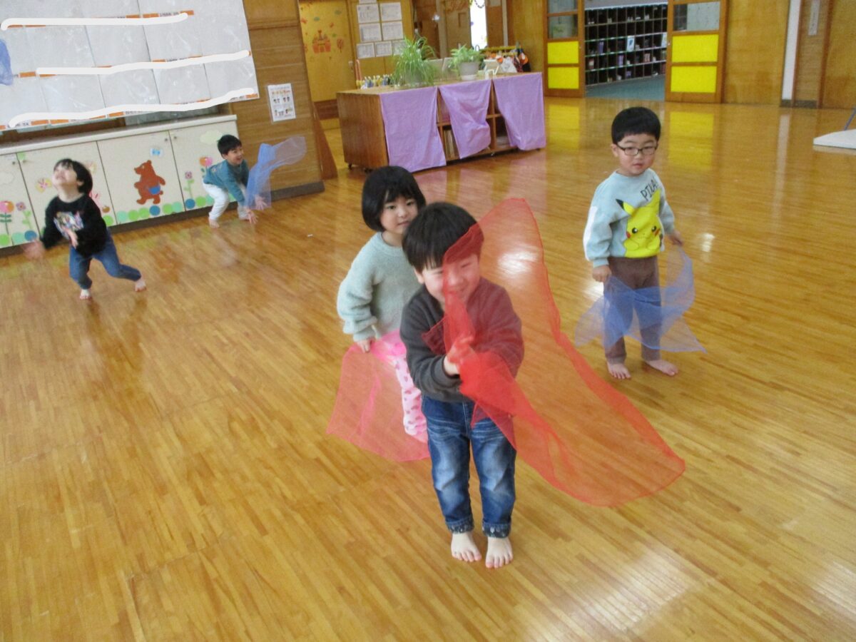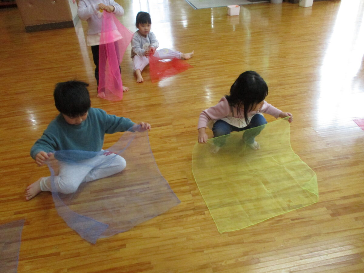 スカーフを持って走り、投げたりキャッチしたりしました。使った後は自分で畳んで返しました。