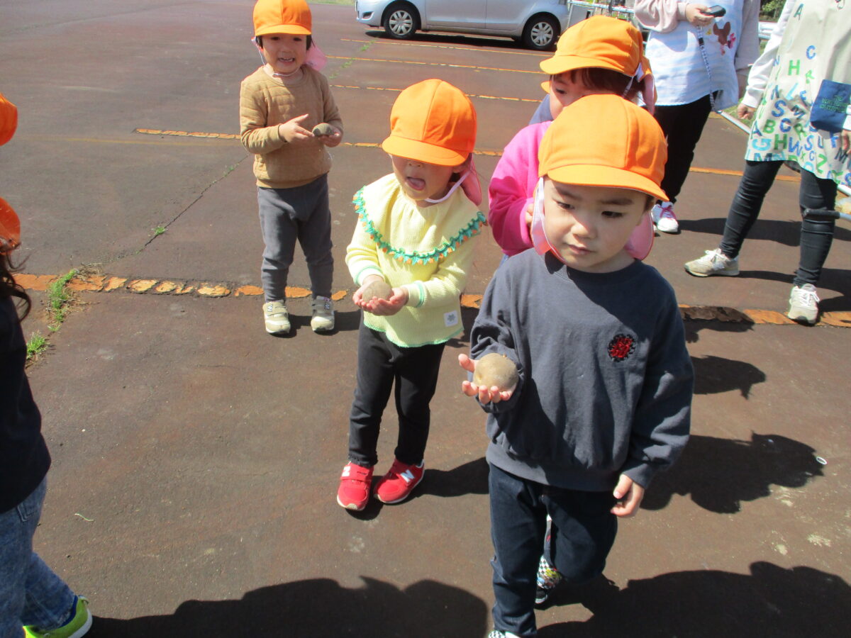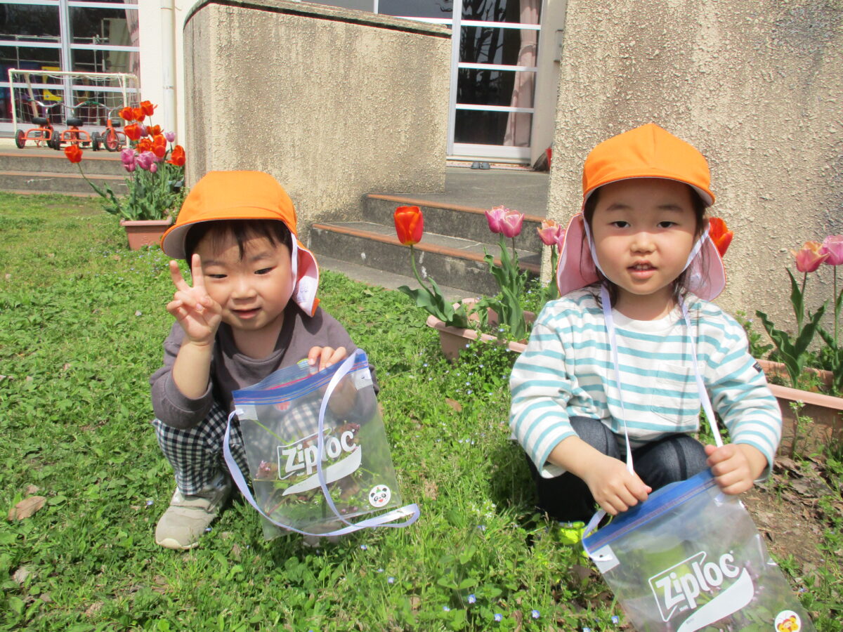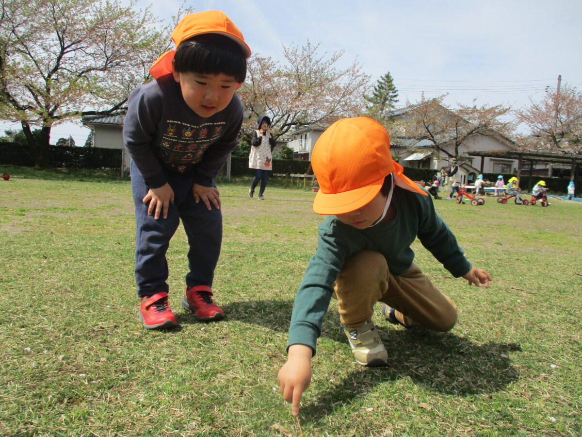 園庭でも春を探して楽しんでいます。お花を摘んだり虫を探したり、たくさんの春を見つけているはなぐみさんです。