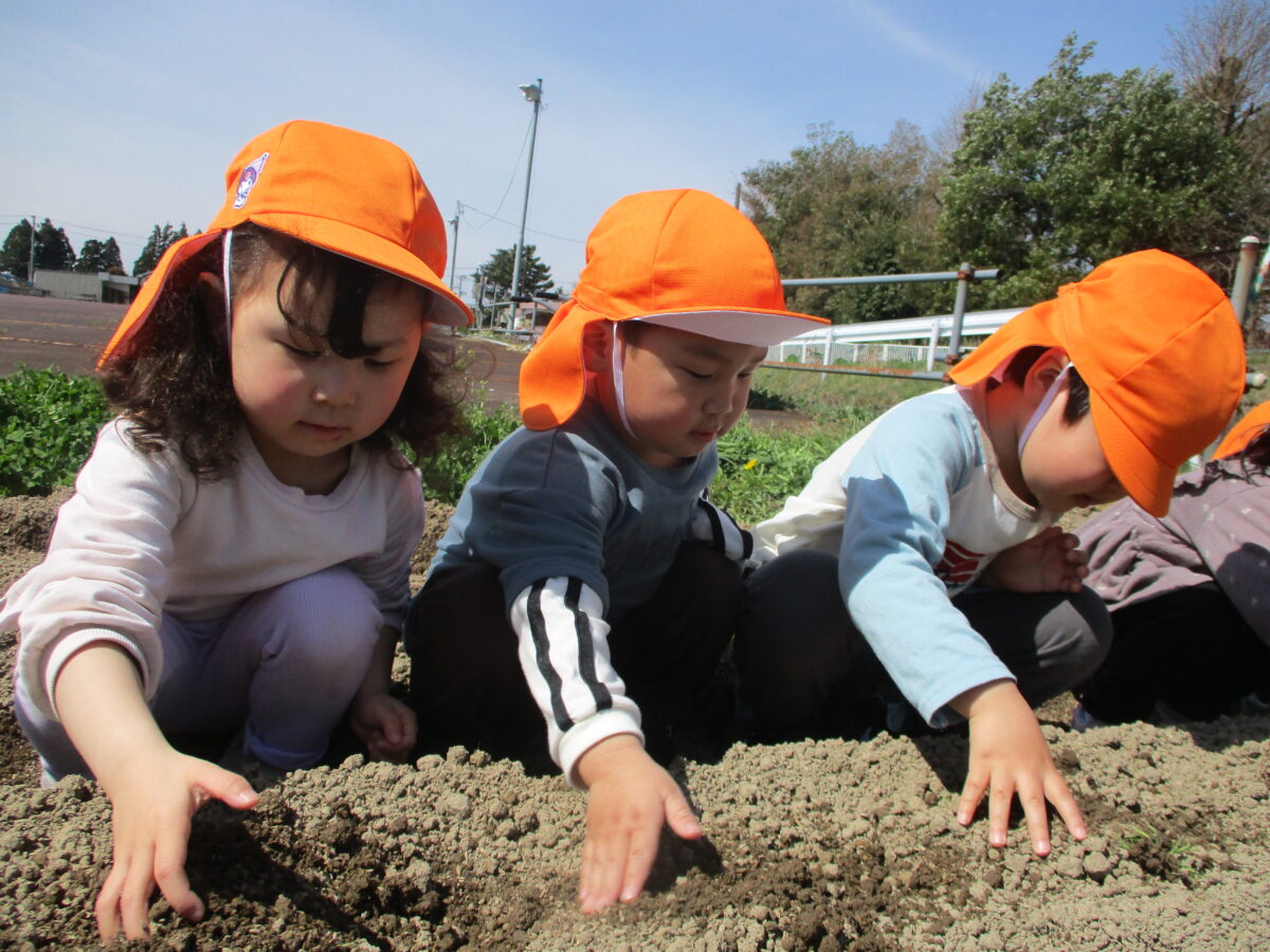 また、先日はじゃがいも植えを楽しみました。松村さんのお話をよく聞いて、種芋を丁寧に植えていました。生長が楽しみですね。