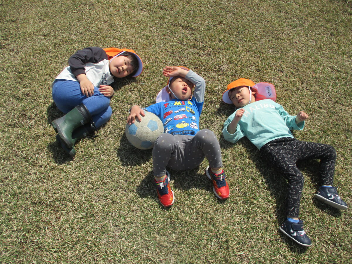 ボールを一生懸命追いかけるお友達。広い球場なのでたくさんたくさん走っていました。思わず寝転がって、気持ち良さそうですね。