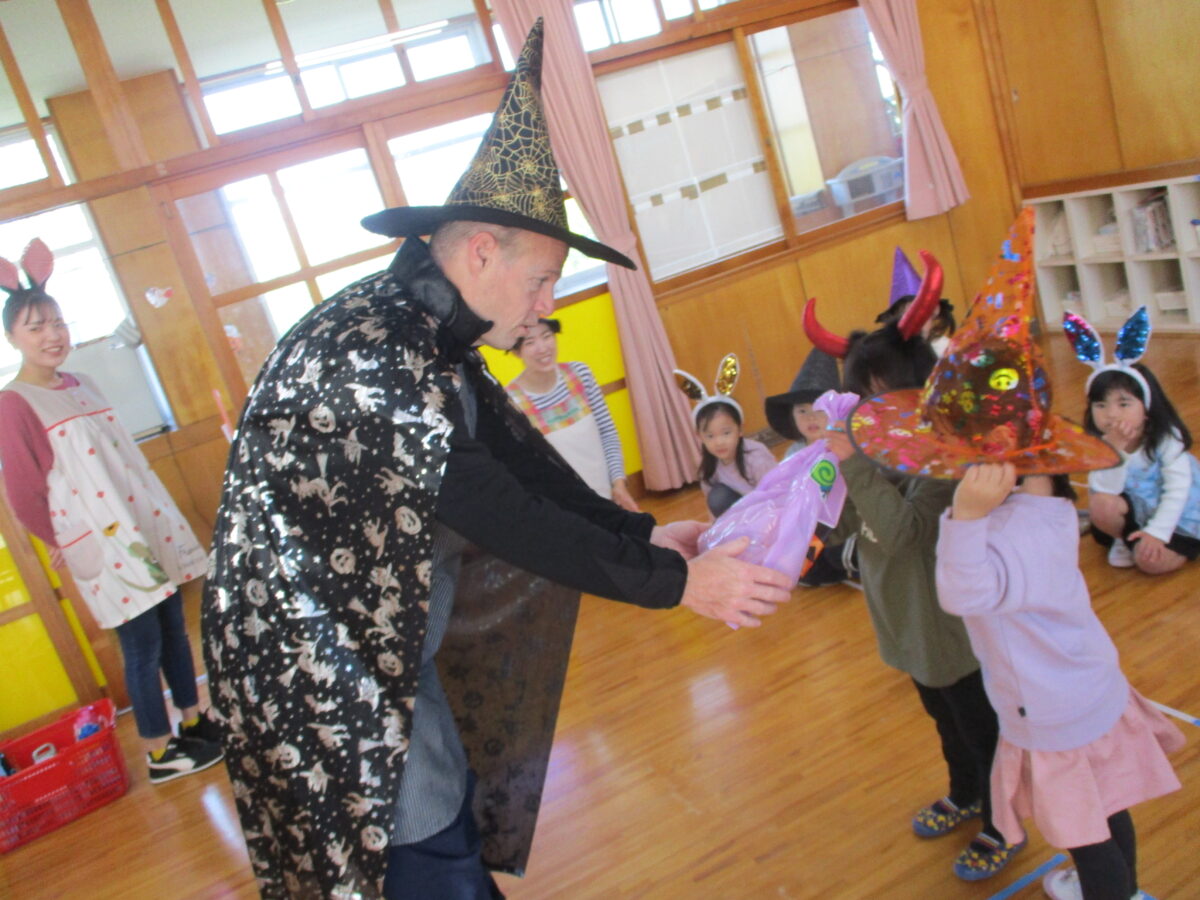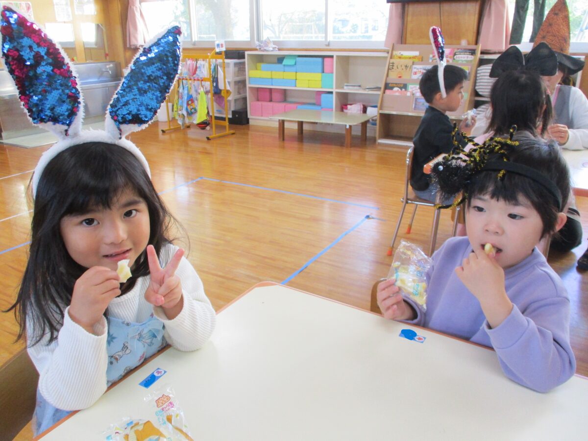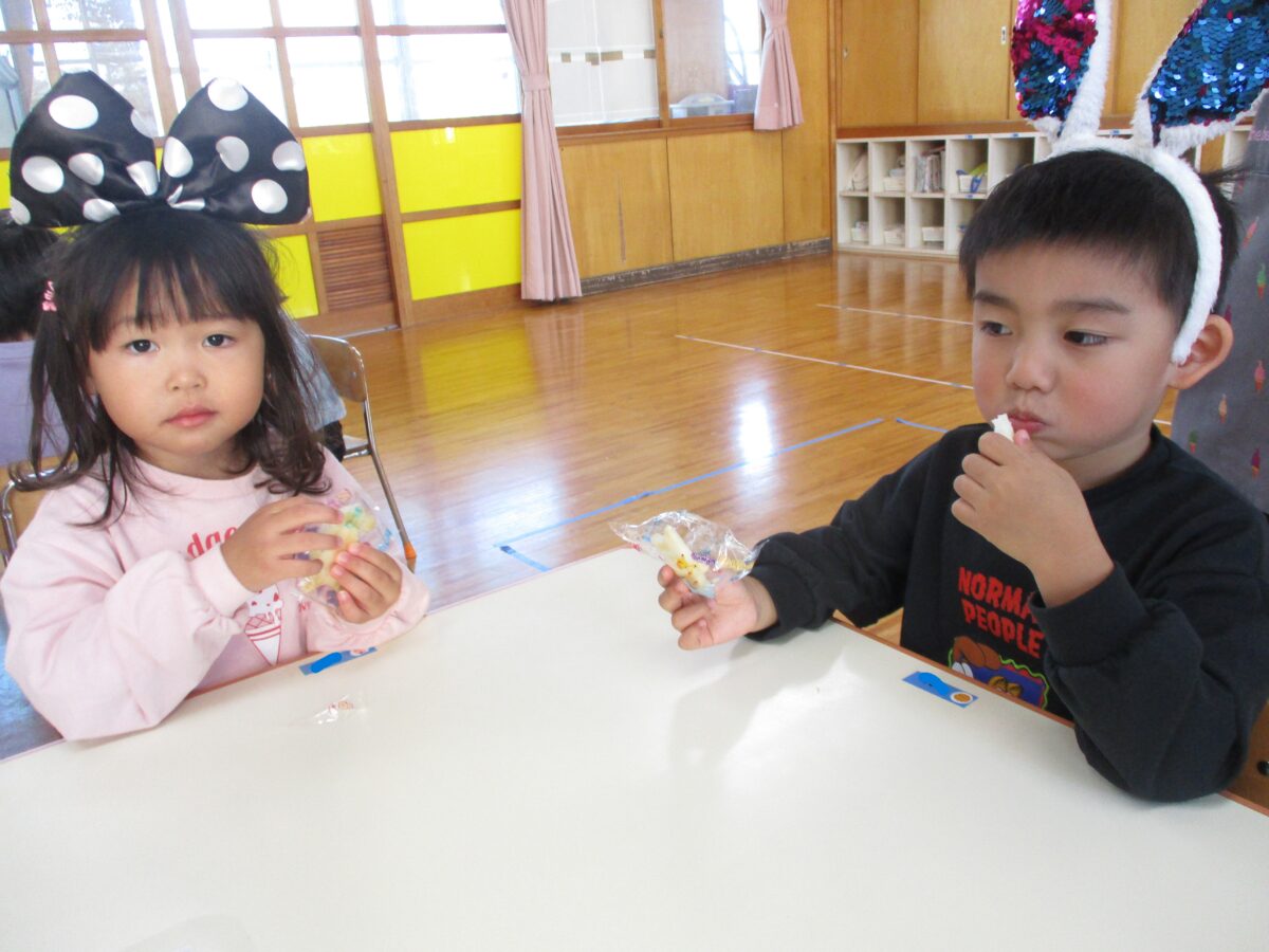 みんなで「トリックオアトリート!」と言って、お当番さんが代表でお菓子をもらいました。特別感を味わいながら、みんなが喜んで食べていました!