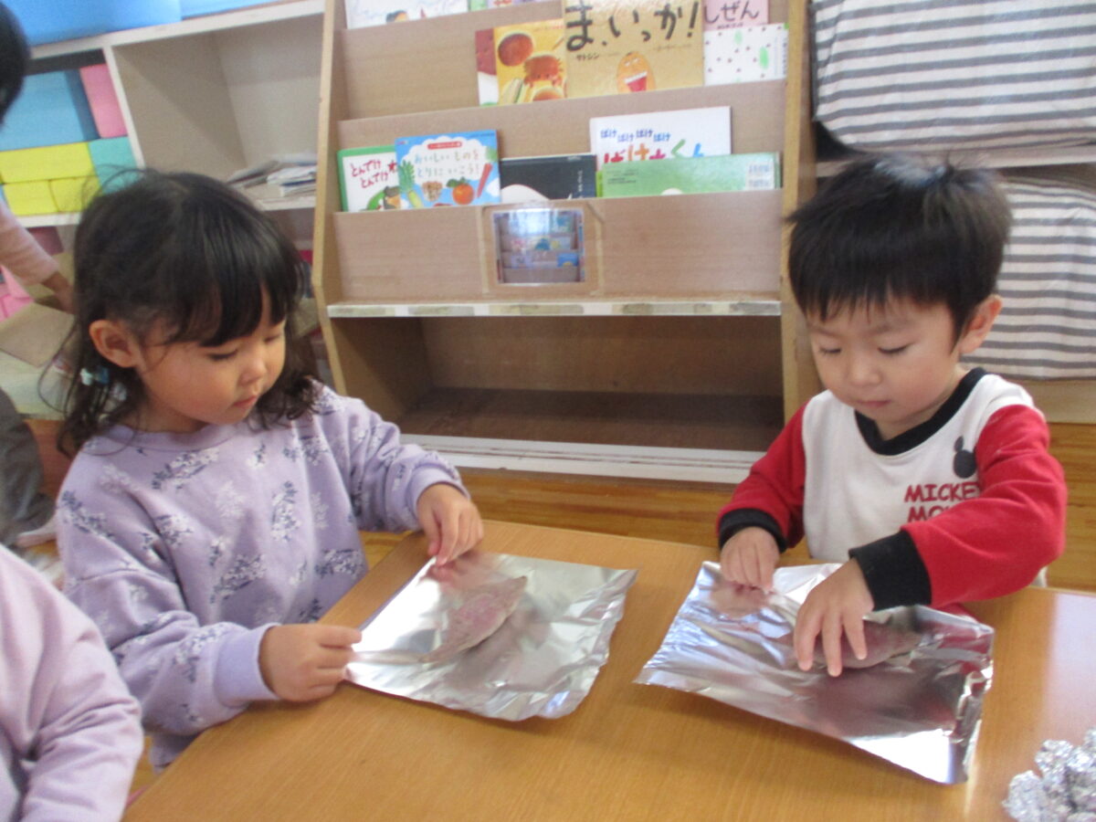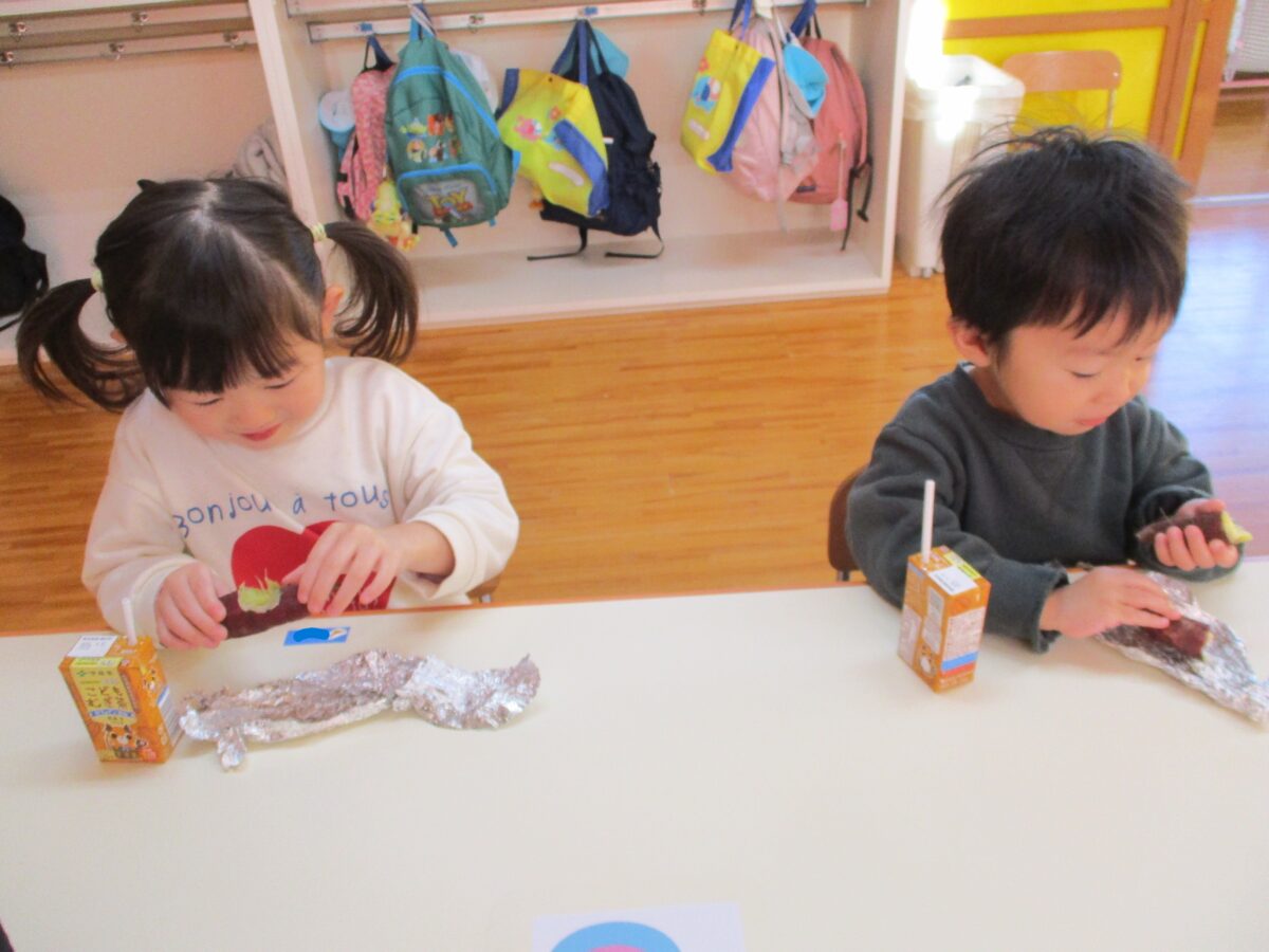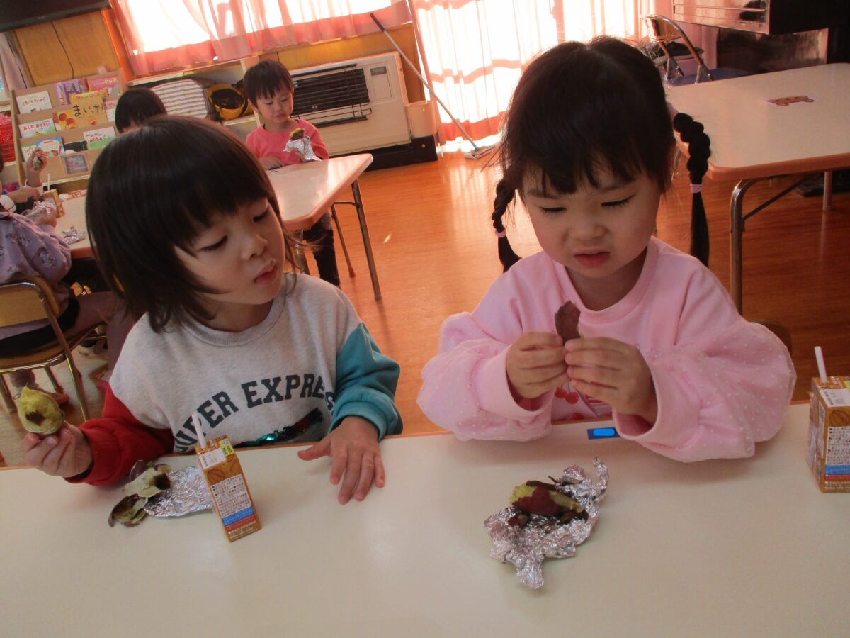 遊戯室で遊んでいる時から焼き芋の良い匂いがしてきて、「早く食べたい!」と心待ちにしていた子ども達でした。