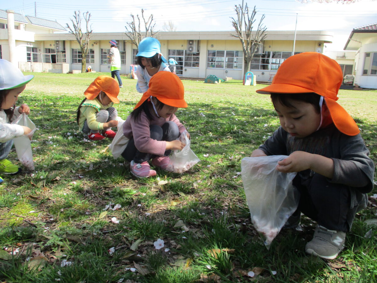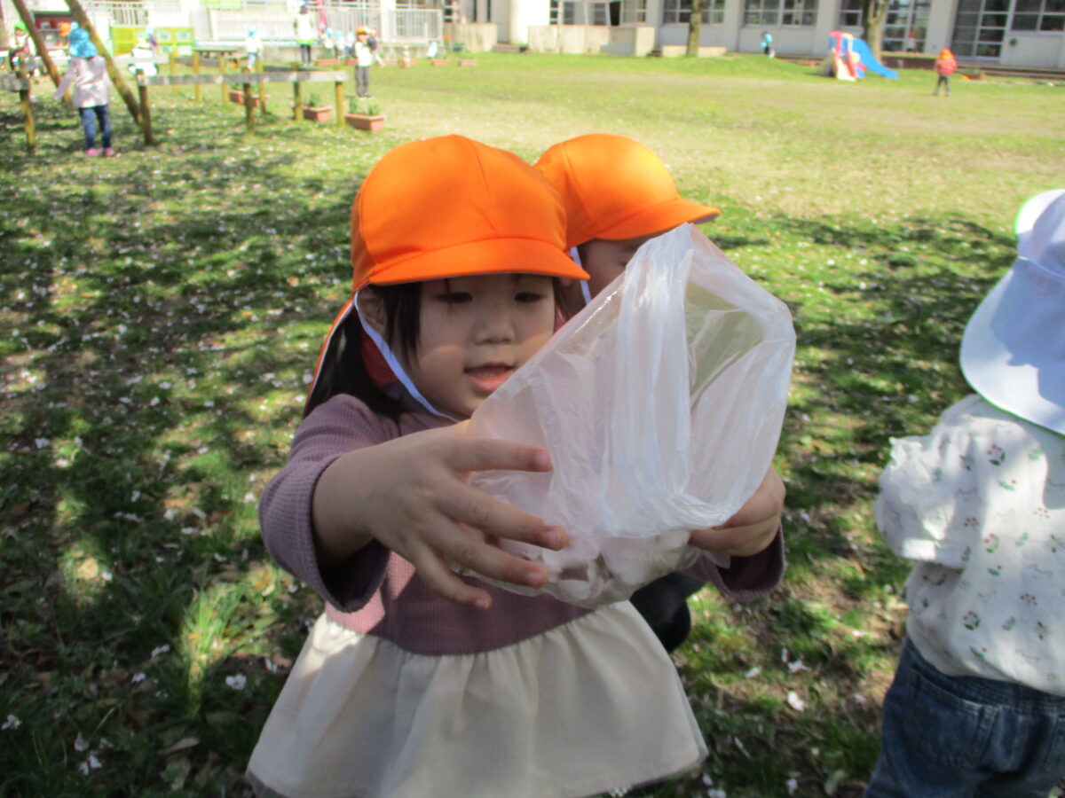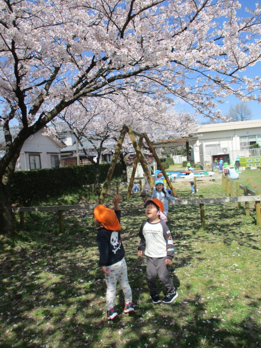 園庭では砂遊びをしたり、追いかけっこをしたり、綺麗な桜が舞っていると「きれ~い!」と言いながらキャッチをしようとしたり、落ちている桜の花びらを袋に集めている子もいます!